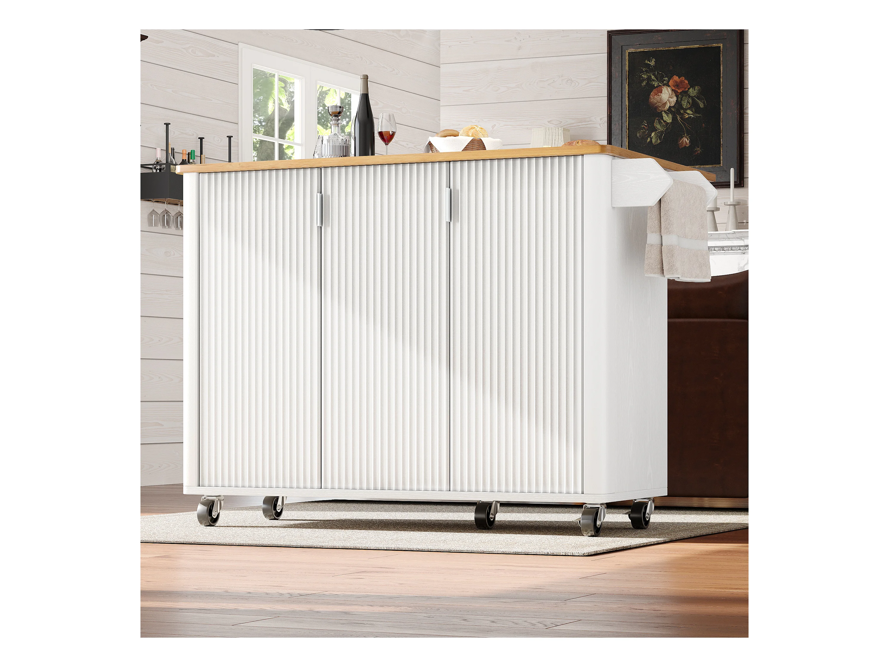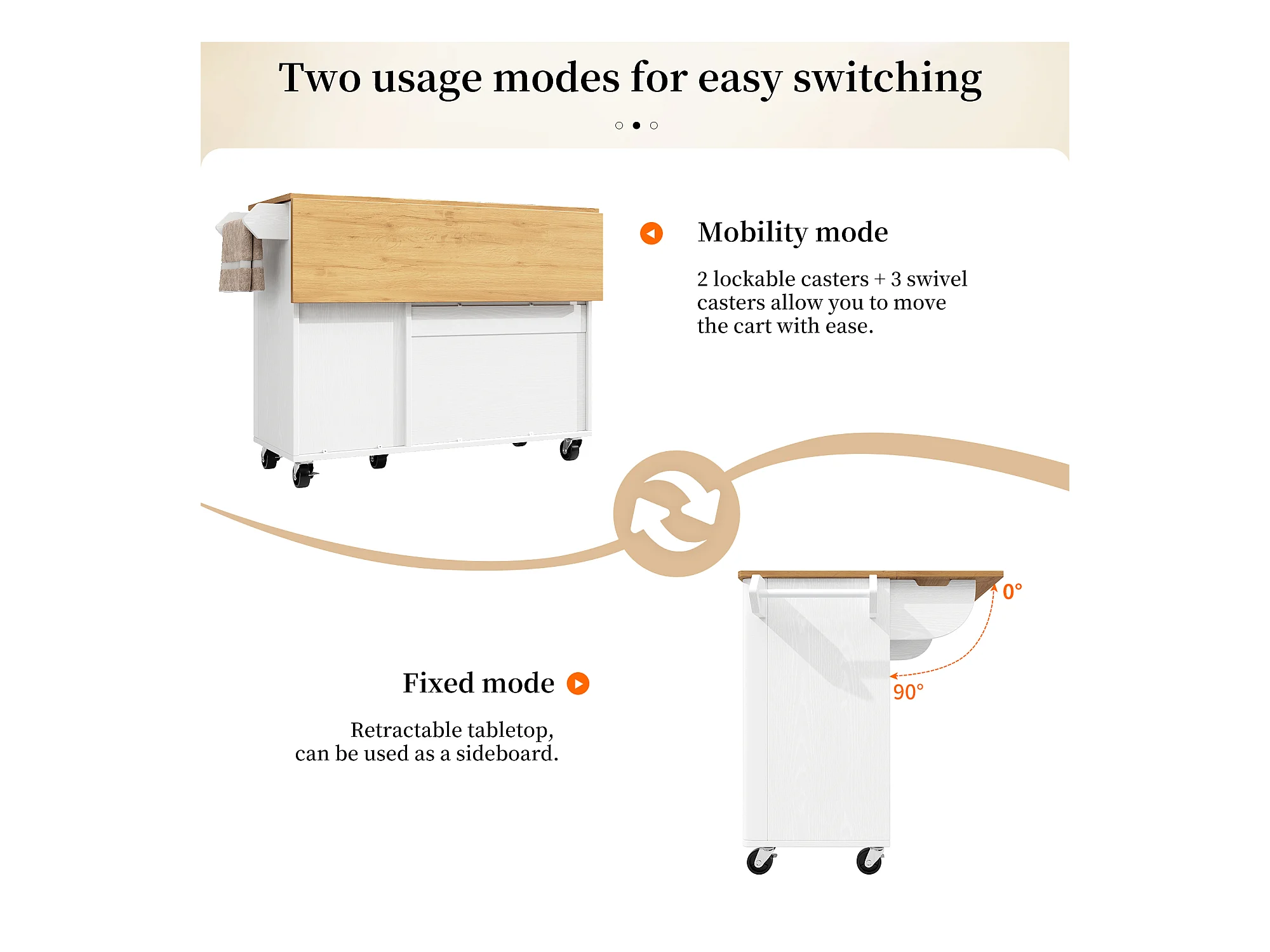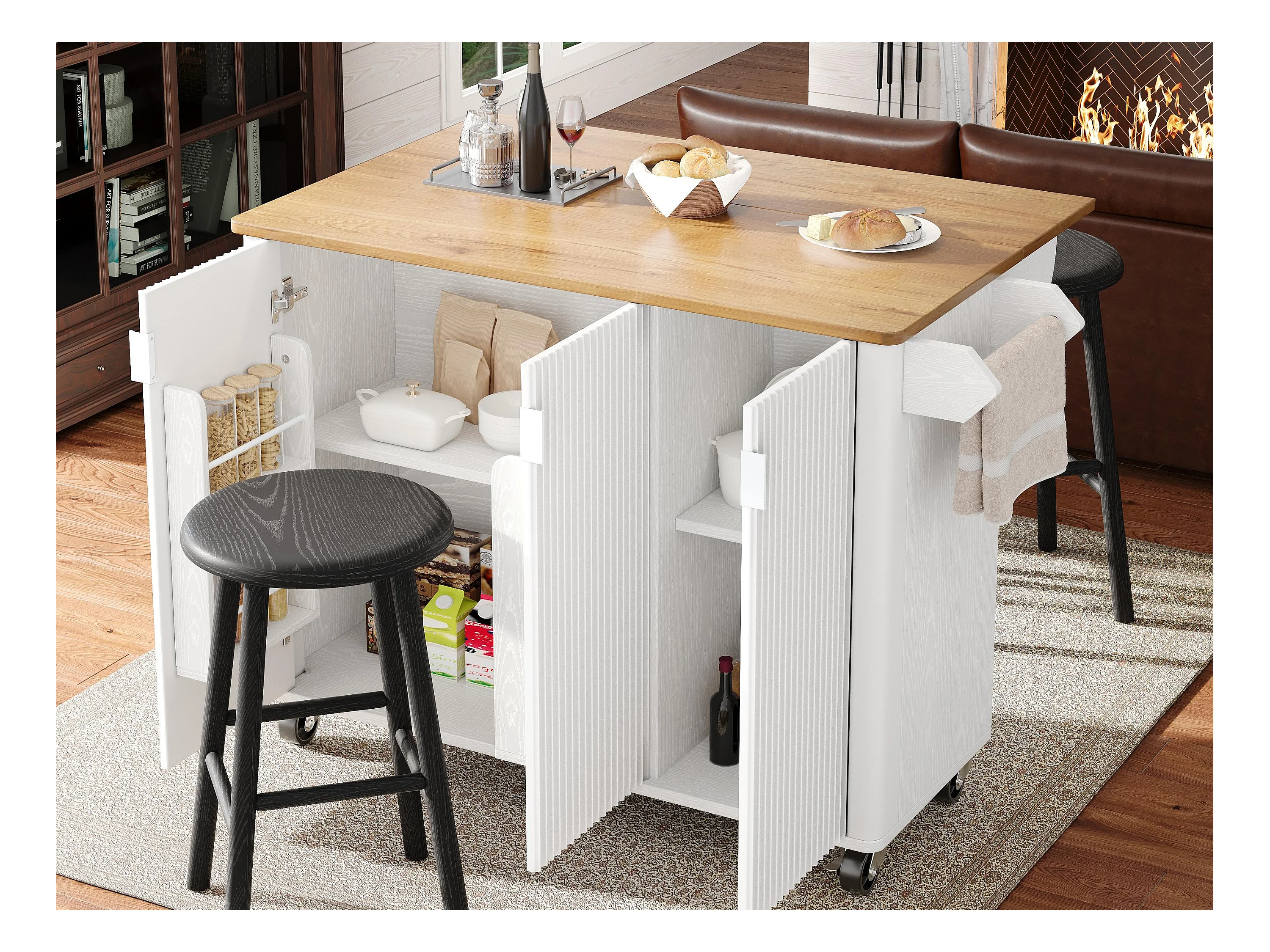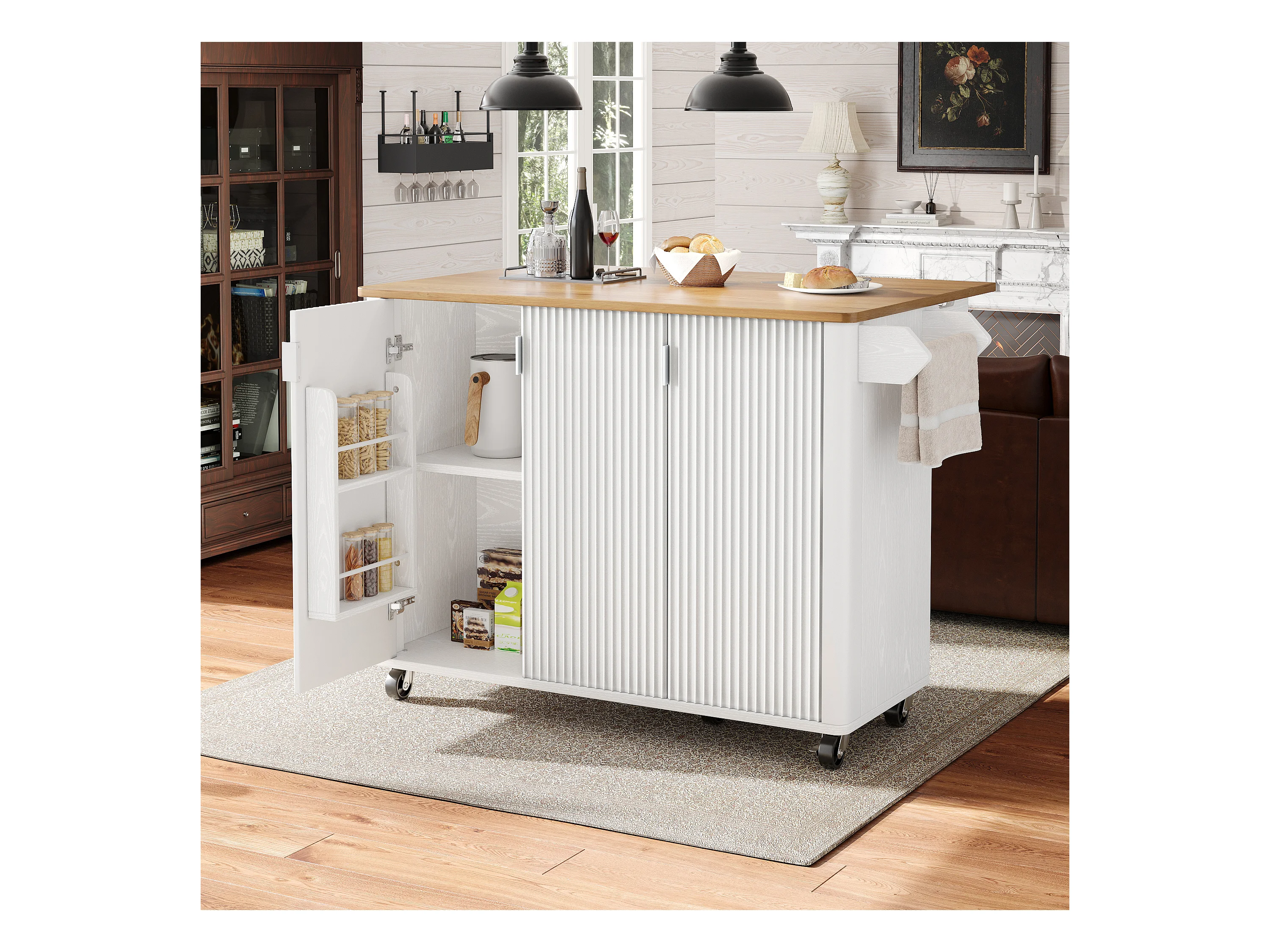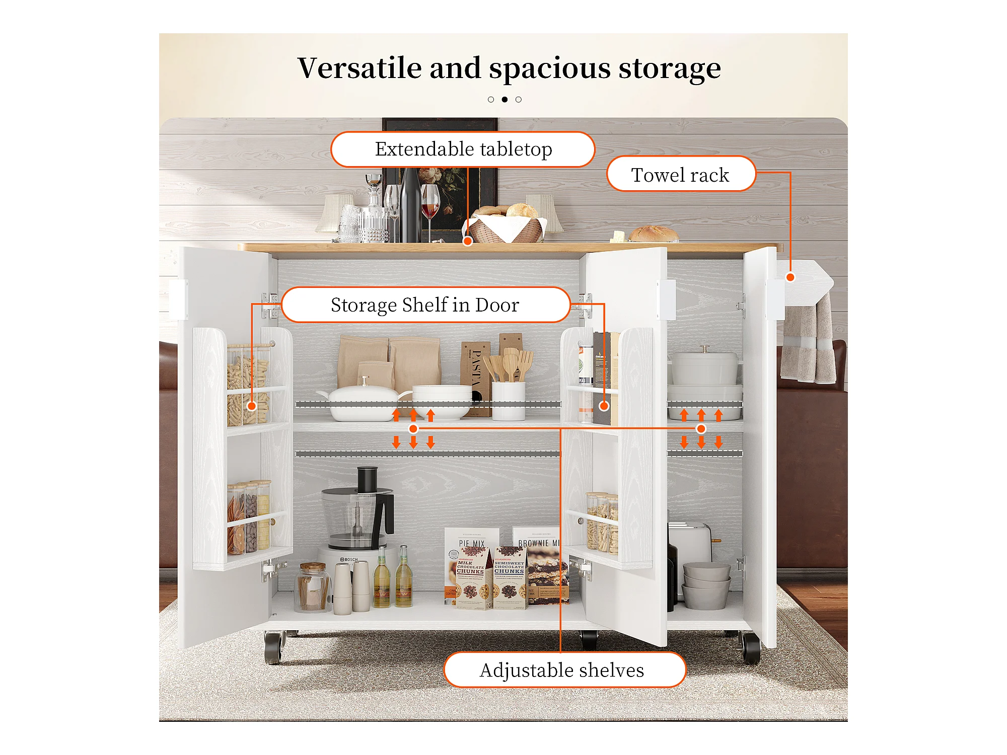 Ilot central de cuisine moderne 130x45x92cm - 3 portes - avec étagère à épices - plateau extensible - avec roulettes - Blanc