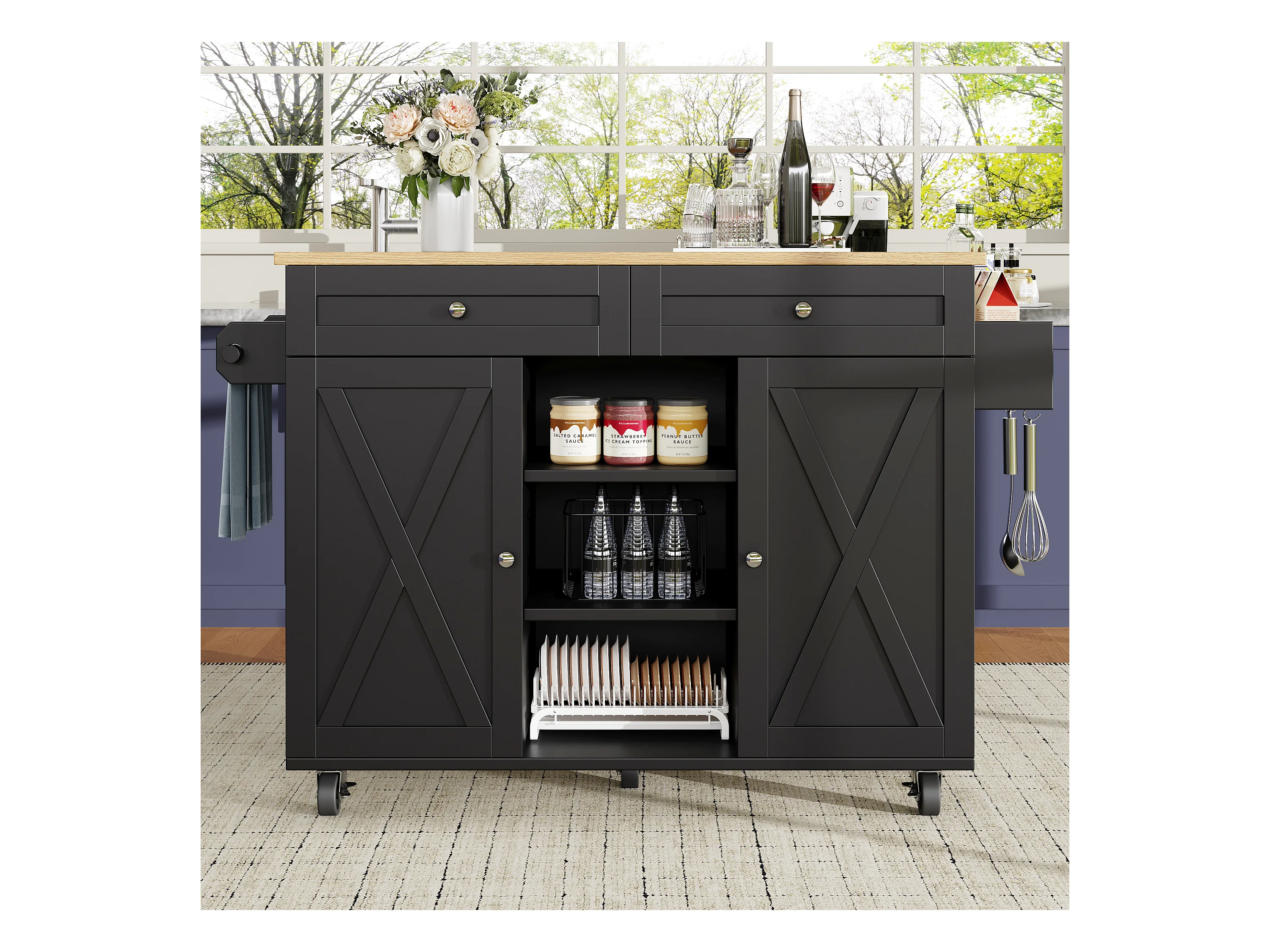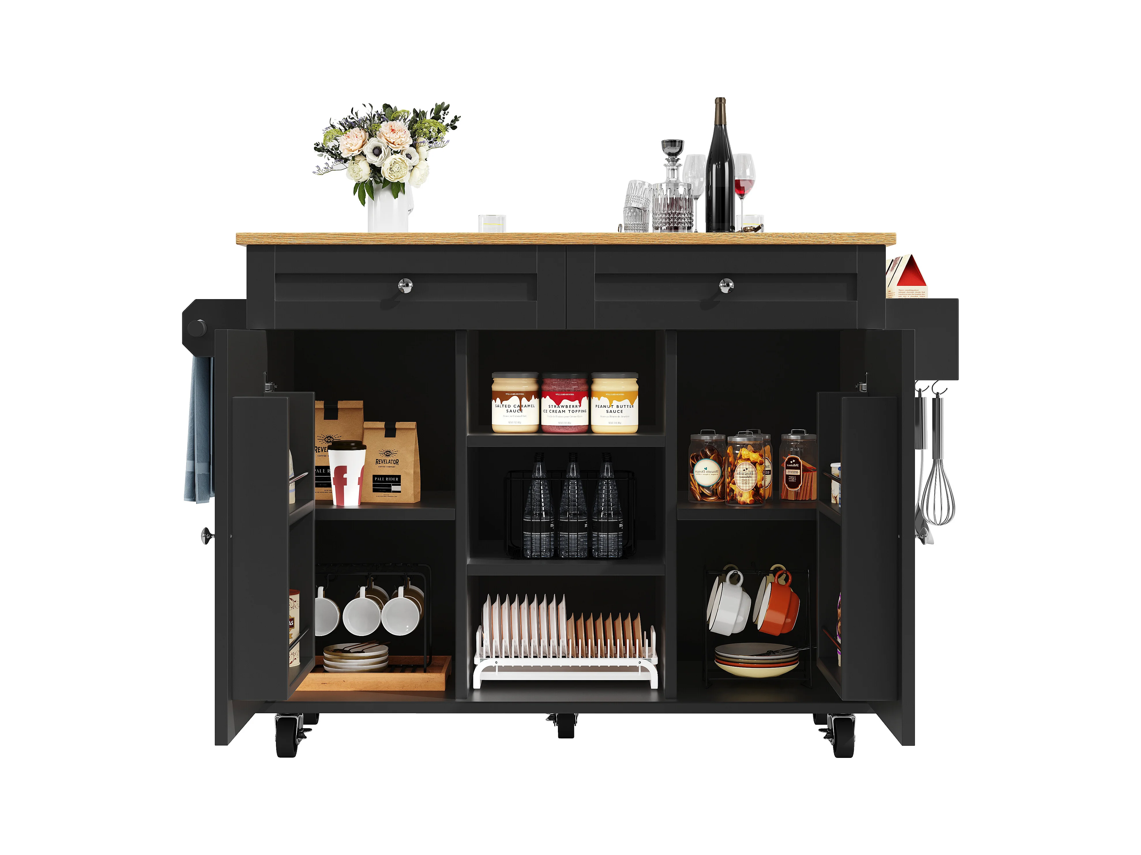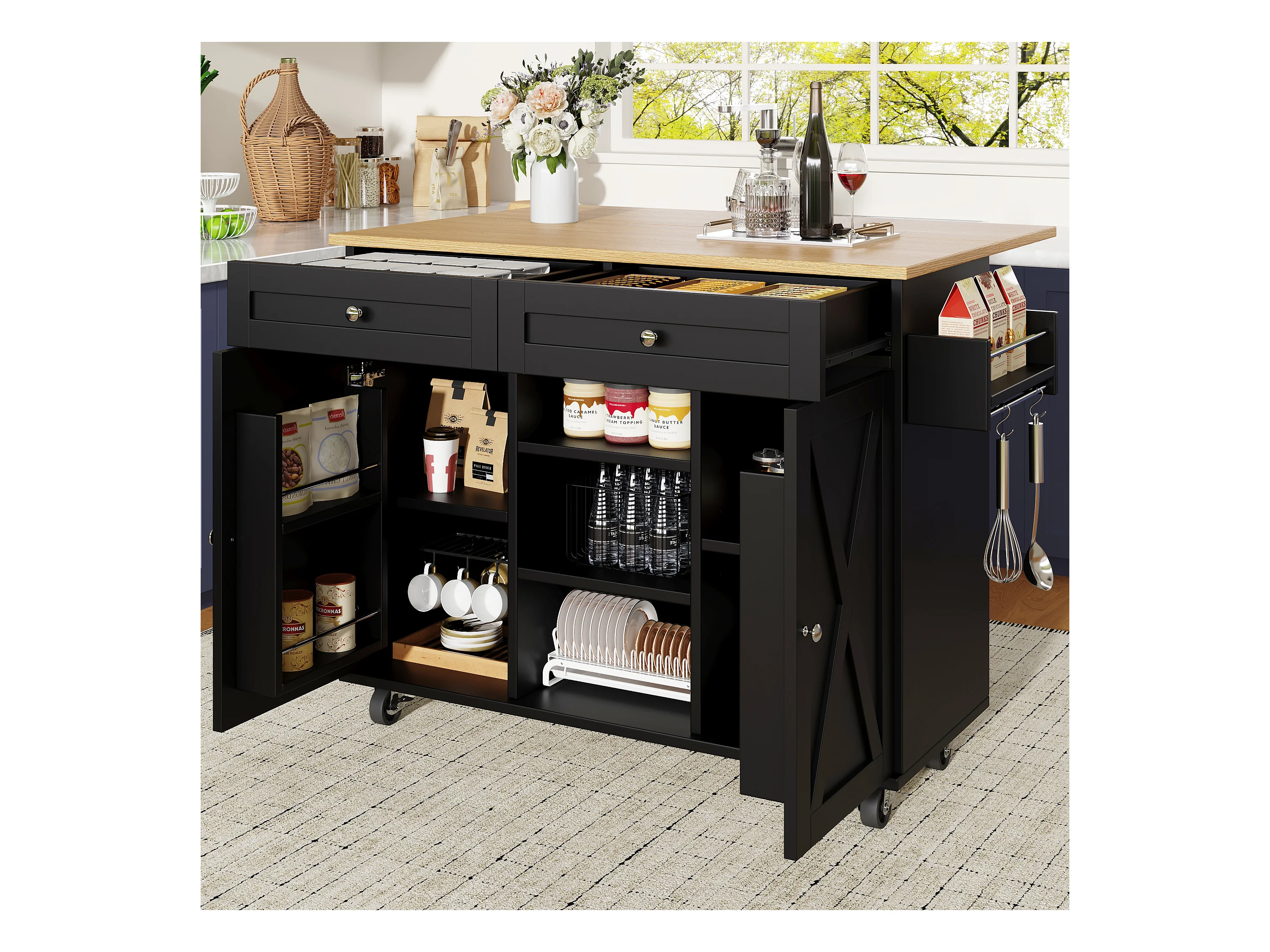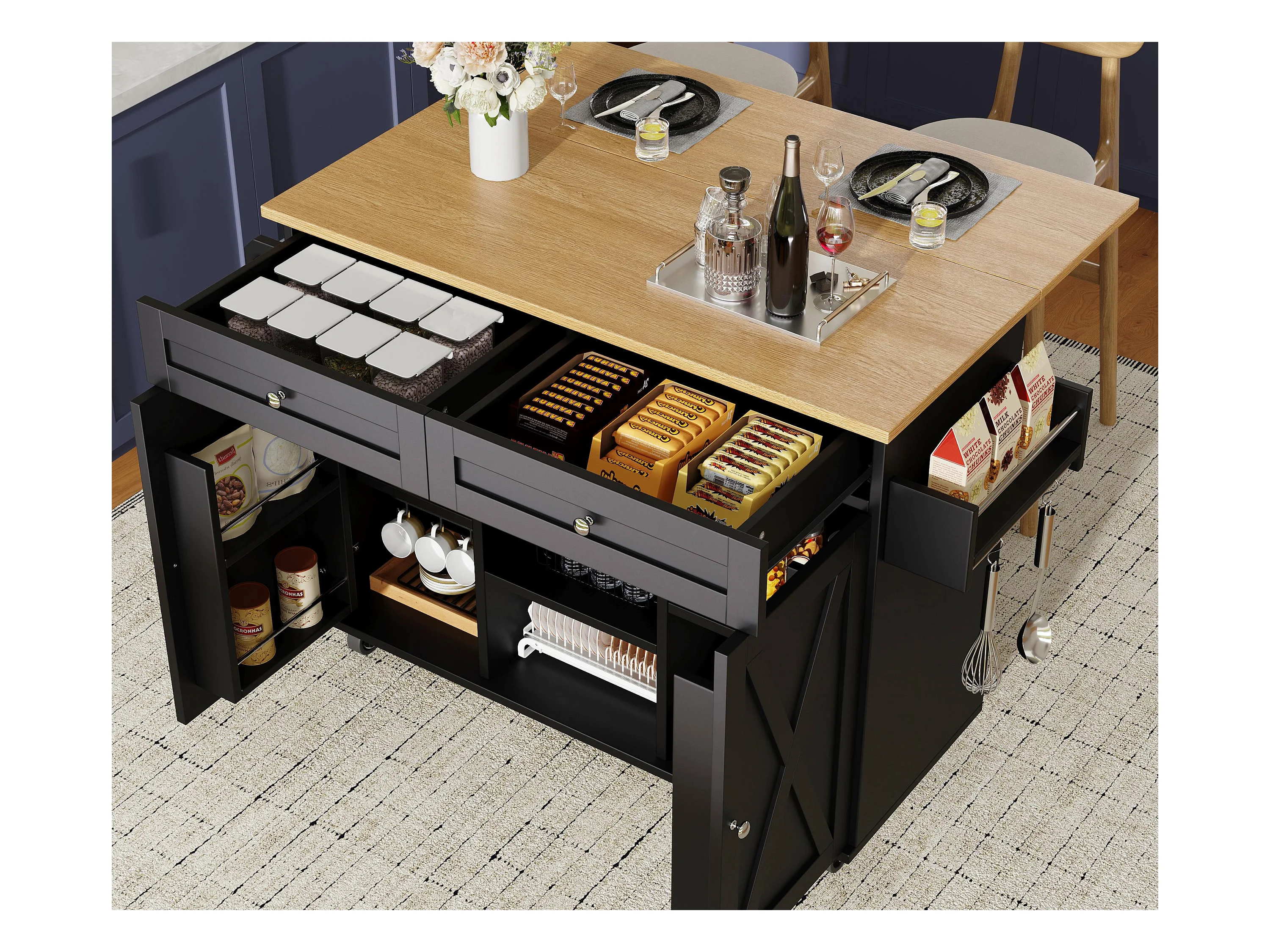 Ilot central de cuisine moderne 134x45.2x89cm - 2 tiroirs et 2 portes - plateau extensible - avec roulettes - noir