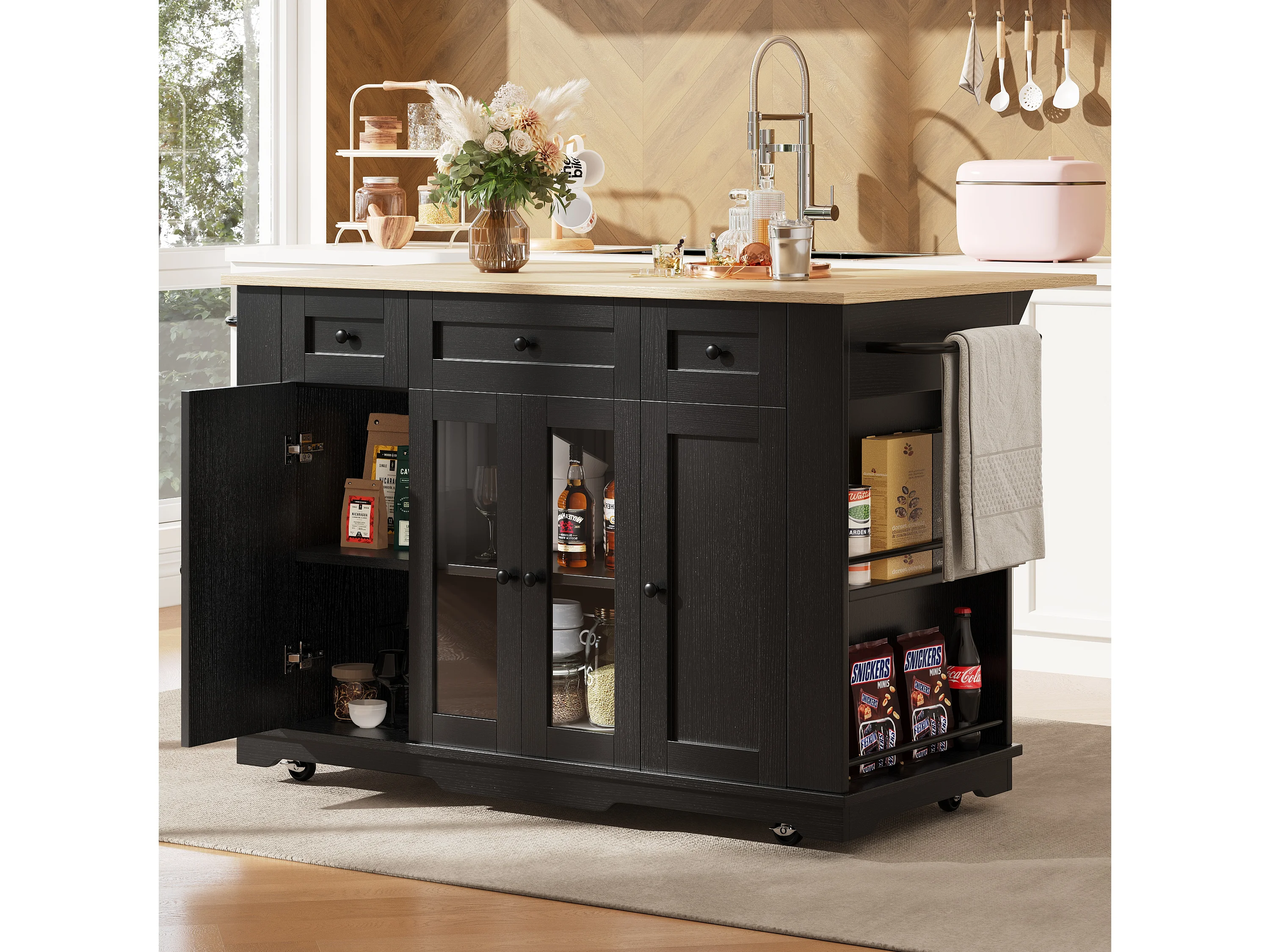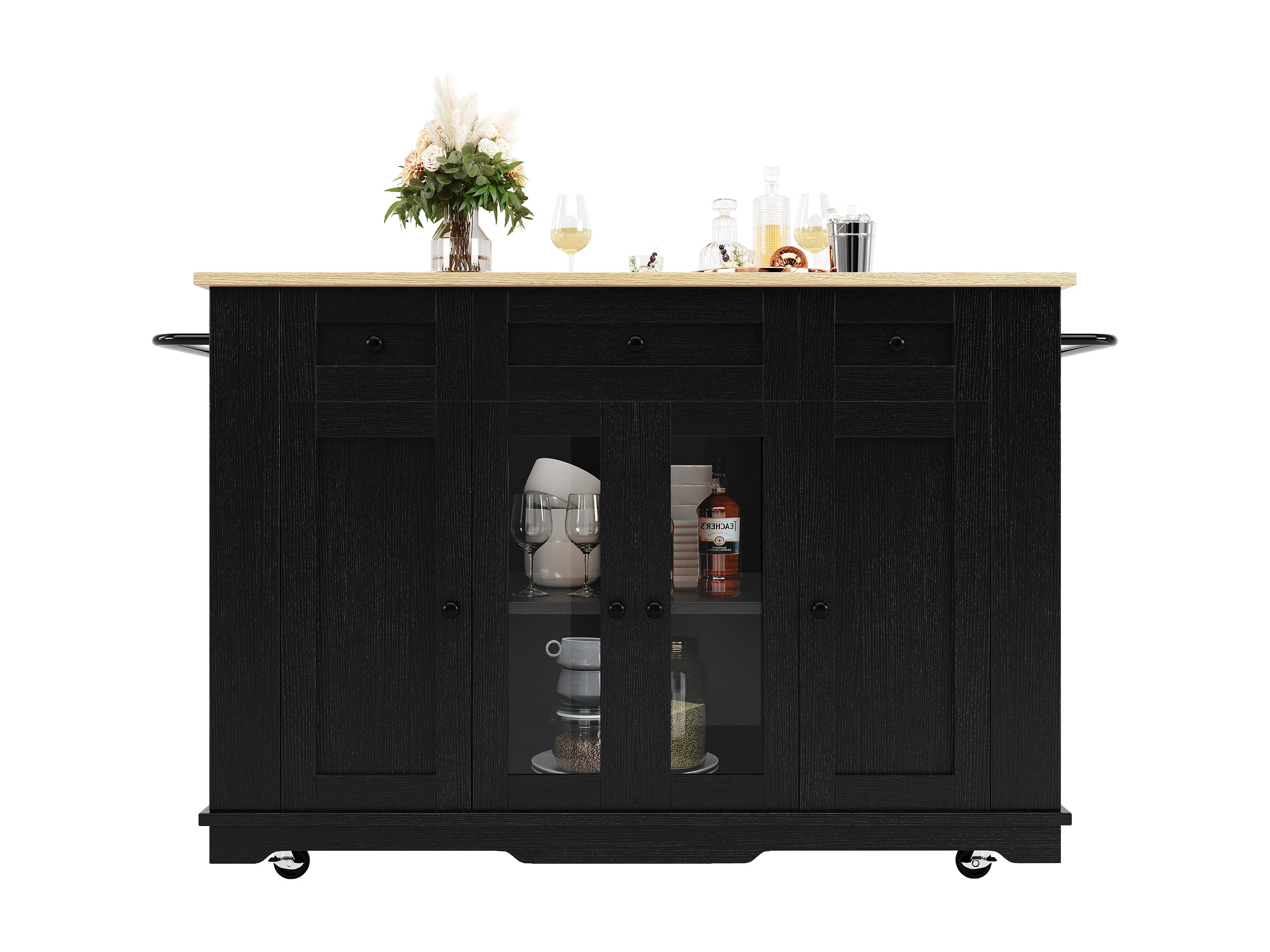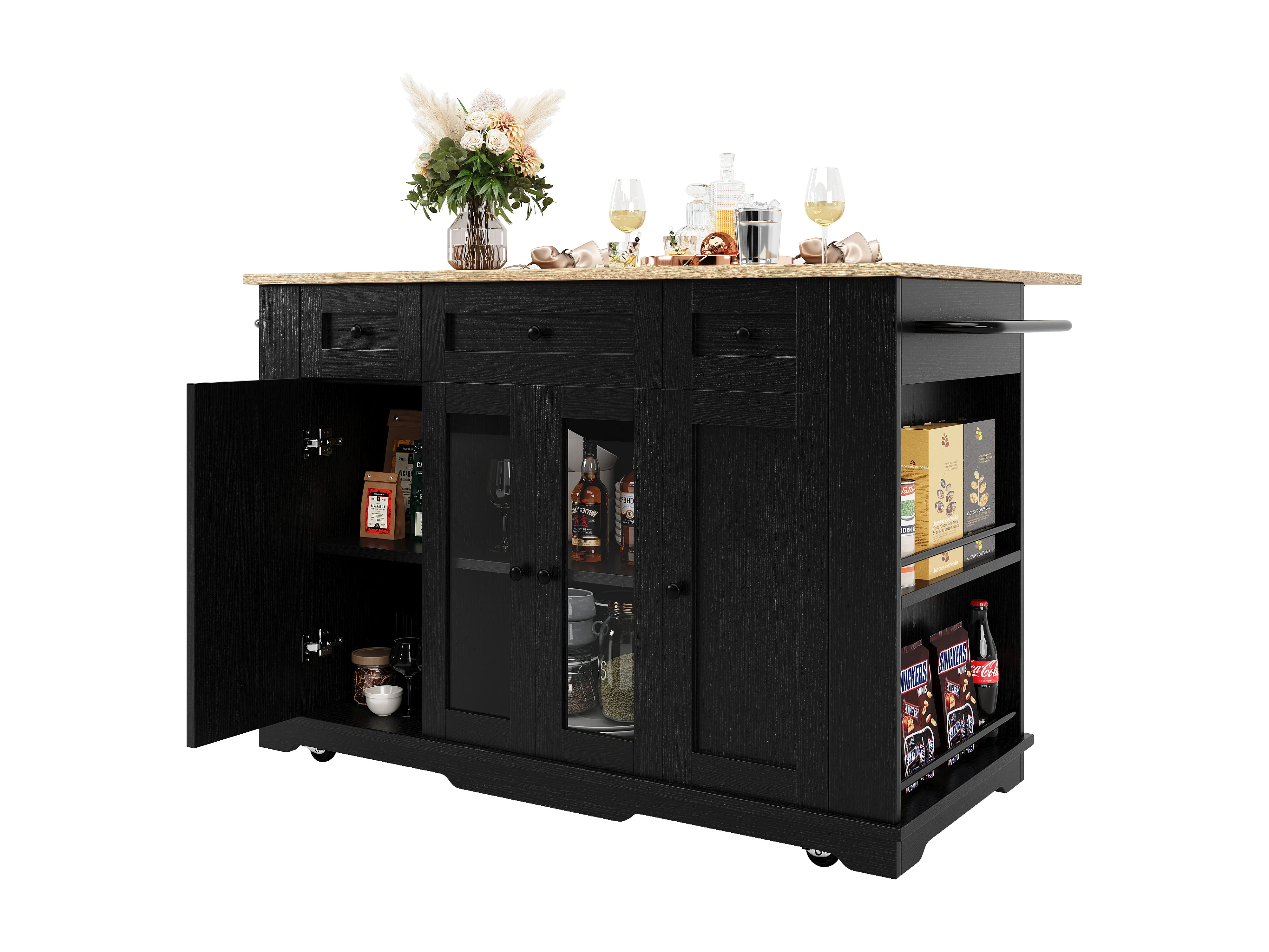 Îlot cuisine avec plan rabattable, séparateurs amovibles, buffet verre trempé, MDF et métal, noir et naturel (151.5x60x91.7 cm)