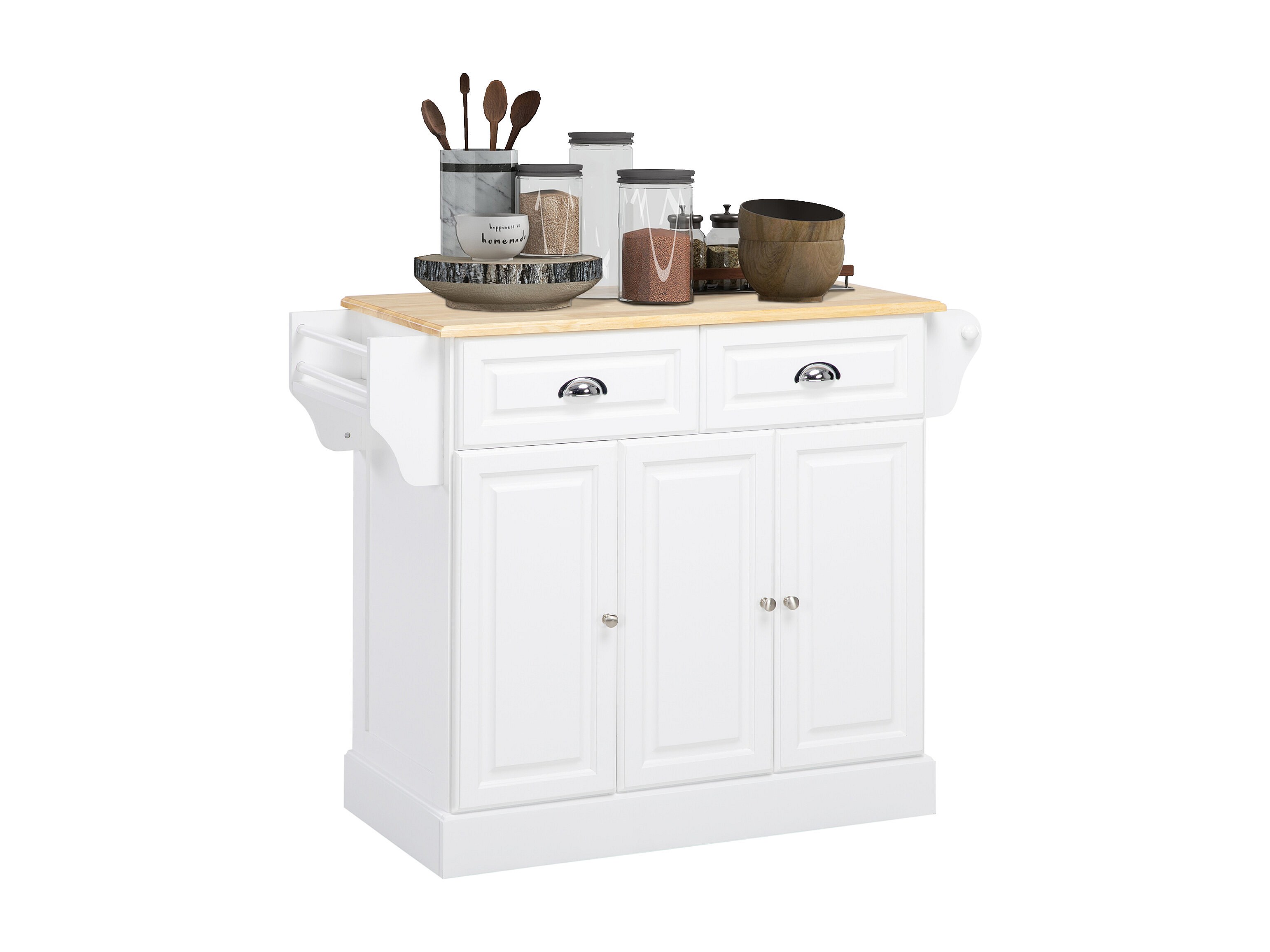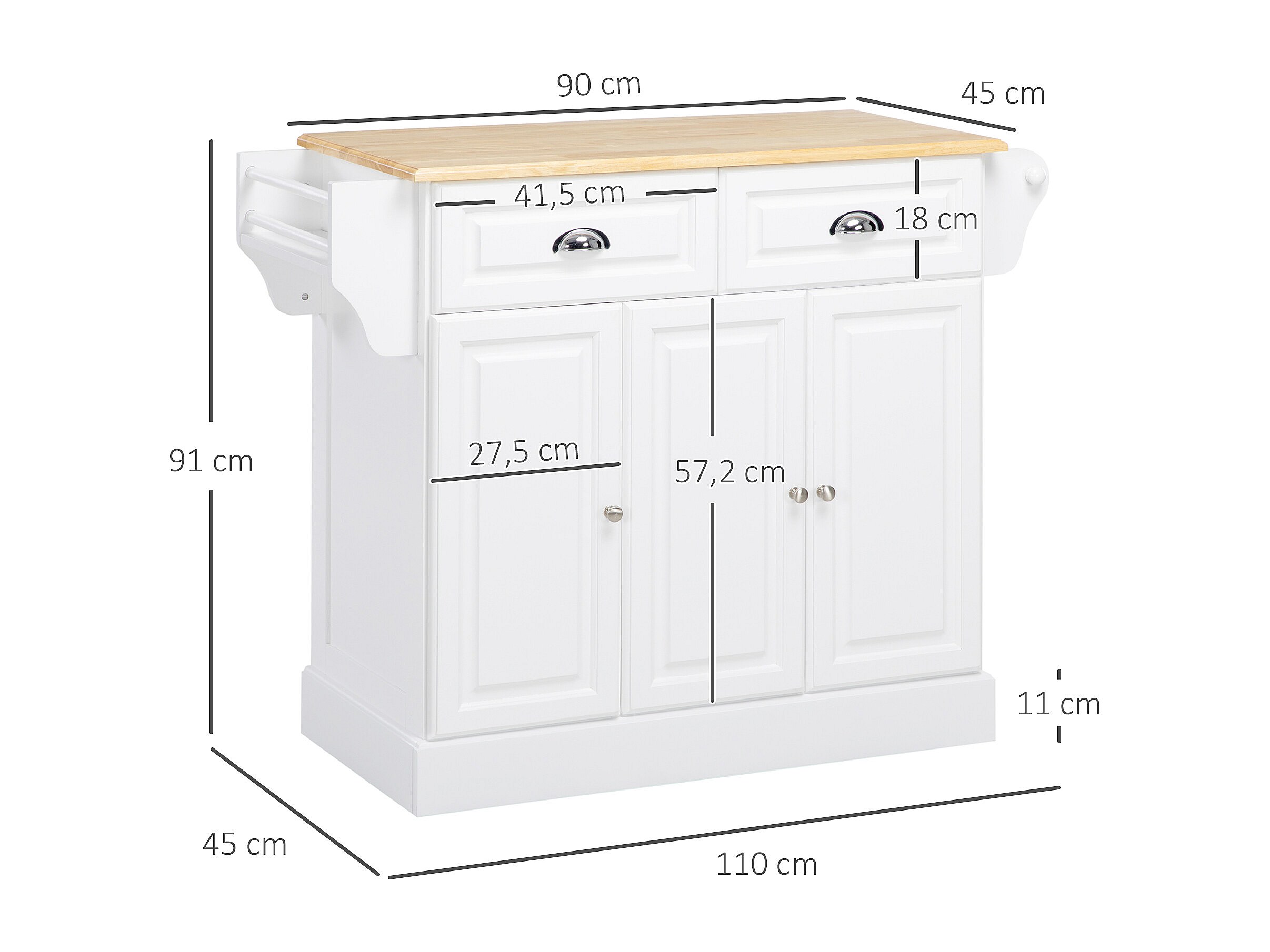 Îlot de cuisine desserte à roulettes - 2 tiroirs, 3 portes, porte-serviette, porte-épices - dim. 110L x 45l x 91H cm - blanc bois