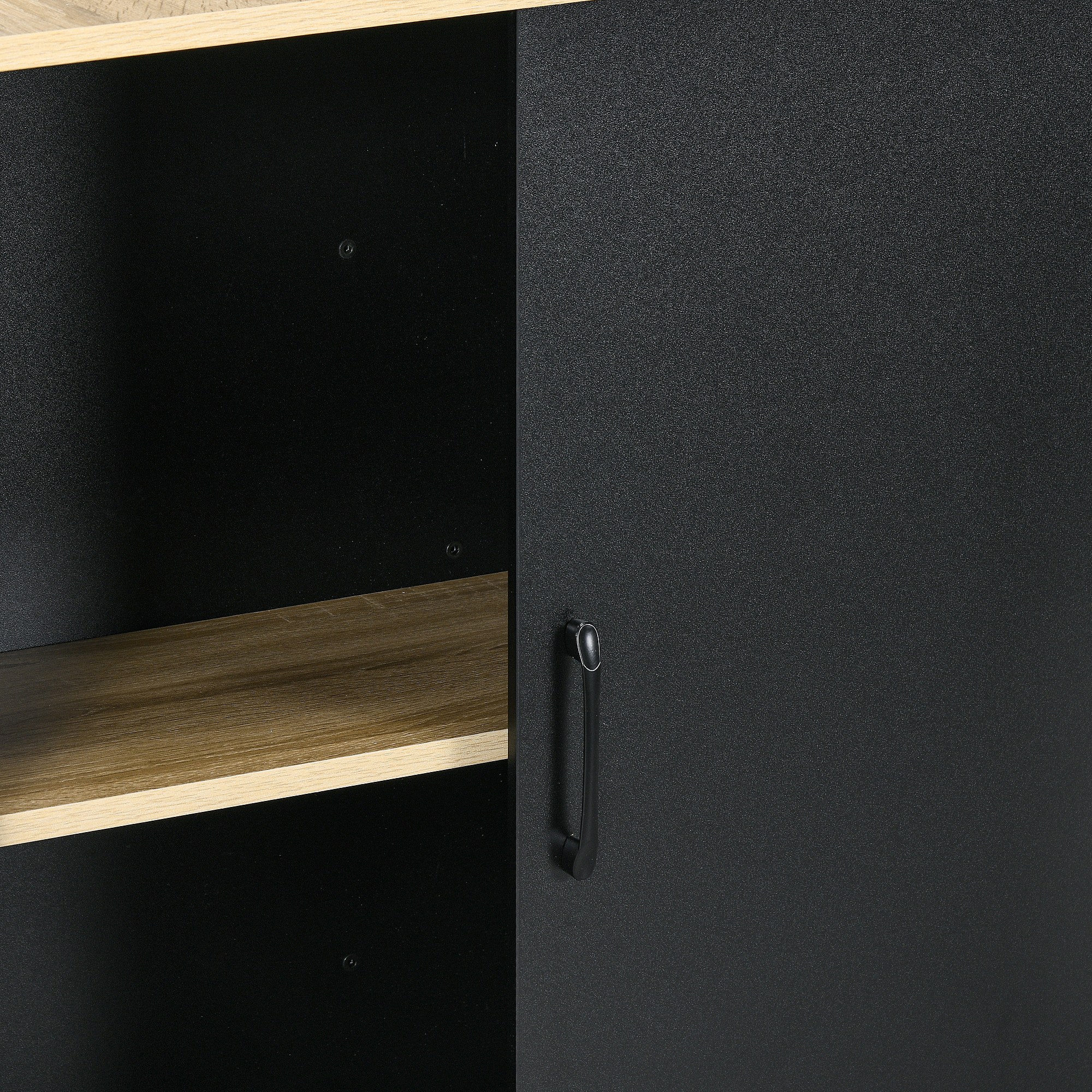 Îlot de cuisine multi-rangement - 2 étagères, placard 2 portes coulissantes avec étagère, porte couteaux - acier panneaux noir chêne clair