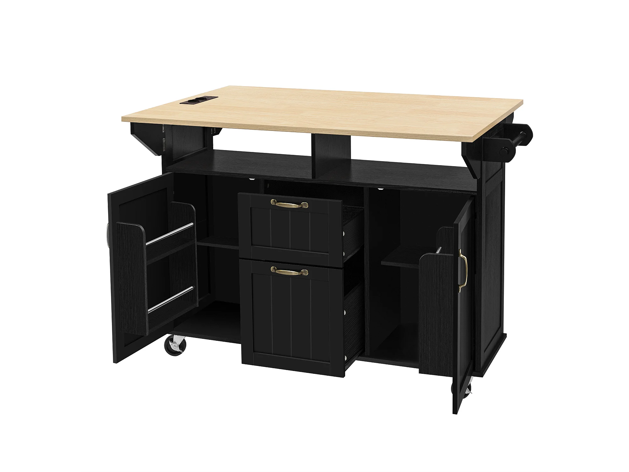 Îlot de cuisine noir - Desserte de cuisine avec 2 tiroirs et 2 portes - porte-serviettes et rangement ouvert