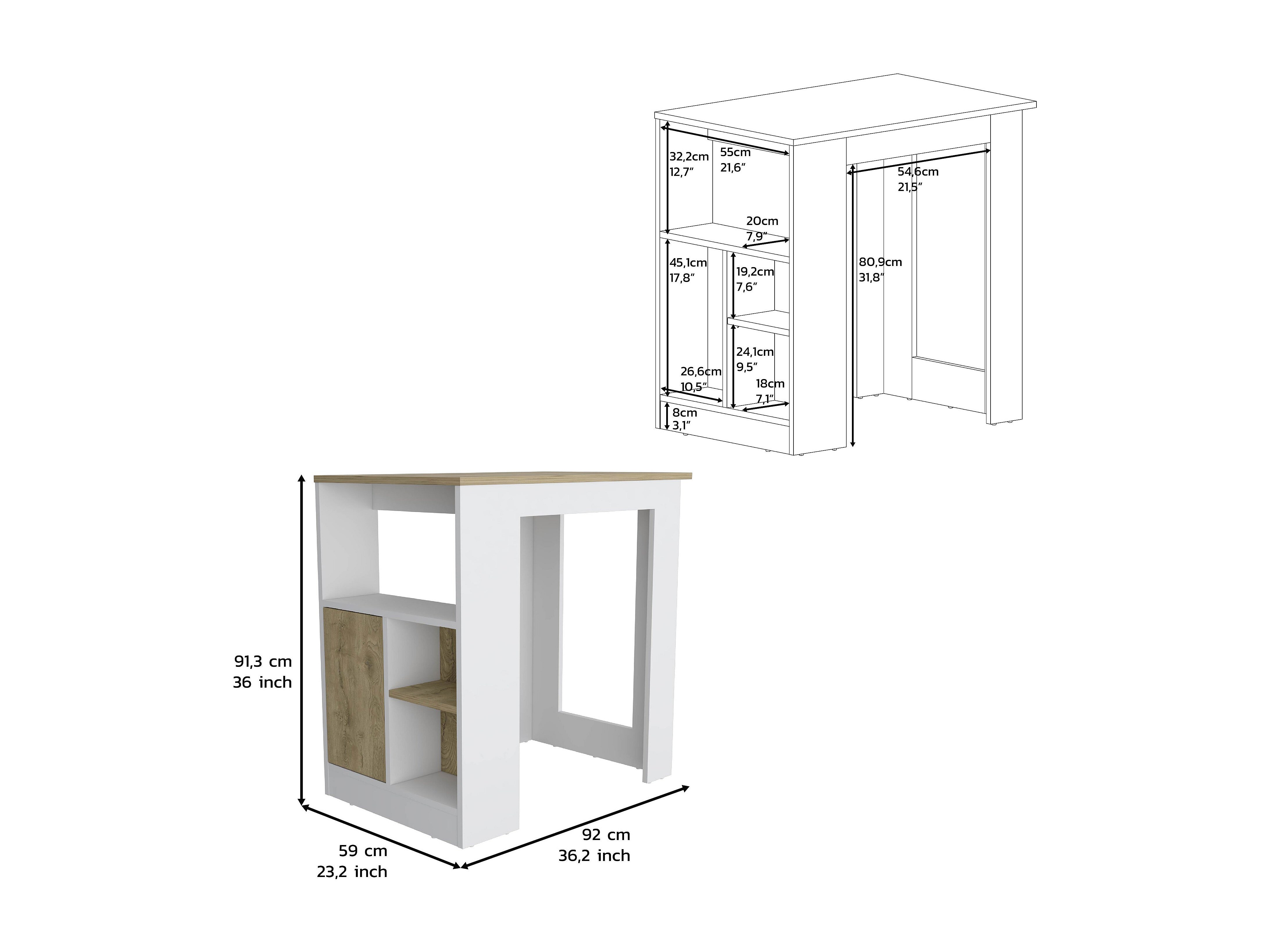 Ilot de cuisine Oviedo en mélaminé avec mini armoire 1 porte et étagères latérales , 91.28 cm X 91.99 cm X 59 cm , Multicolore