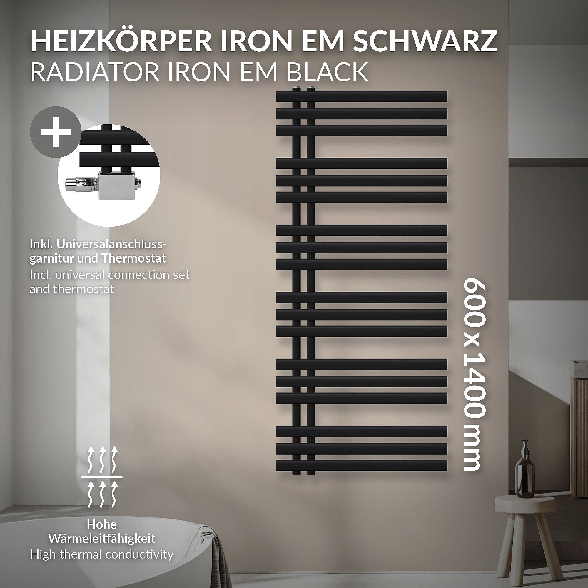 Iron EM Radiateur sèche-serviettes salle de bain en acier noir mat 600x1400 mm