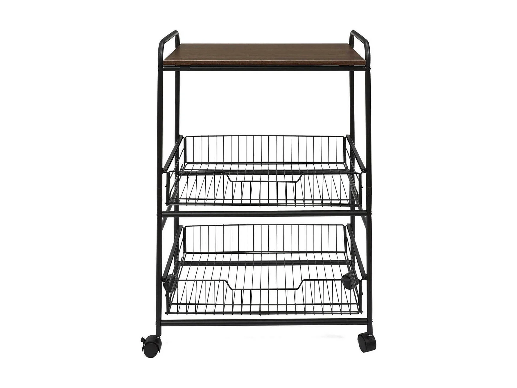 KALIO - Desserte sur roulettes en Métal imitation bois et Plateaux en Plastique Noirs