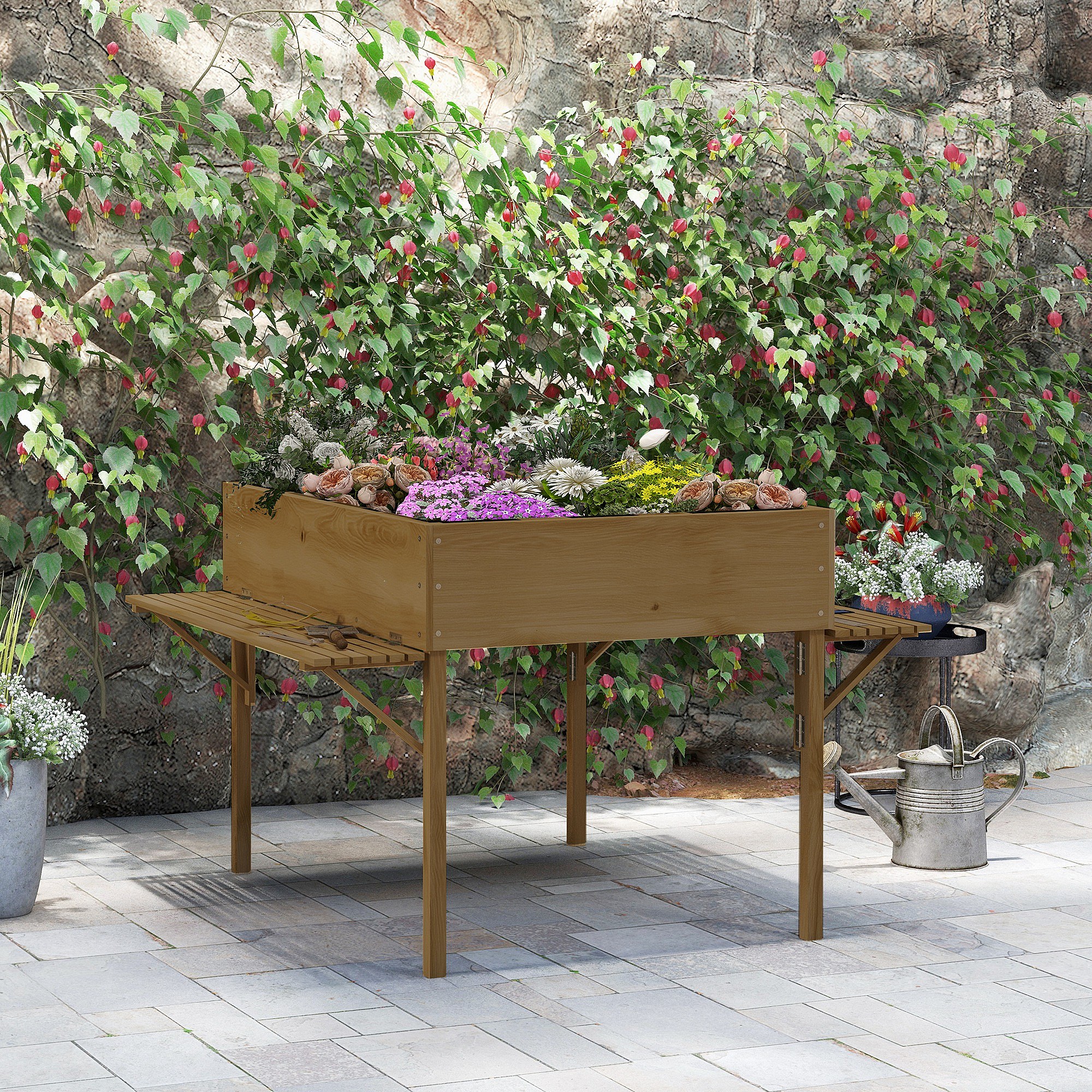 Jardinière rectangulaire sur pied - 12 compartiments, tablettes latérales rabattables - bois de sapin