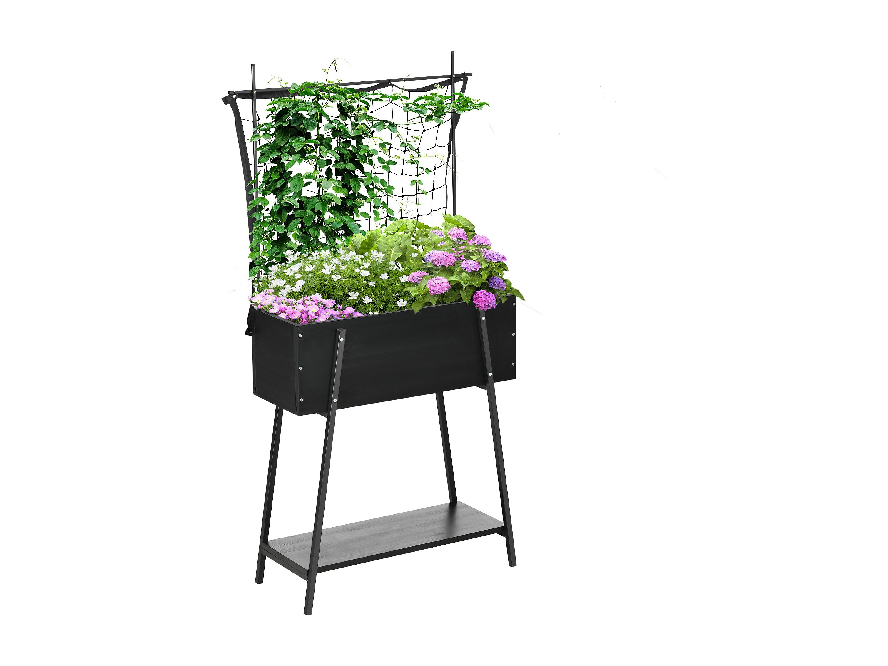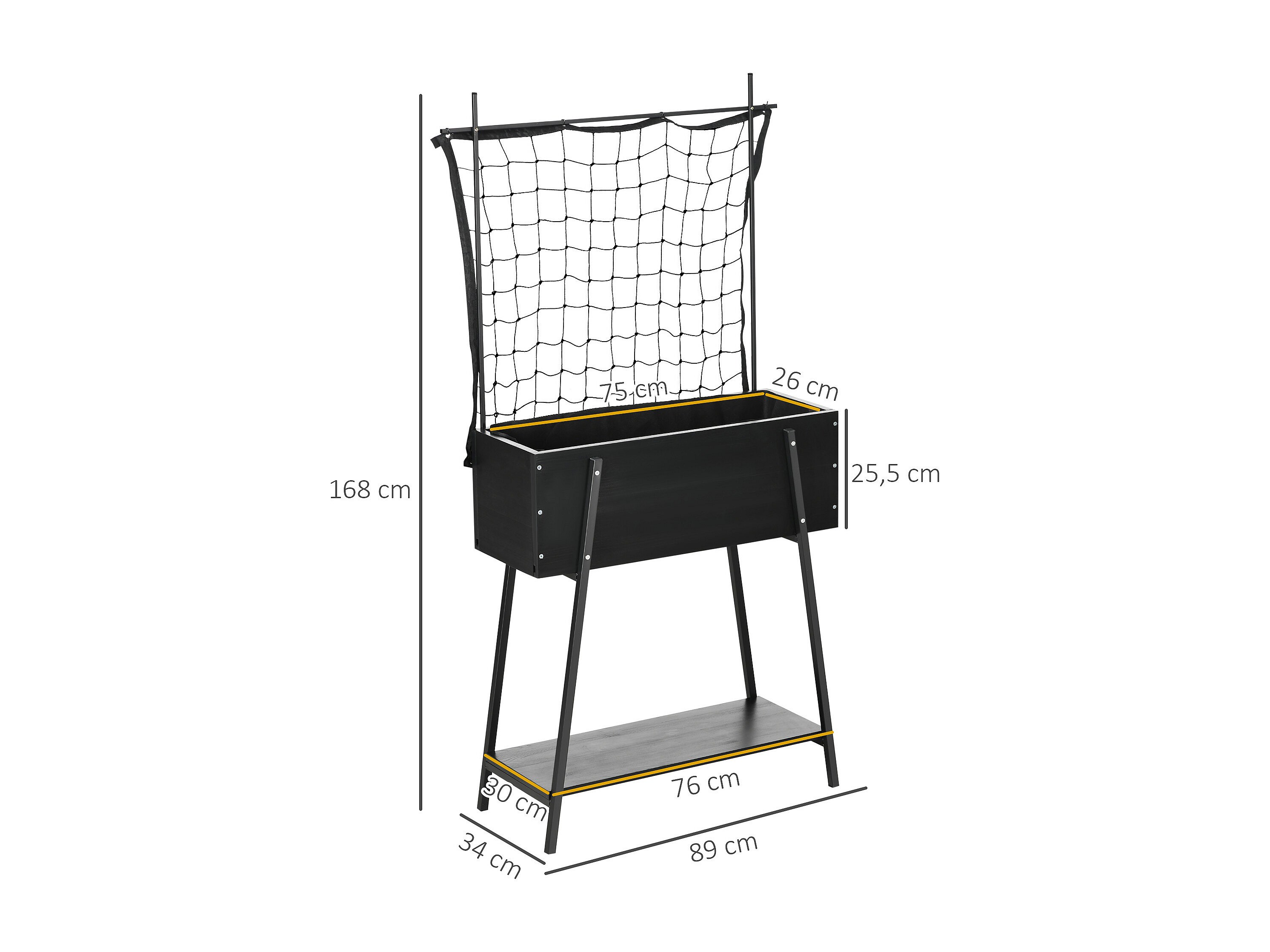Jardinière sur pieds avec treillis filet - étagère, inserts d'irrigation - châssis métal époxy noir bois sapin noir