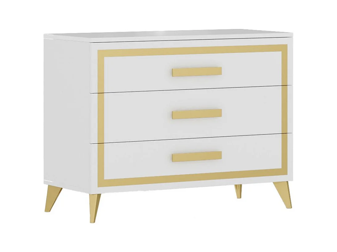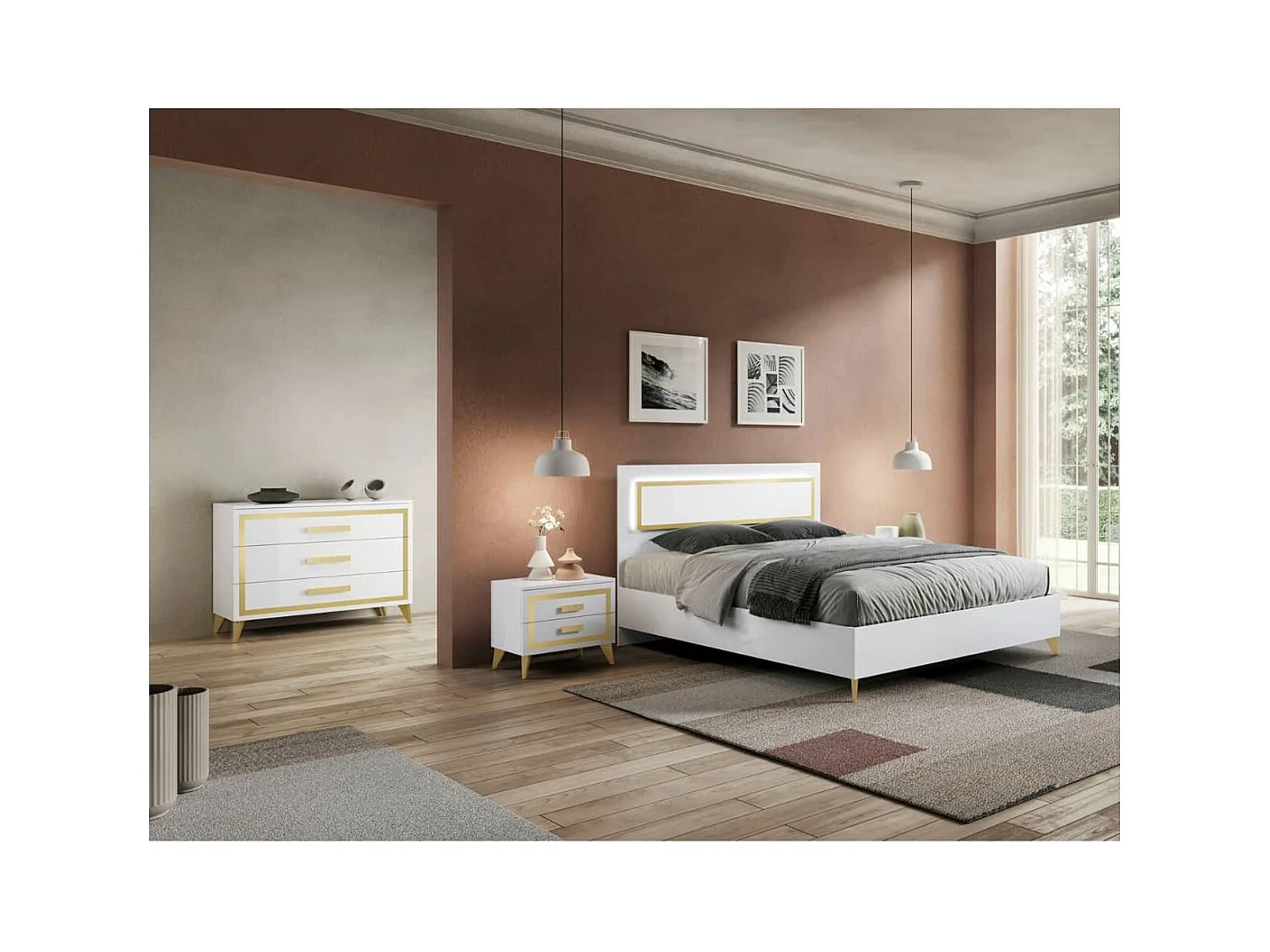 JEMMA - Chambre 160x200cm Blanche et Décor Doré Lit avec Leds + 2 Chevets + Commode