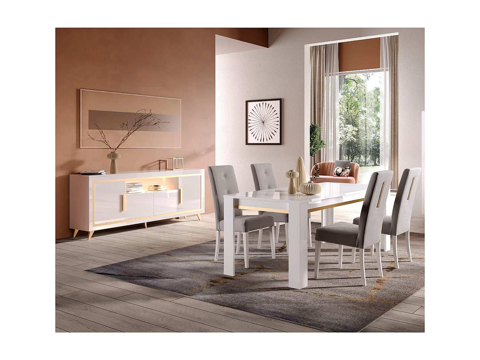 JEMMA - Ensemble Séjour Blanc Décor Doré Table 190cm + Buffet avec Leds