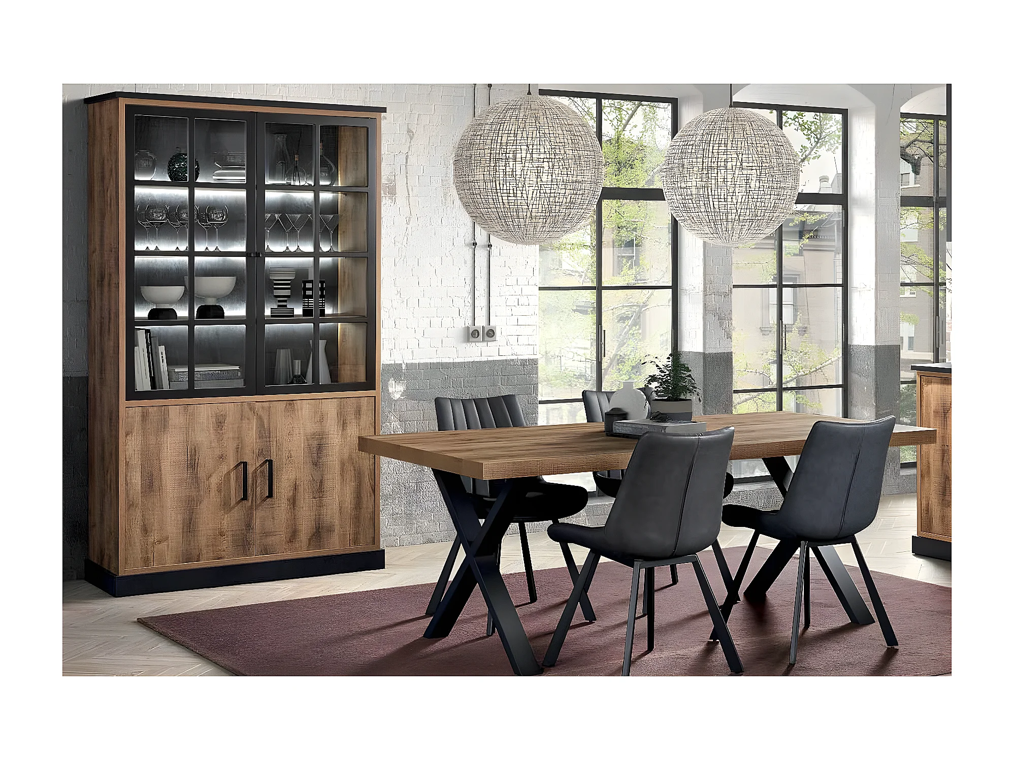 JENNA - Ensemble Table 170cm + Vitrine 4 Portes Aspect Bois et Métal