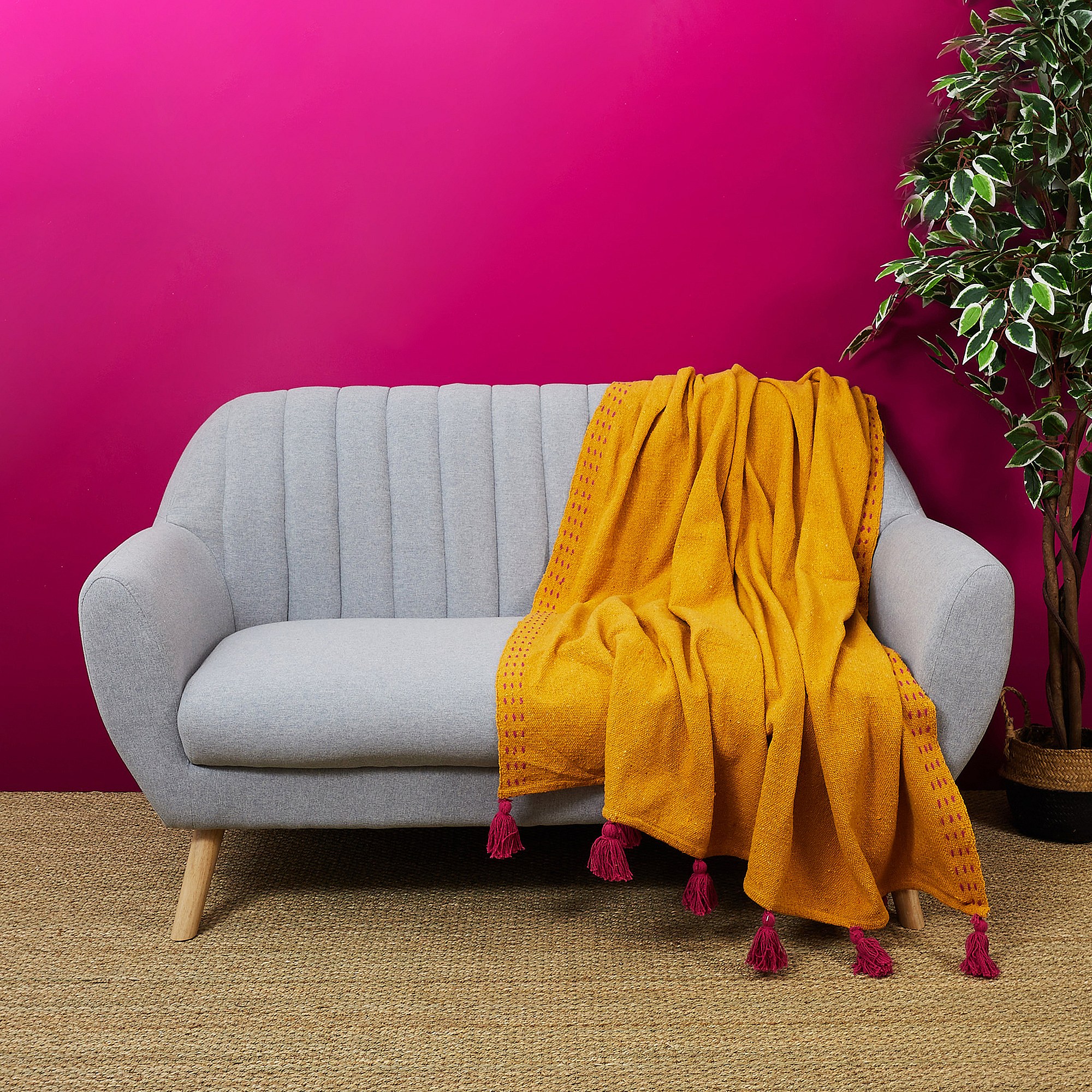 Jete De Canape Surpique Pompons Jaune 130x150cm