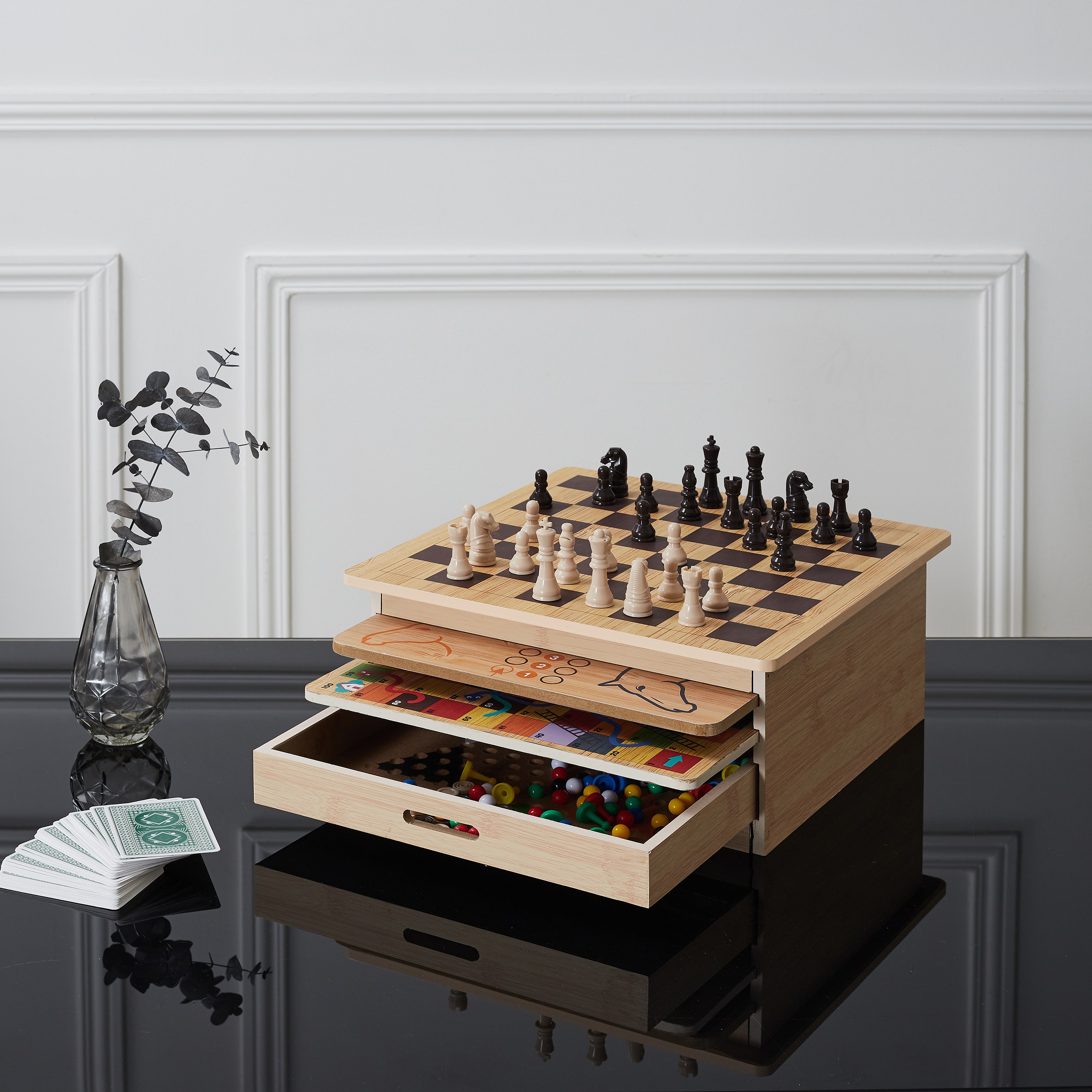 Jeu 3/11 (échecs+dominos+dés) dans une boîte en bois marron 15,5x16x3.