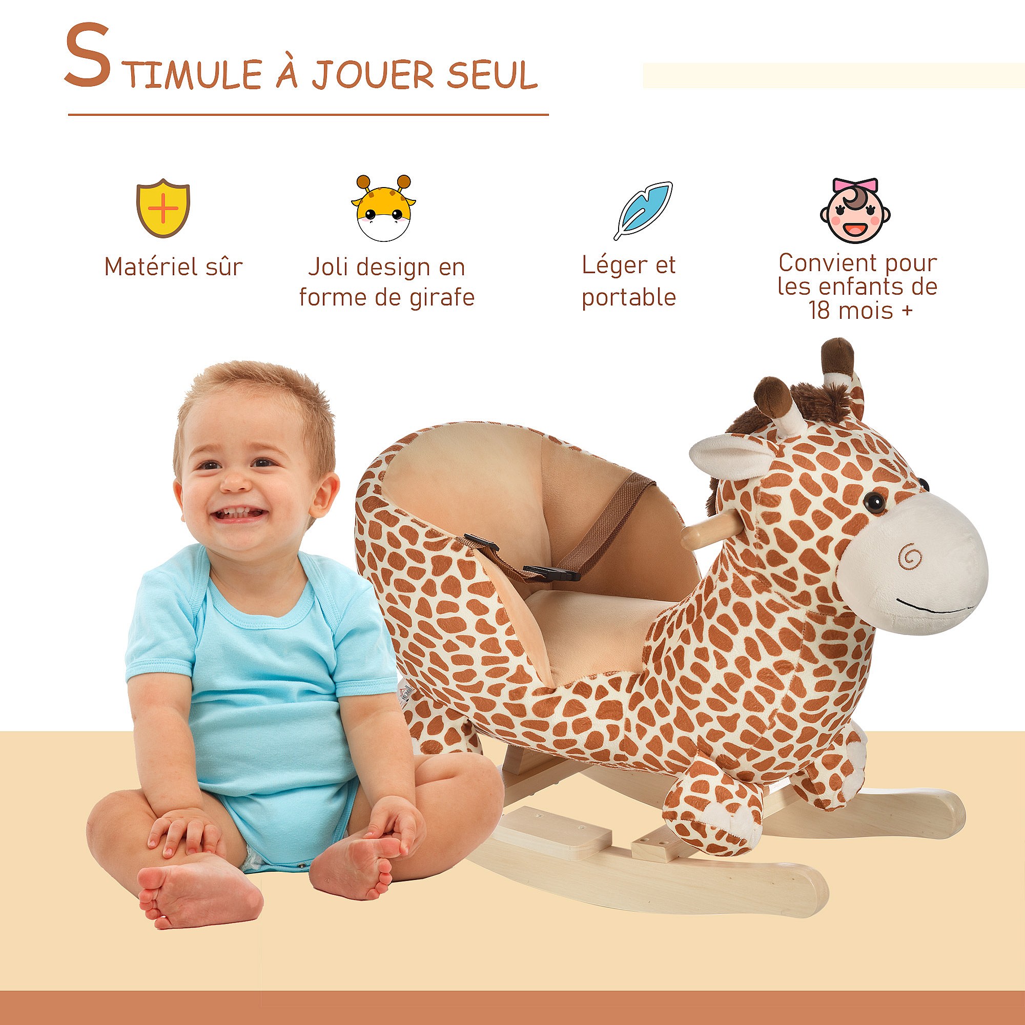 Jouet à bascule modèle girafon ceinture de sécurité fonction musicale 32 pistes marron beige