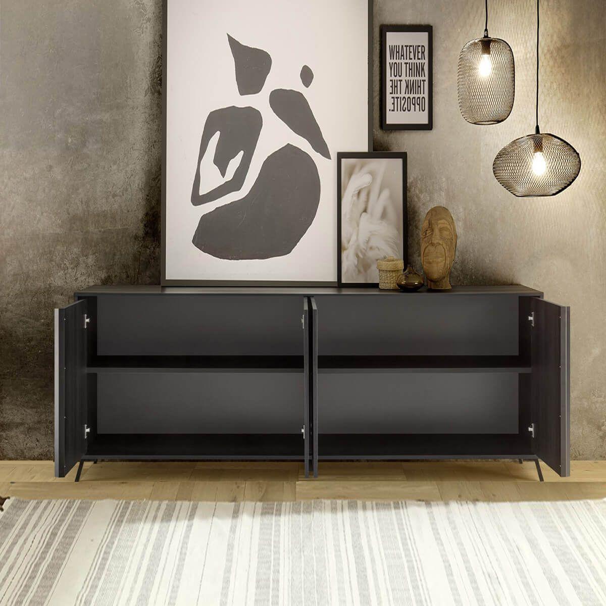 KANSAS BLACK - Buffet 4 portes aspect chêne noir pieds métal noir
