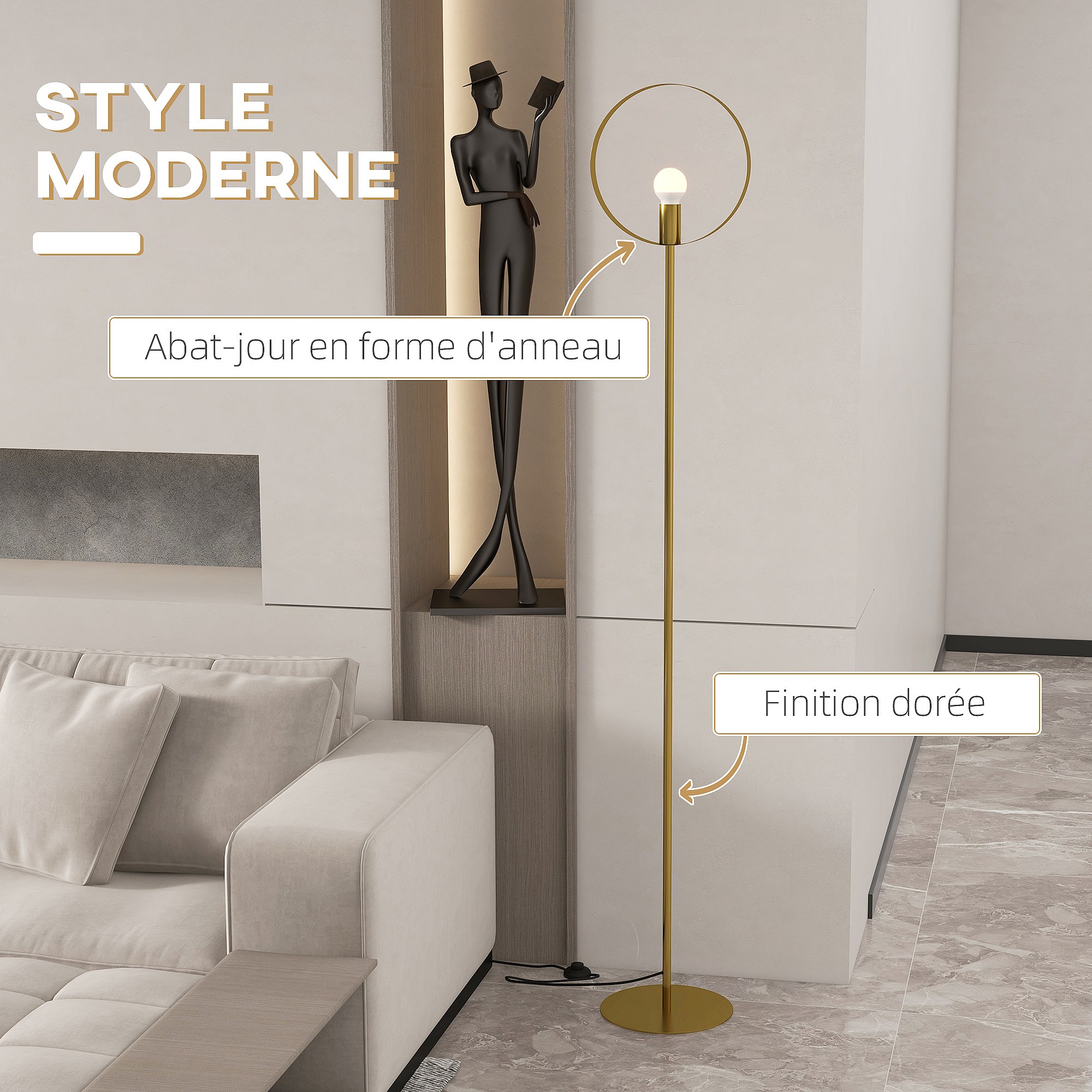 Lampadaire design néo-rétro circulaire H. 1,70 m max. 40 W métal doré