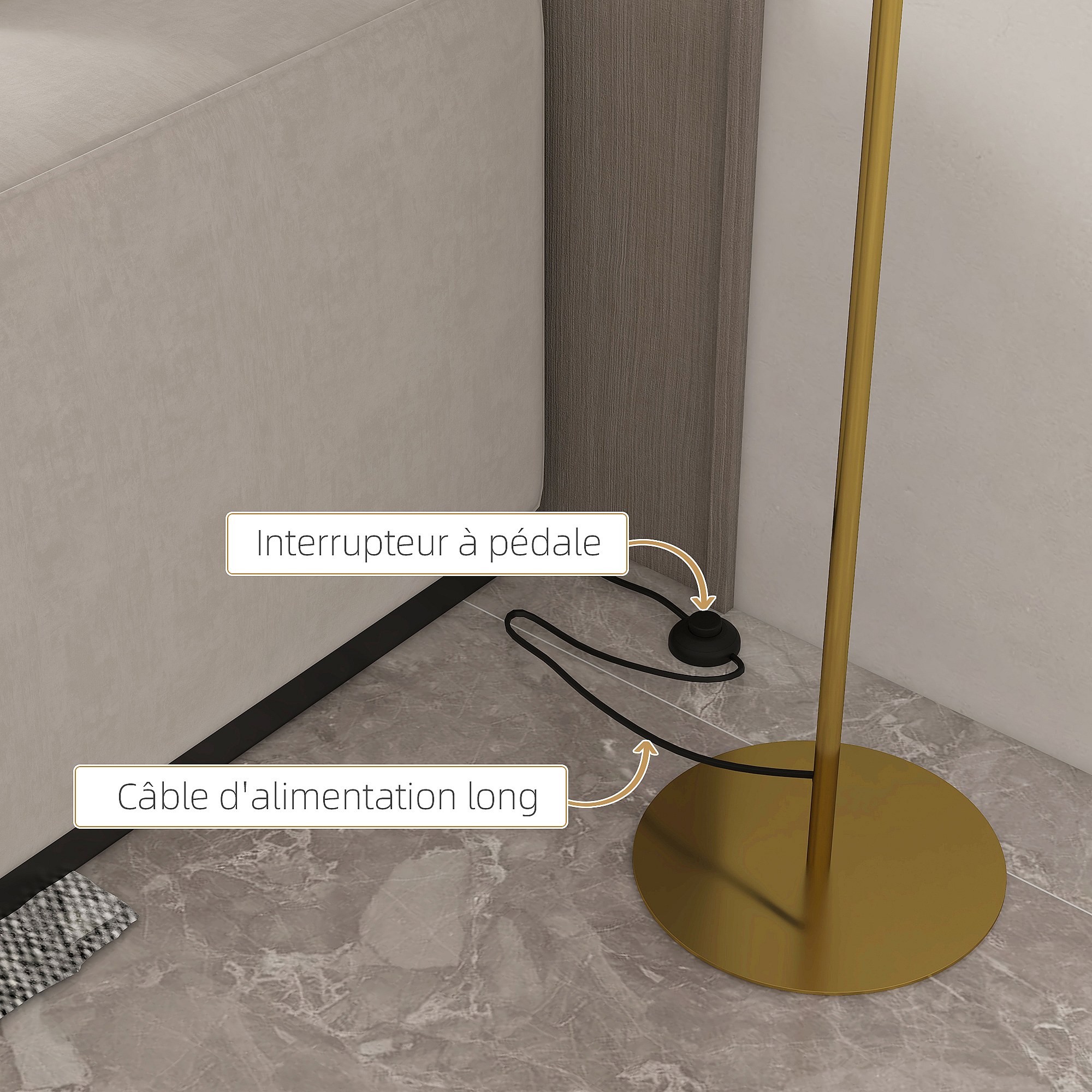 Lampadaire sur pied salon 40W acier doré abat-jour conique orientable base marbre