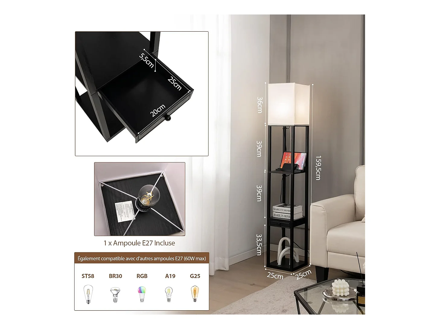 Lampadaire sur Pied Salon Moderne avec LED E27 Variable de 5000K et 1 Port USB, Lampe Salon sur Pied 160cm 3 Étagères Ouvertes et 1 Tiroir, Montage Facile