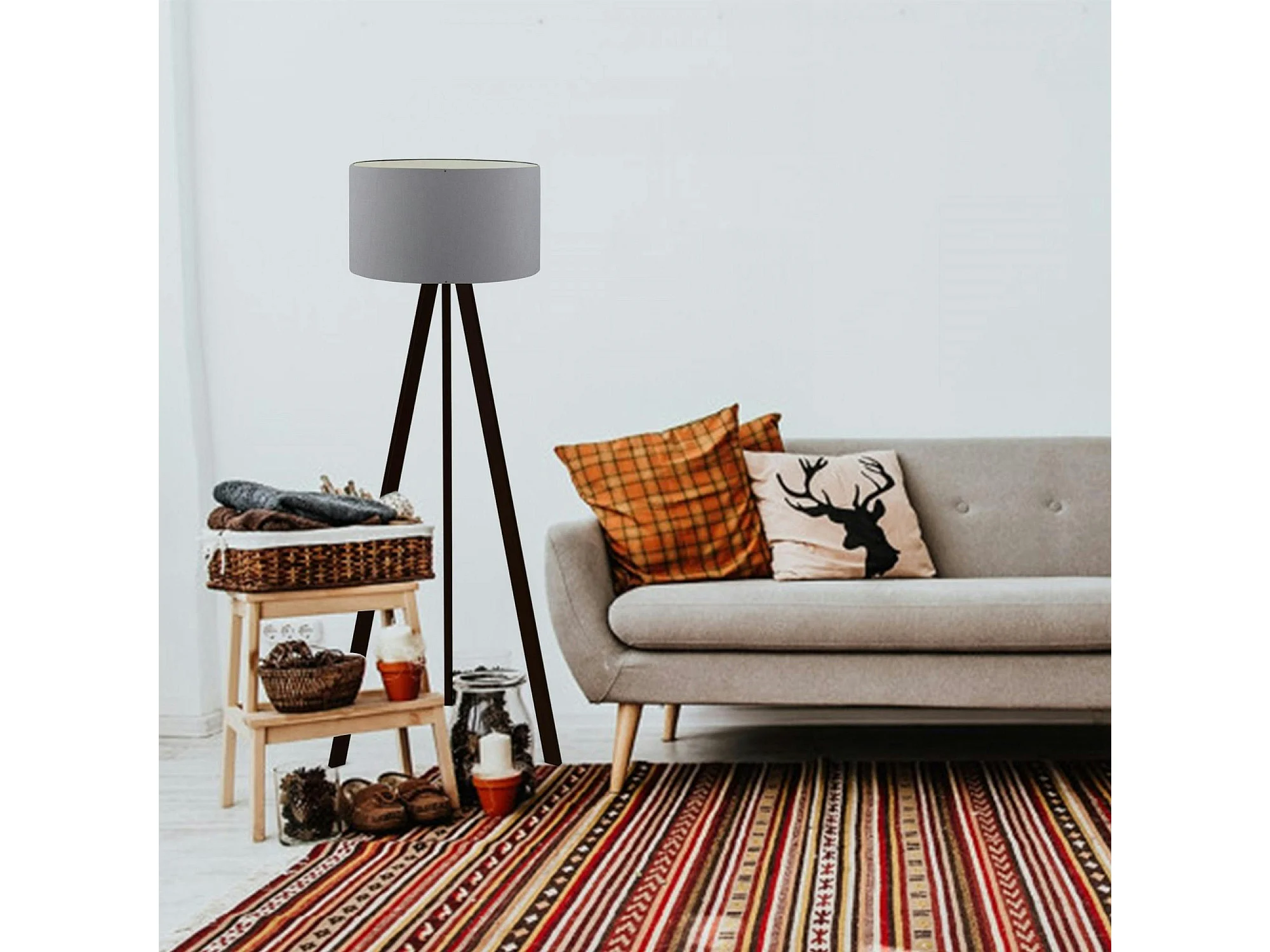 Lampadaire trépied effet bois noyer, abat-jour gris KILIS