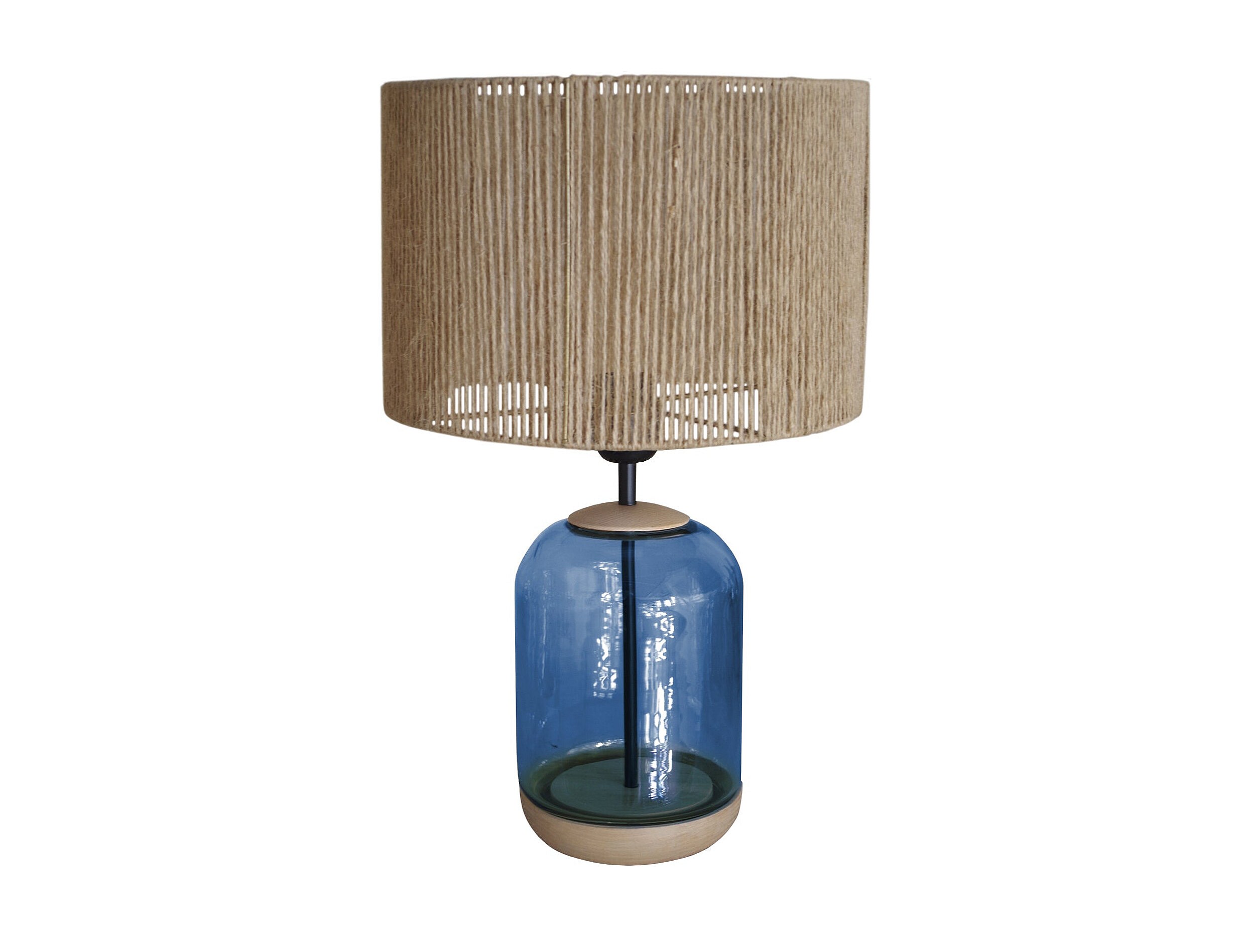 Lampe de chevet cylindre bois,verre,bleu,fillage jute 53 cm.