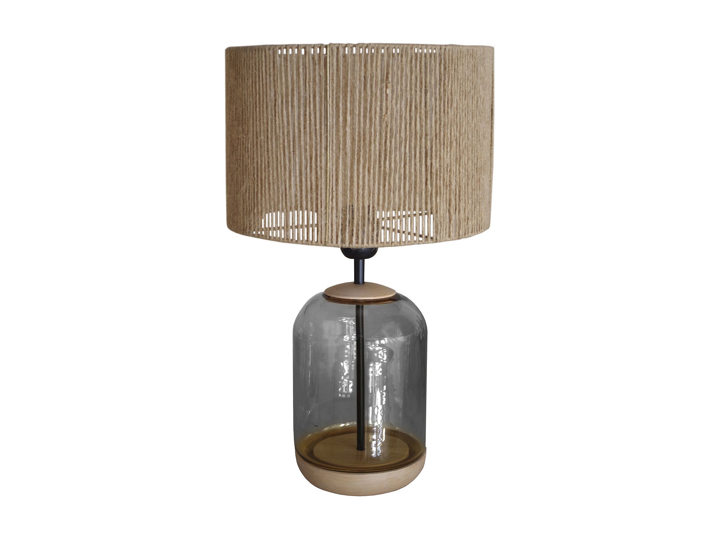 Lampe de chevet cylindre bois,verre,fumée,fillage jute 41 cm.