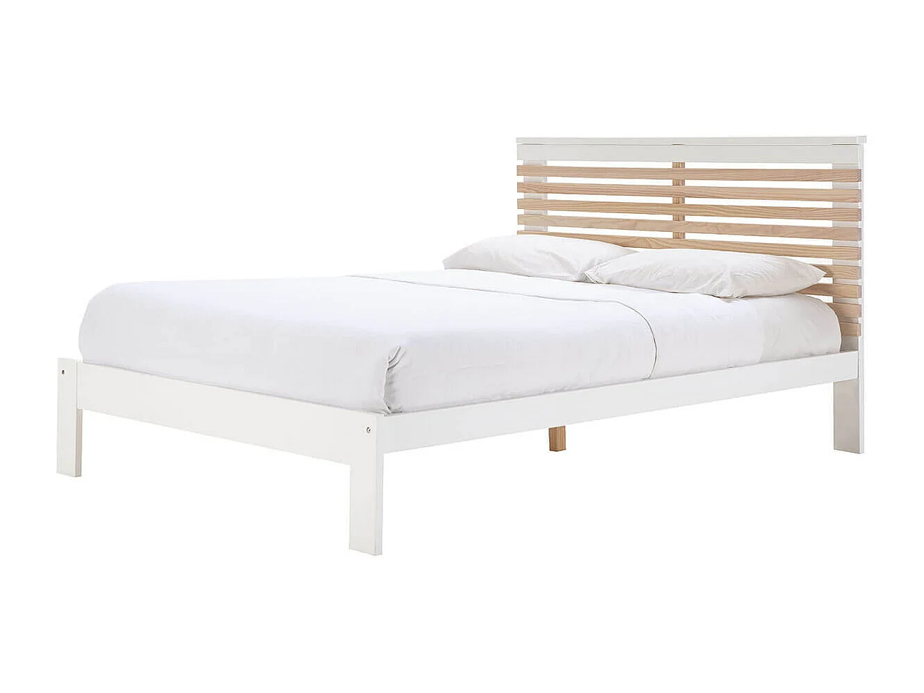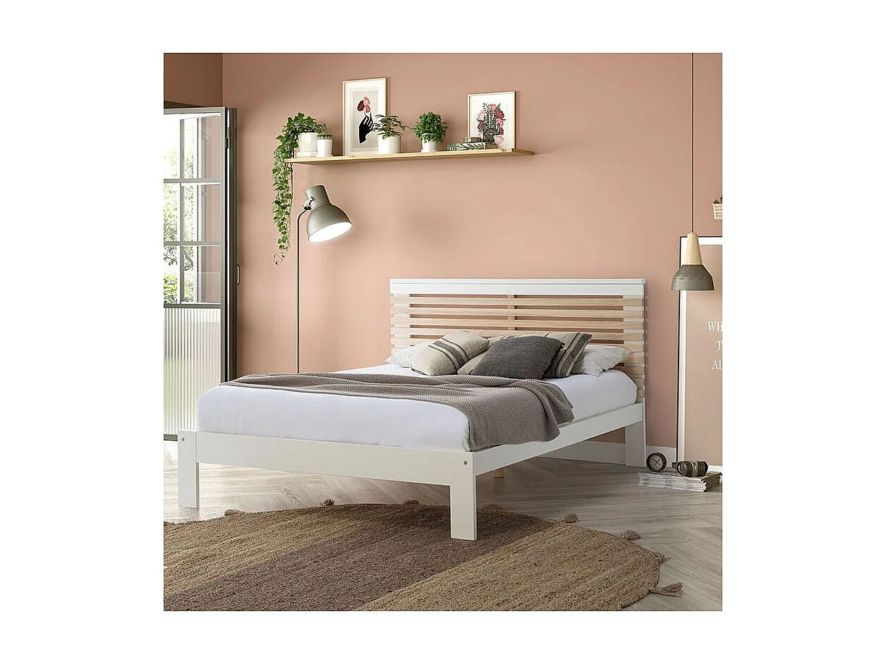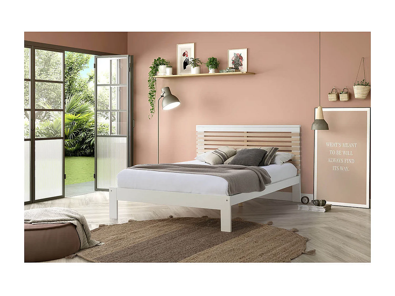 LAUPELL - Lit 140x190cm + Tête de Lit Blanc et Naturel
