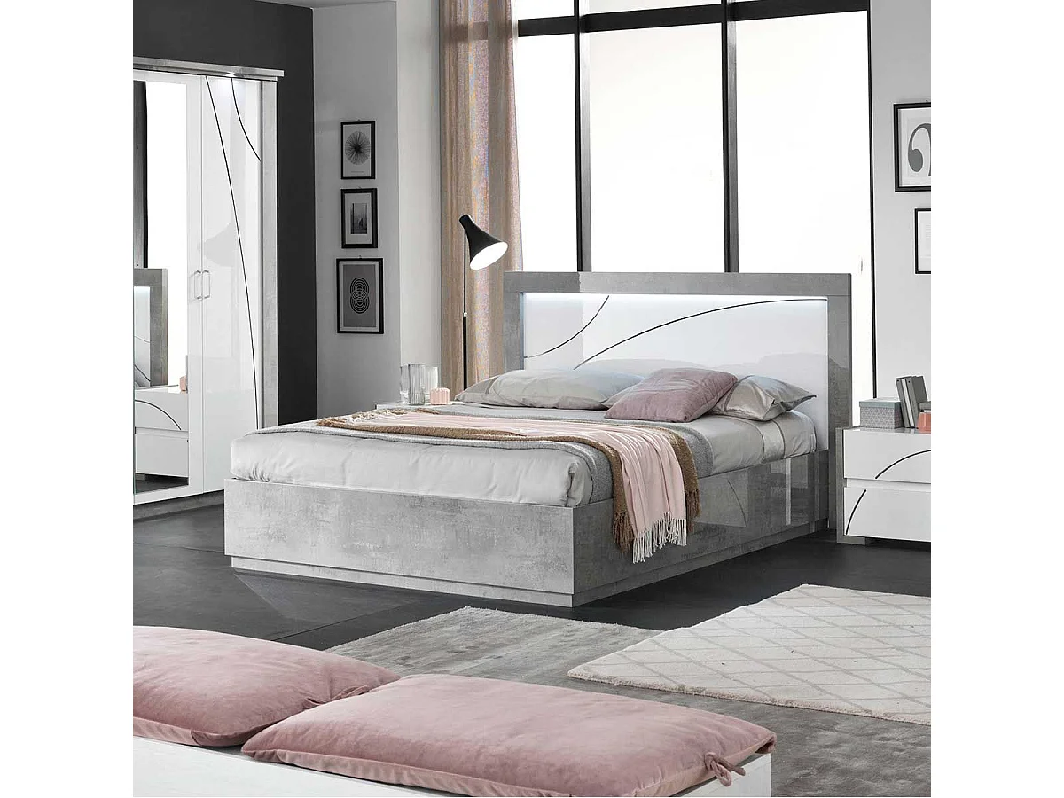 LINEAL - Lit 160x200cm Laqué Blanc et Gris Béton Détails Chromés avec Leds