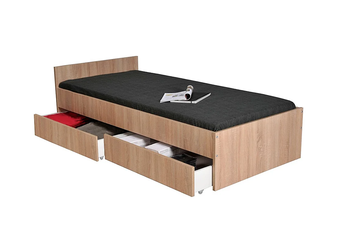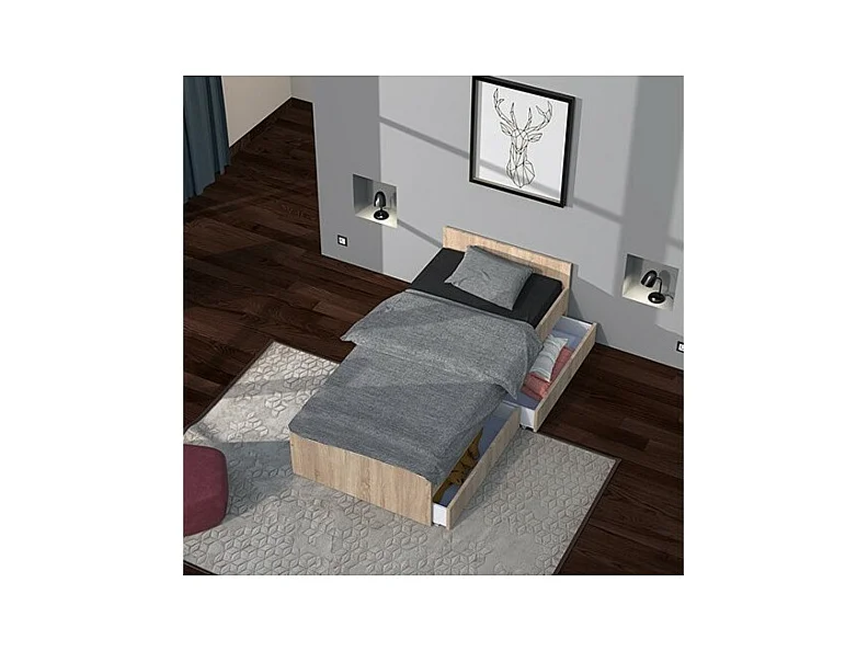 Lit 1 place 90x190cm blanc KIAPA couleur chêne inclus sommier et 2 tiroirs pour rangement