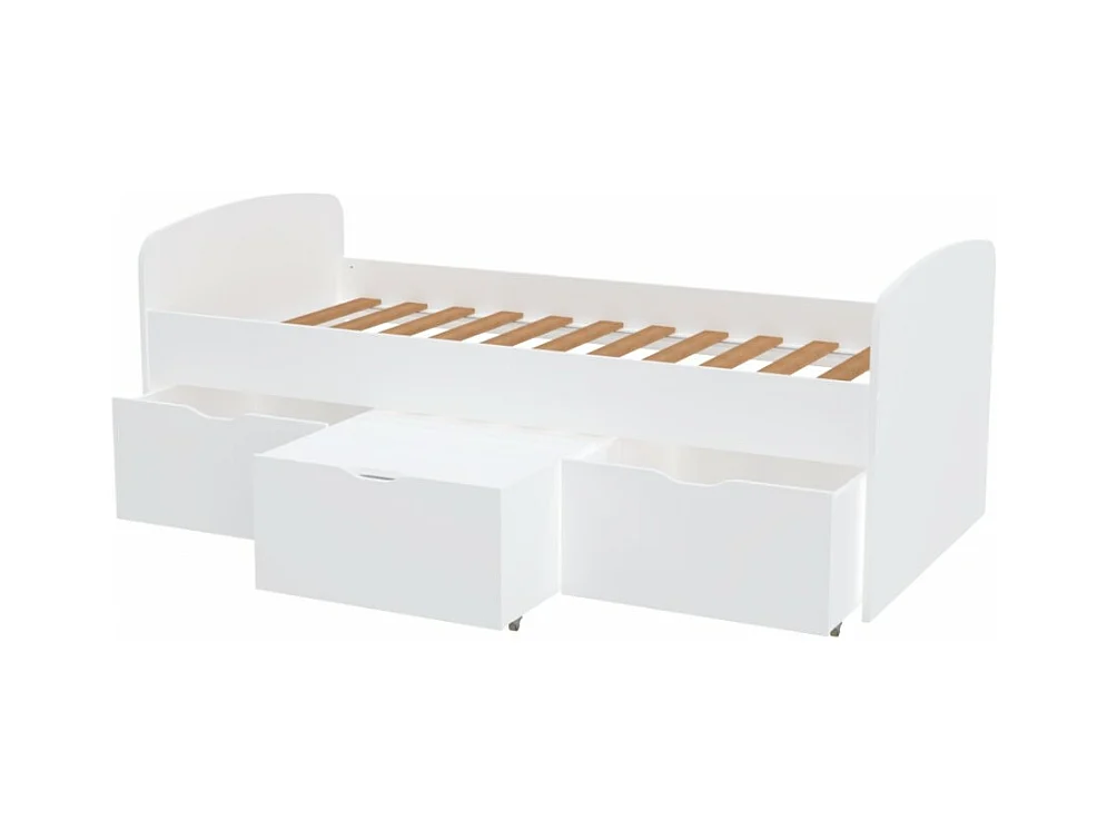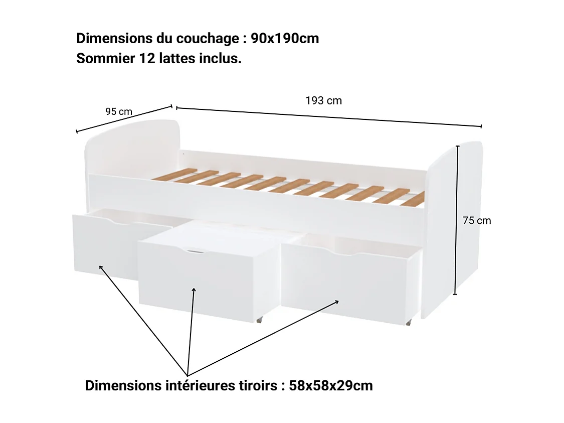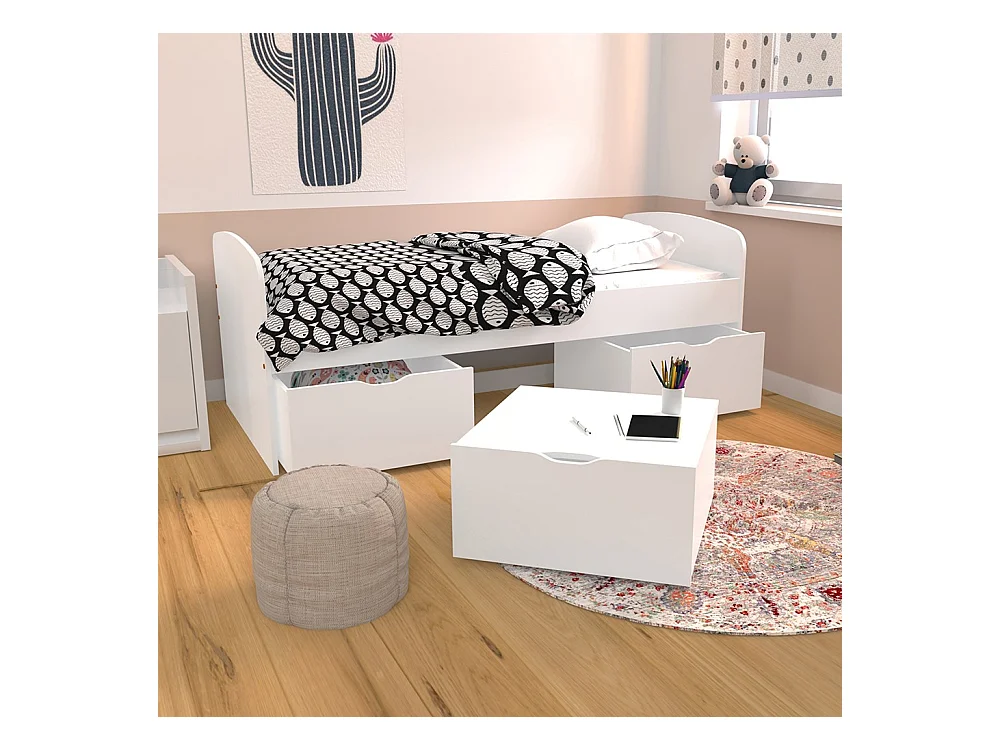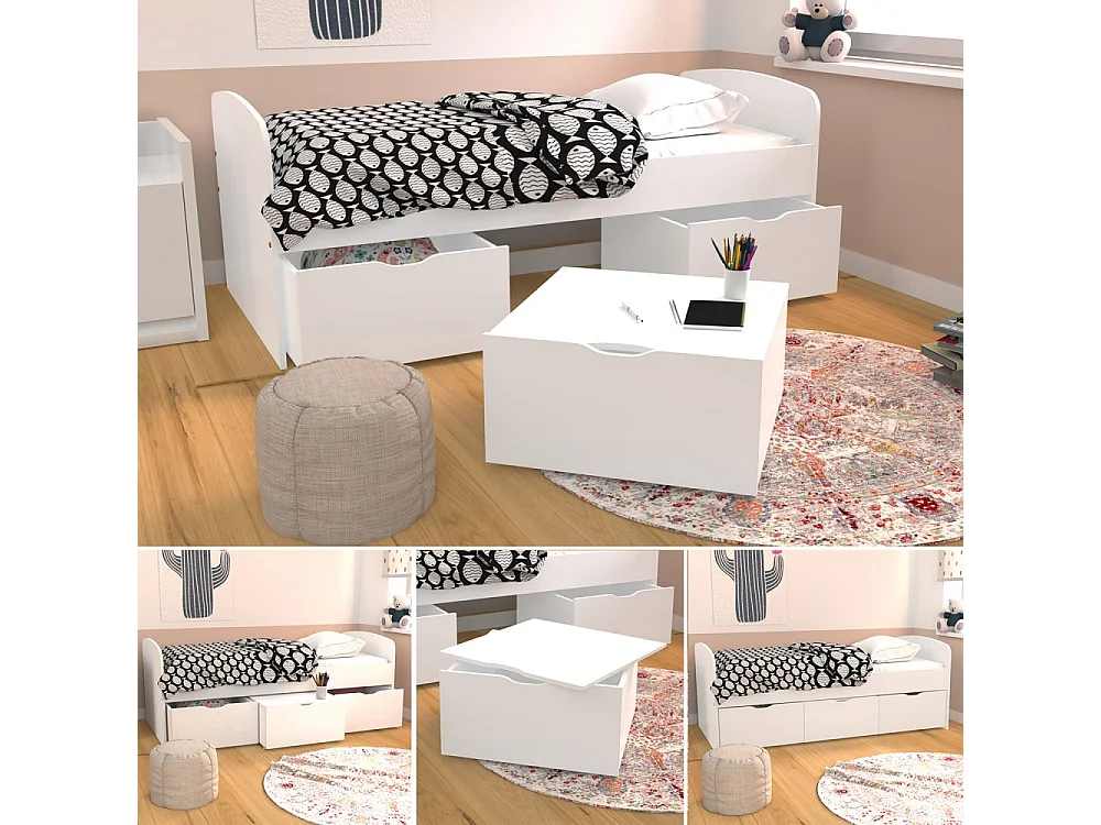 Lit 1 place 90x190cm blanc MAYA inclus sommier 2 tiroirs et coffre table basse