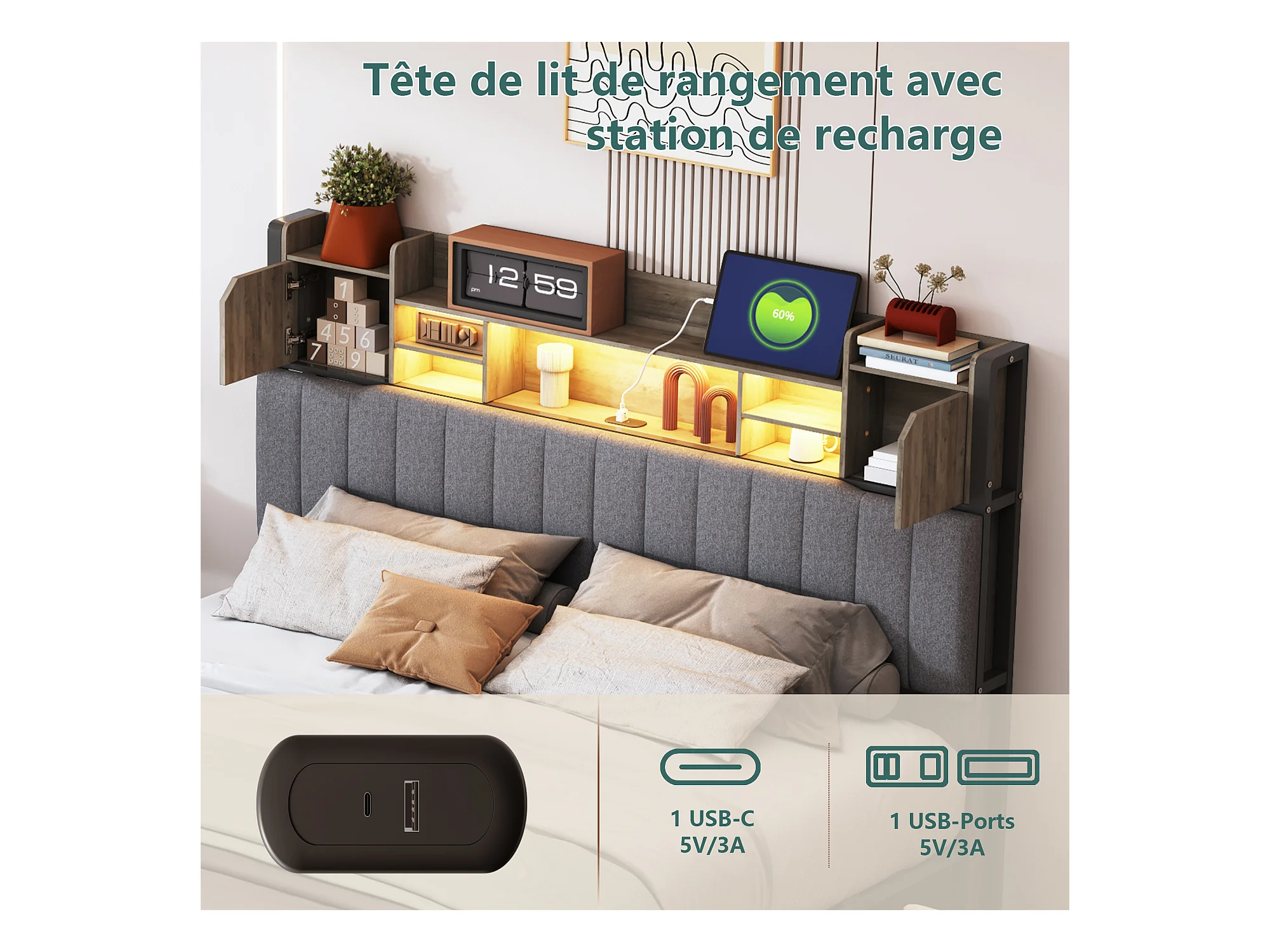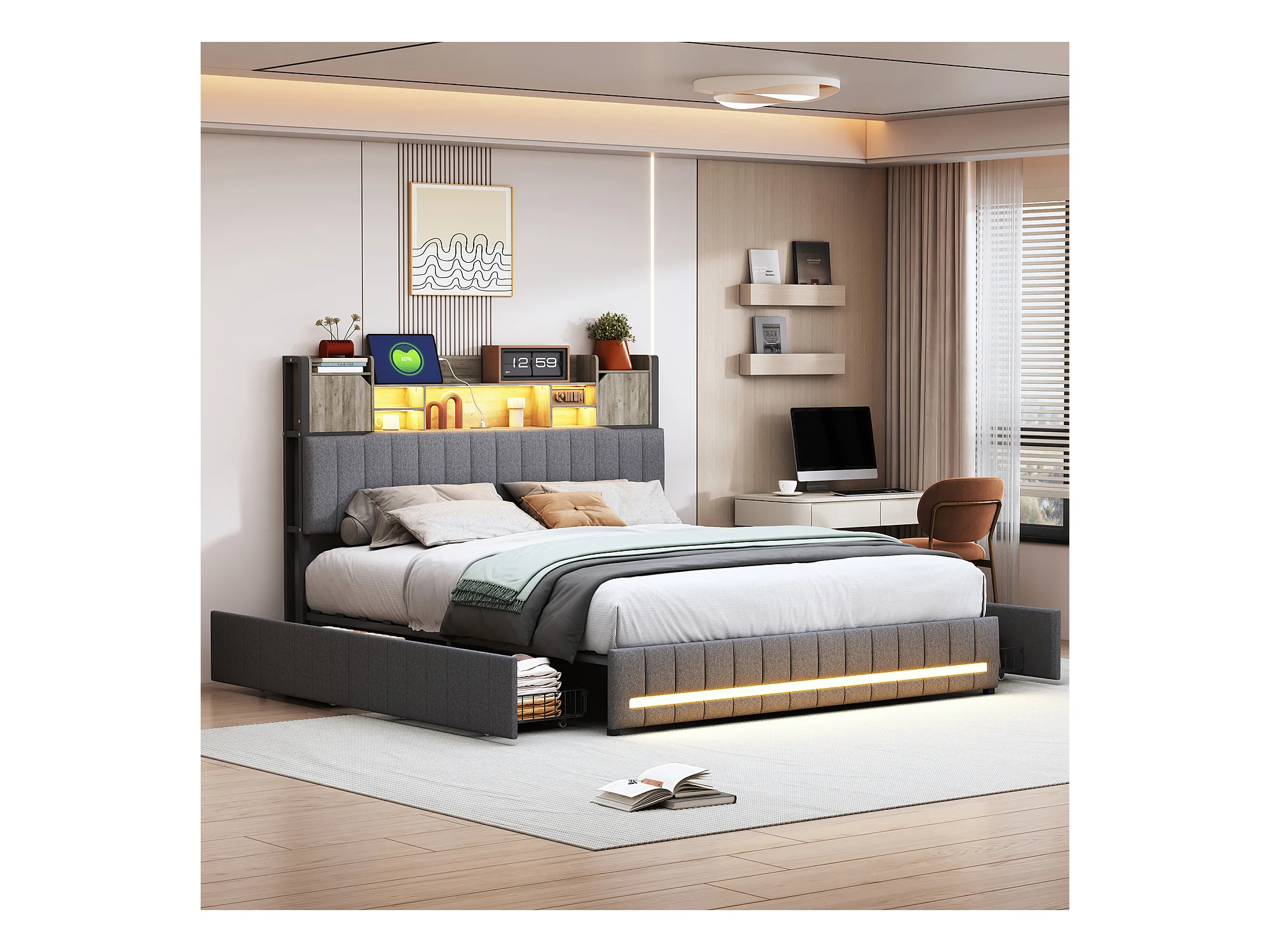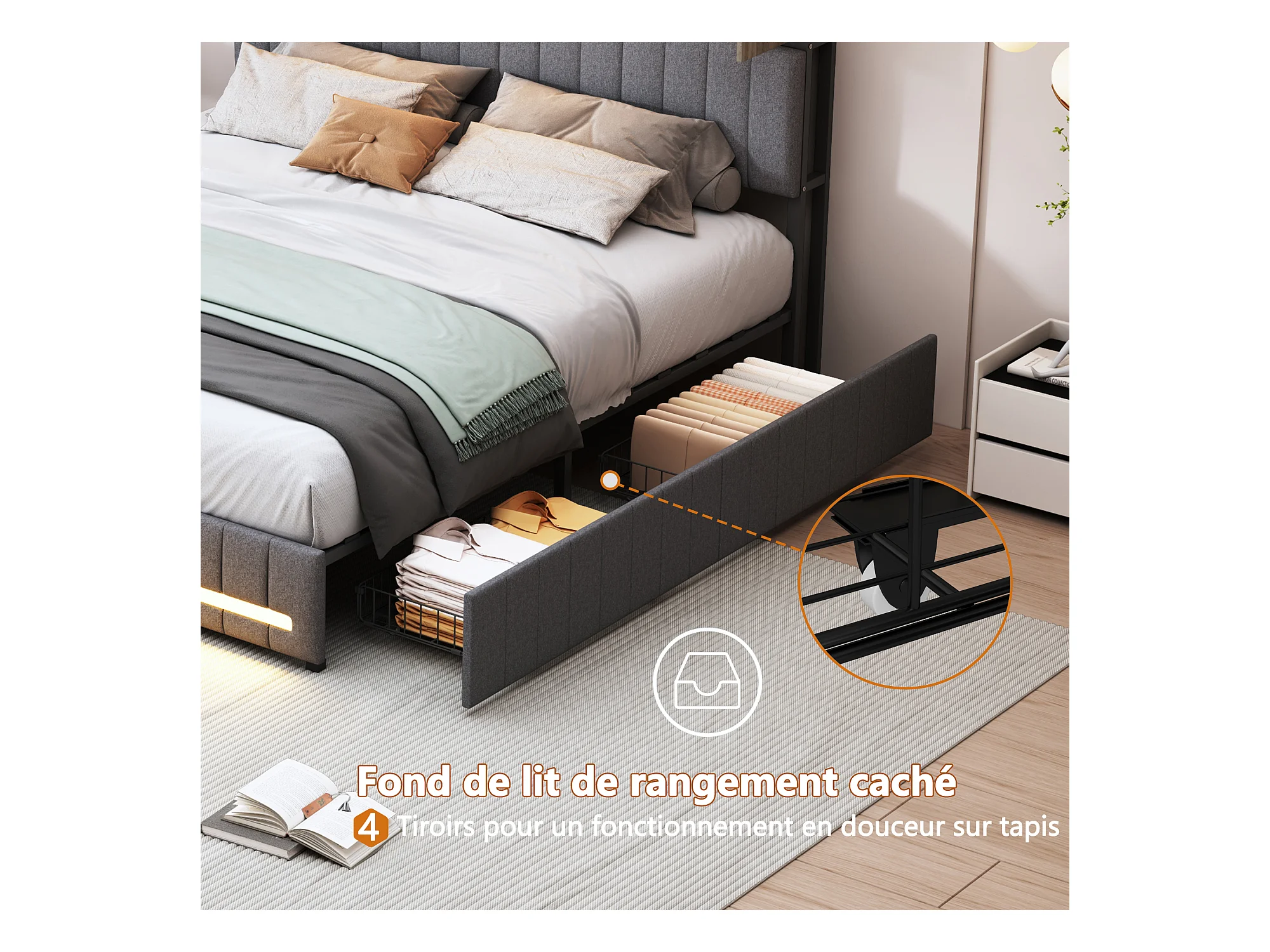 Lit 140 x 190 cm avec tête de lit LED et USB, 4 tiroirs de rangement, sommier à lattes, lin, gris