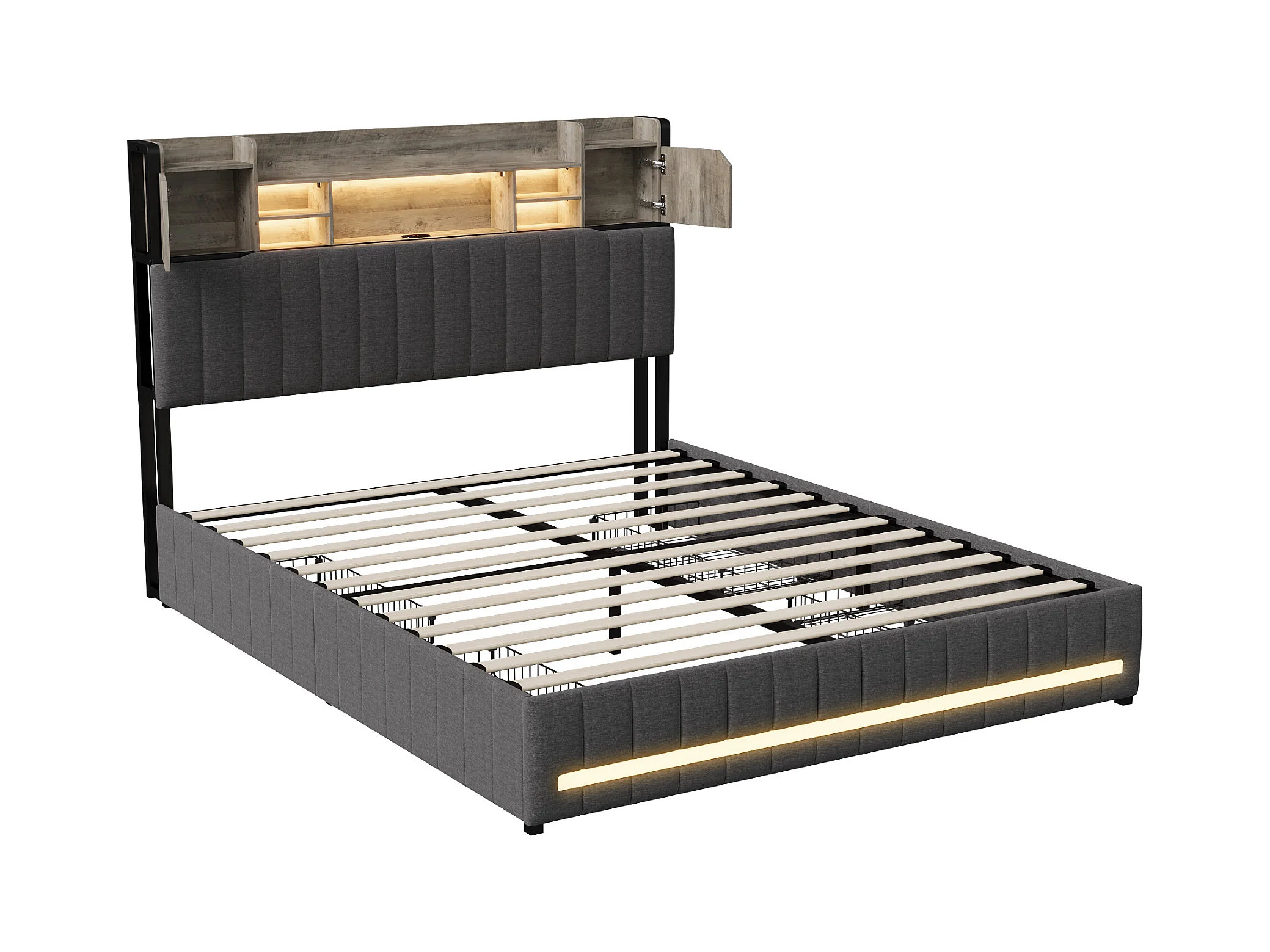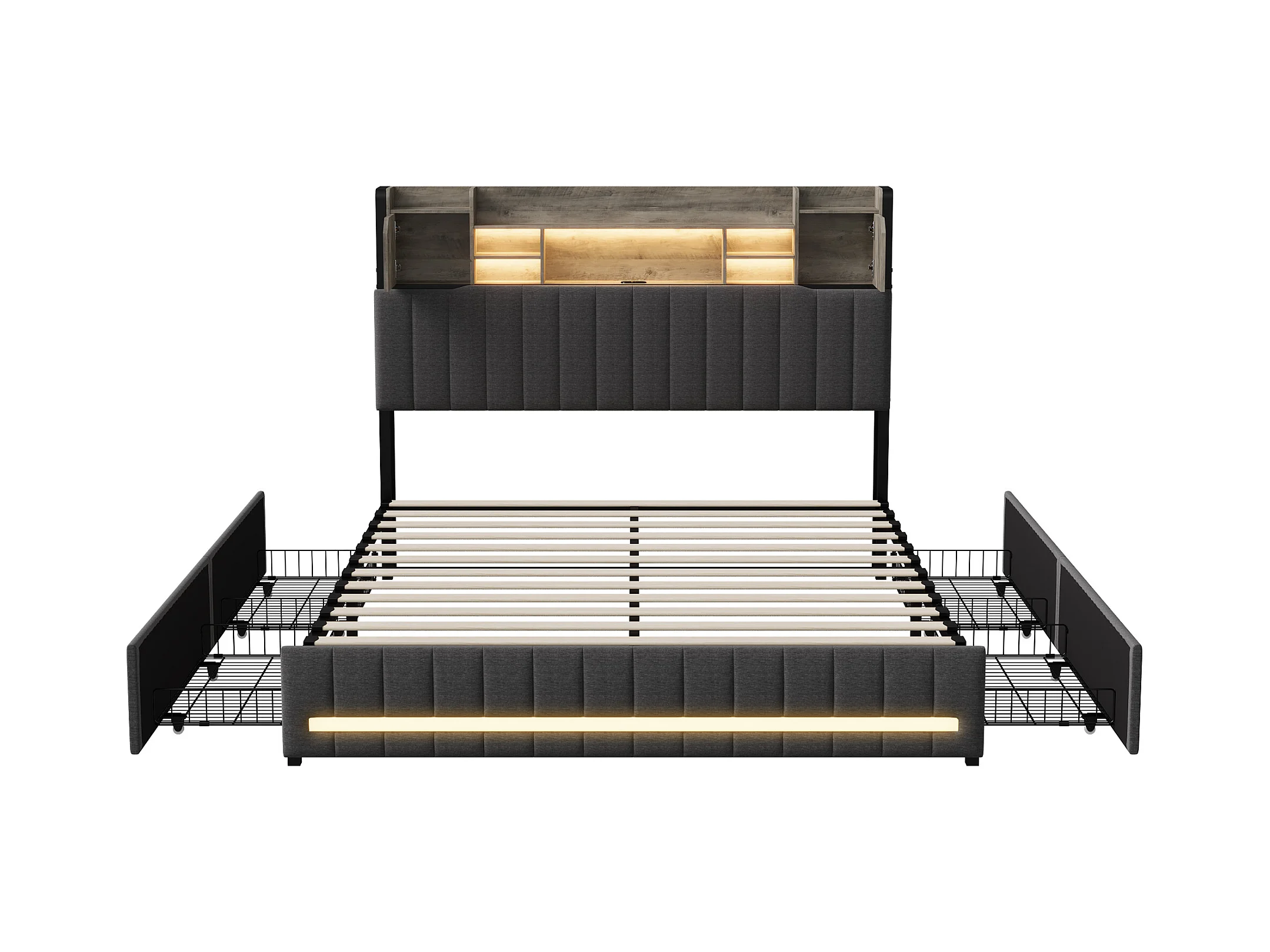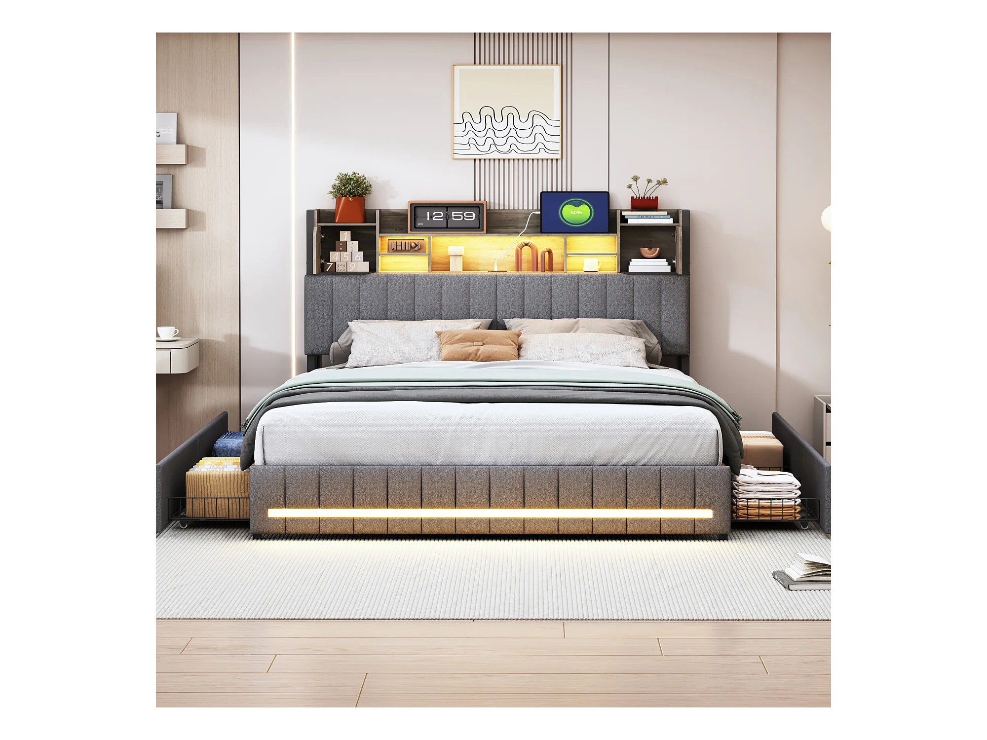 Lit 140 x 190 cm avec tête de lit LED et USB, 4 tiroirs de rangement, sommier à lattes, lin, gris