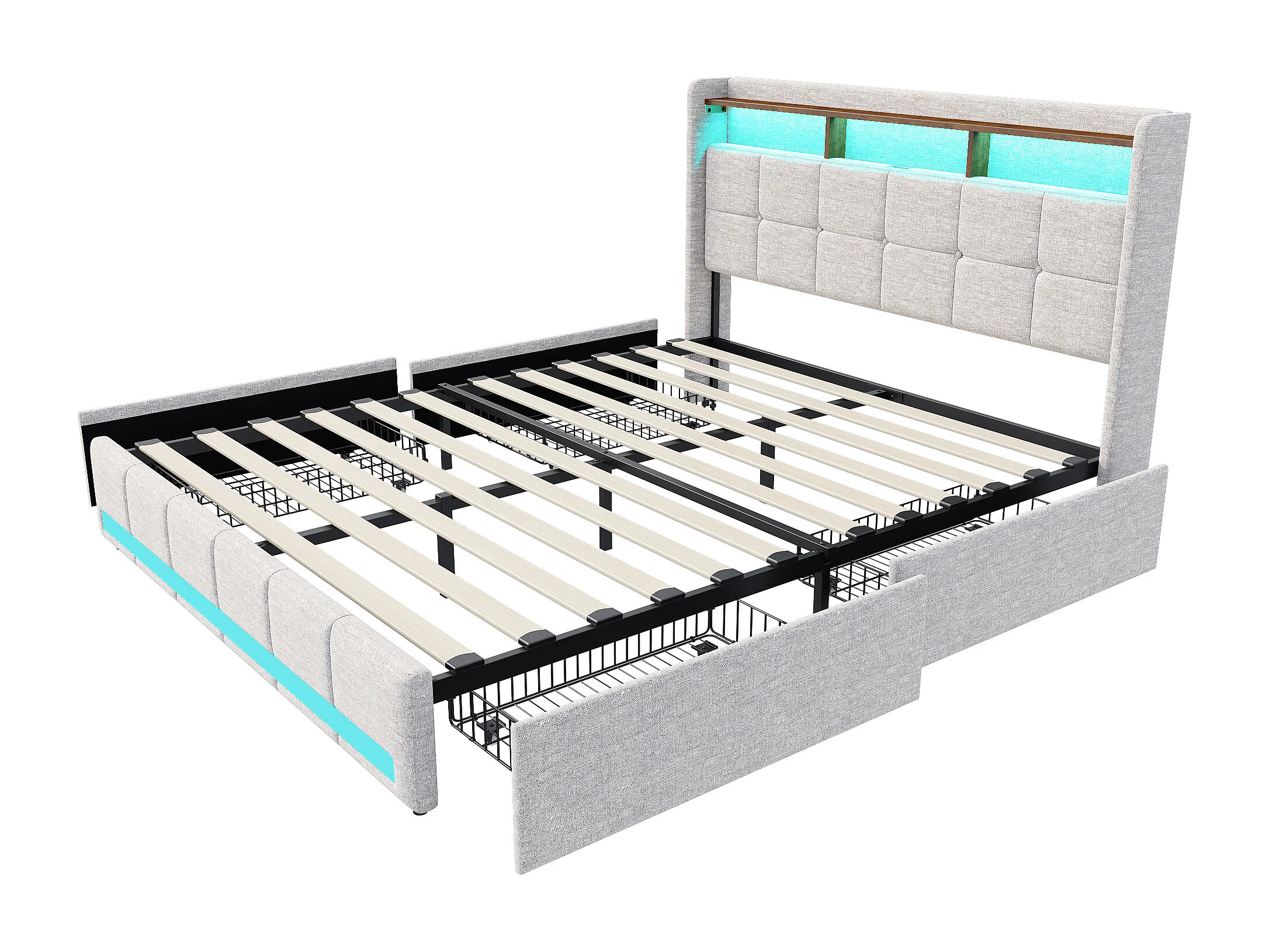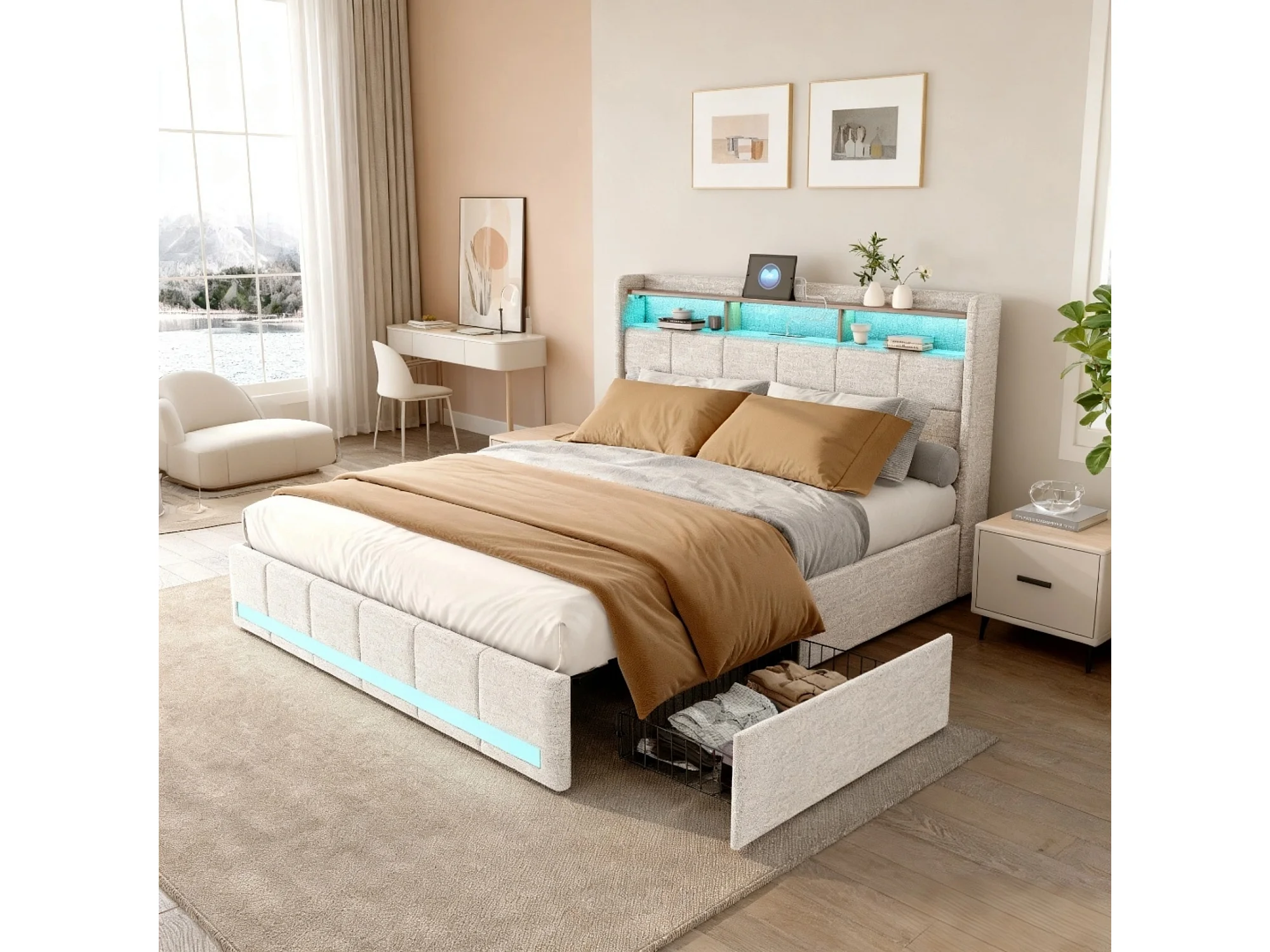 Lit adulte 140x190 cm - NEXU - LED -USB - sommier à lattes - tissu en lin - cadre de lit tiroir 140x200 cm - beige