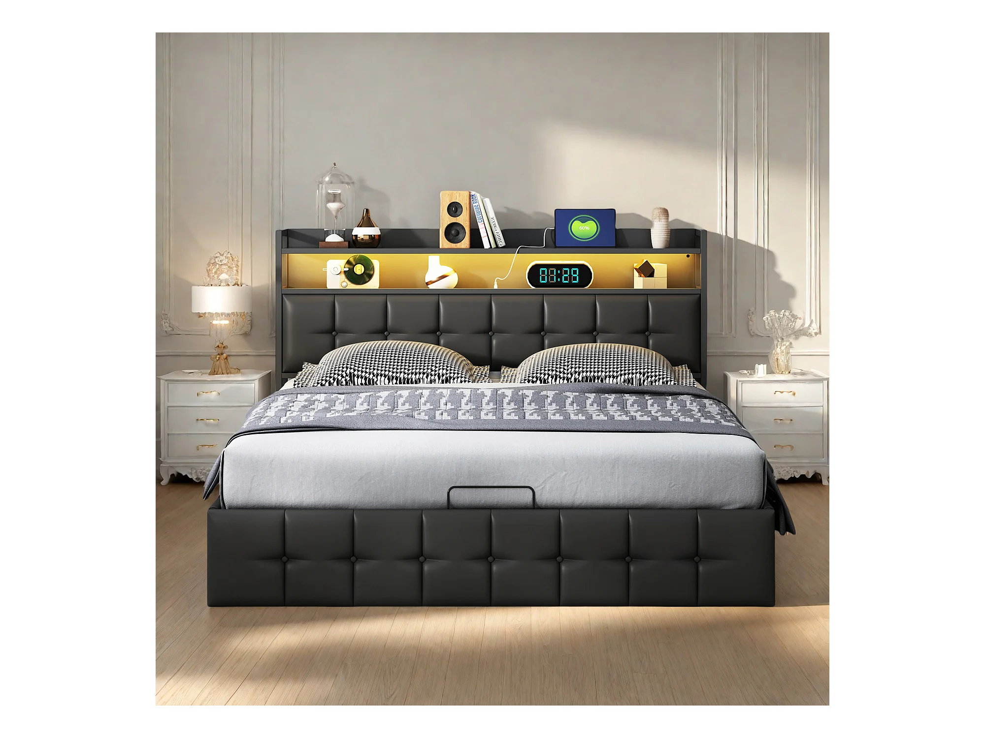 Lit 140x190 cm avec sommier à lattes - NEXU - LED- lit adulte 140x190 cm - tissu en PU - cadre de lit coffre 140x190 cm - noir