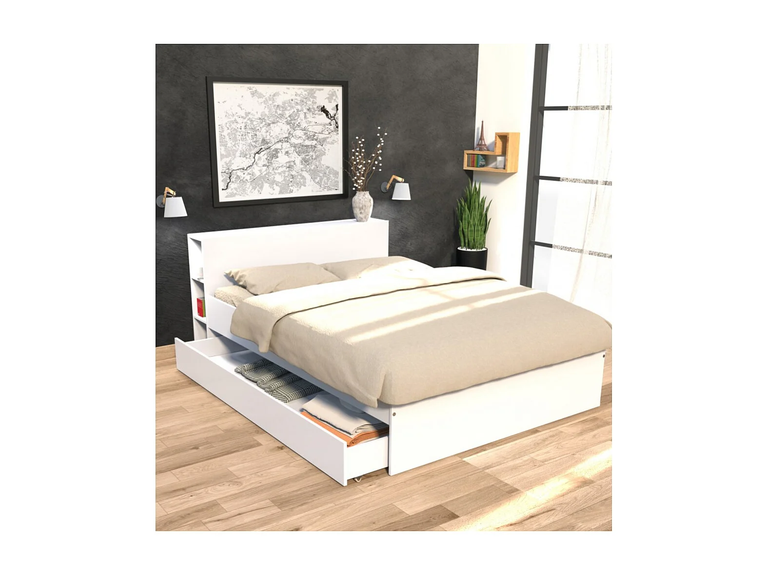 Lit RIGA 140x190cm + tête de lit + 1 tiroir / Blanc