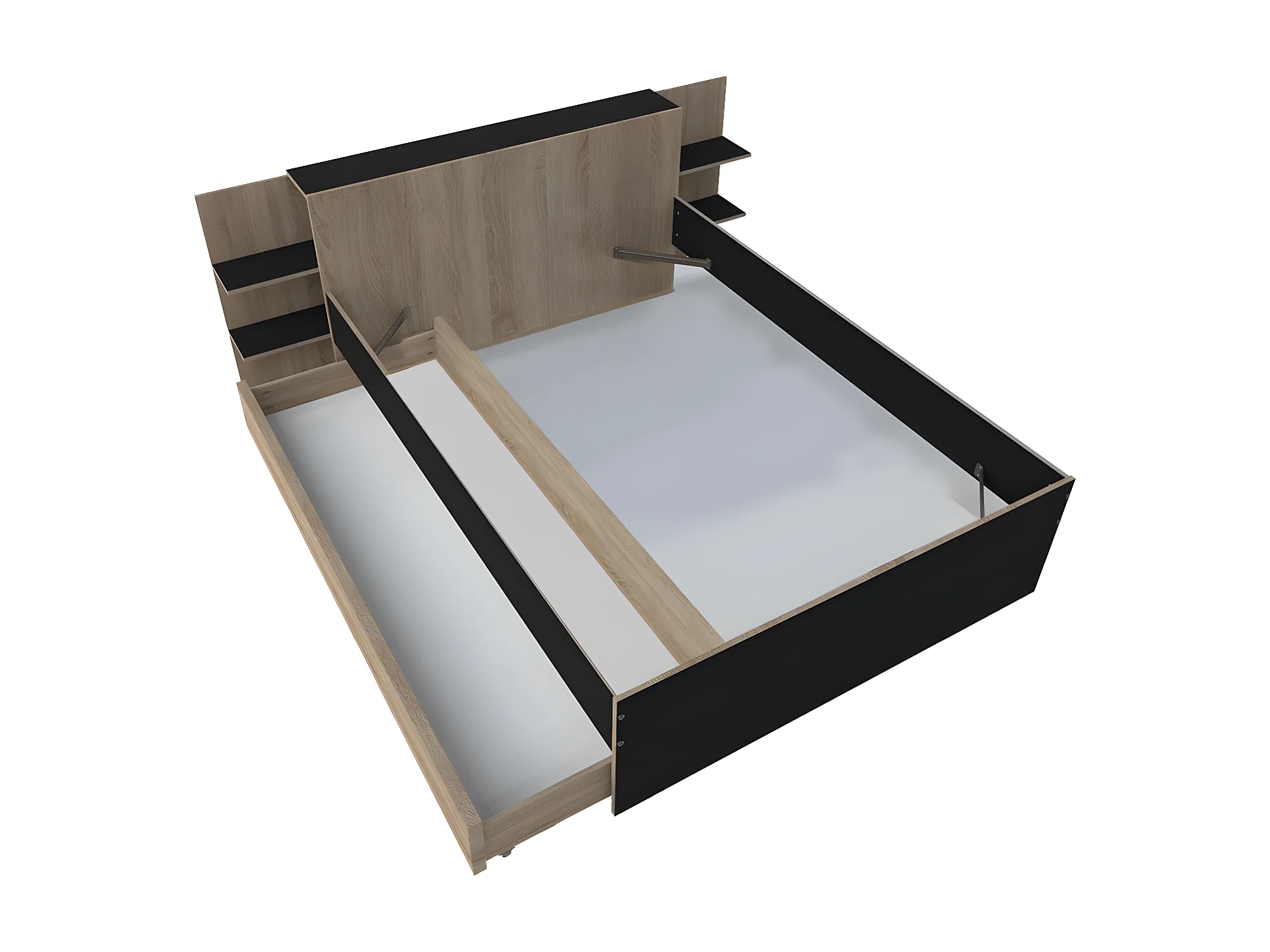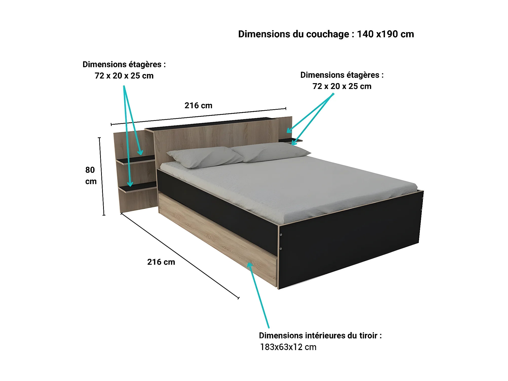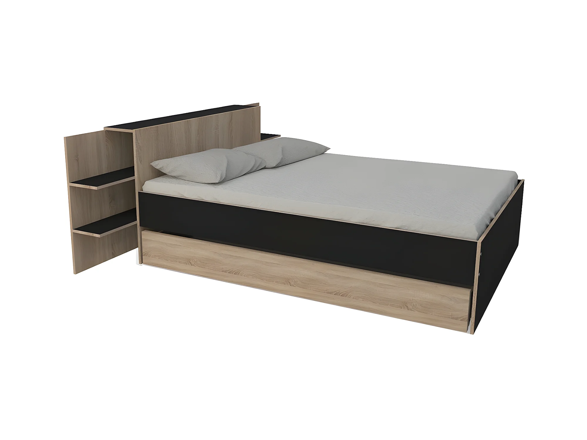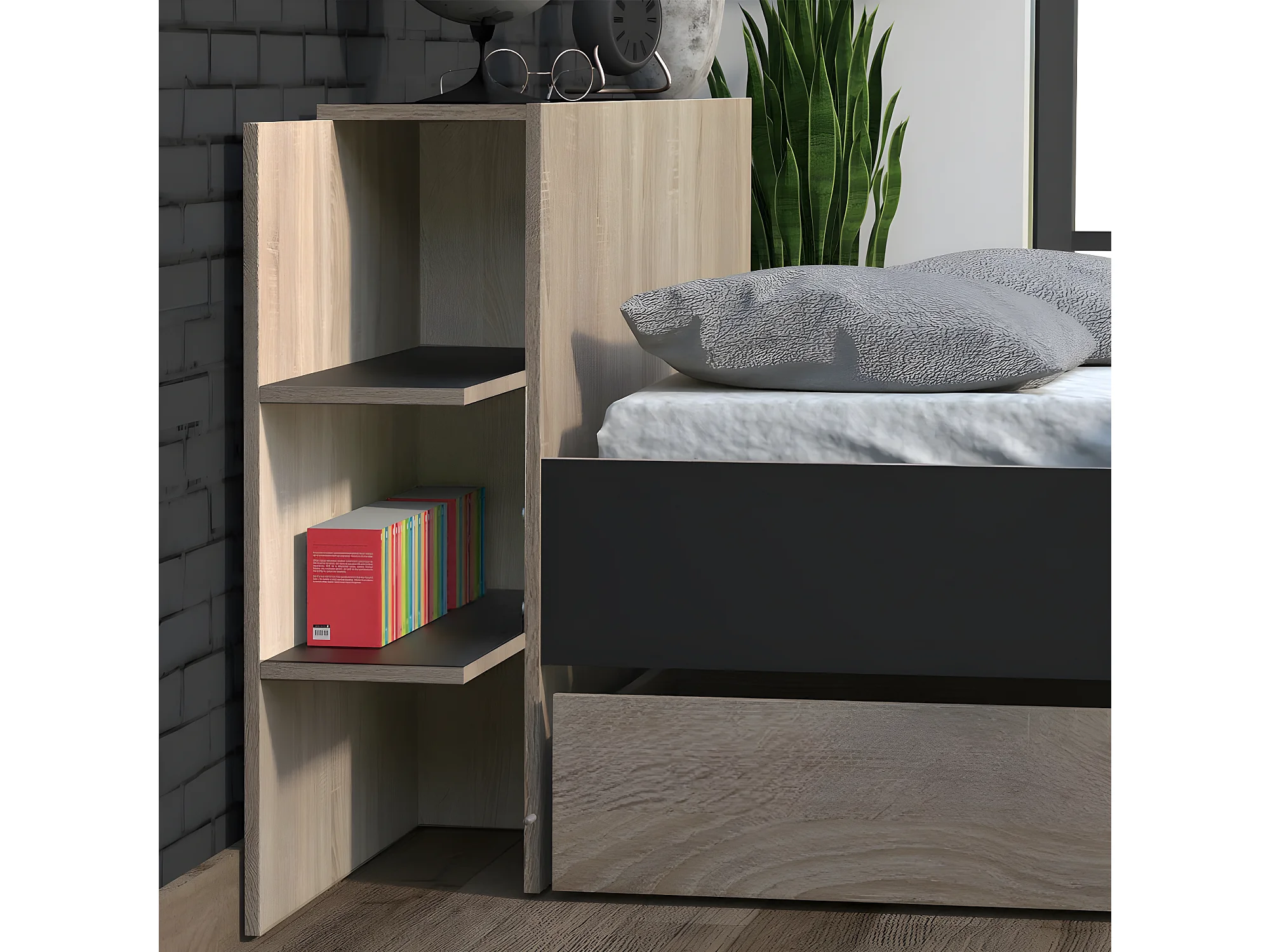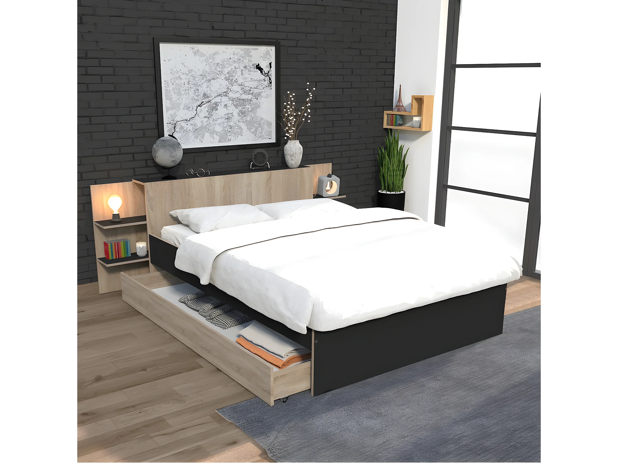 Lit CITY 140x190 + tête de lit chevet+ 1 tiroir / Décor Noir & chêne blanchi