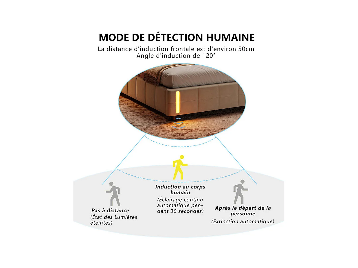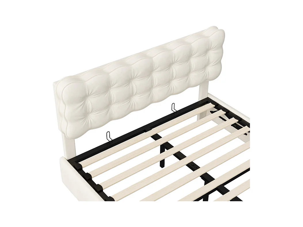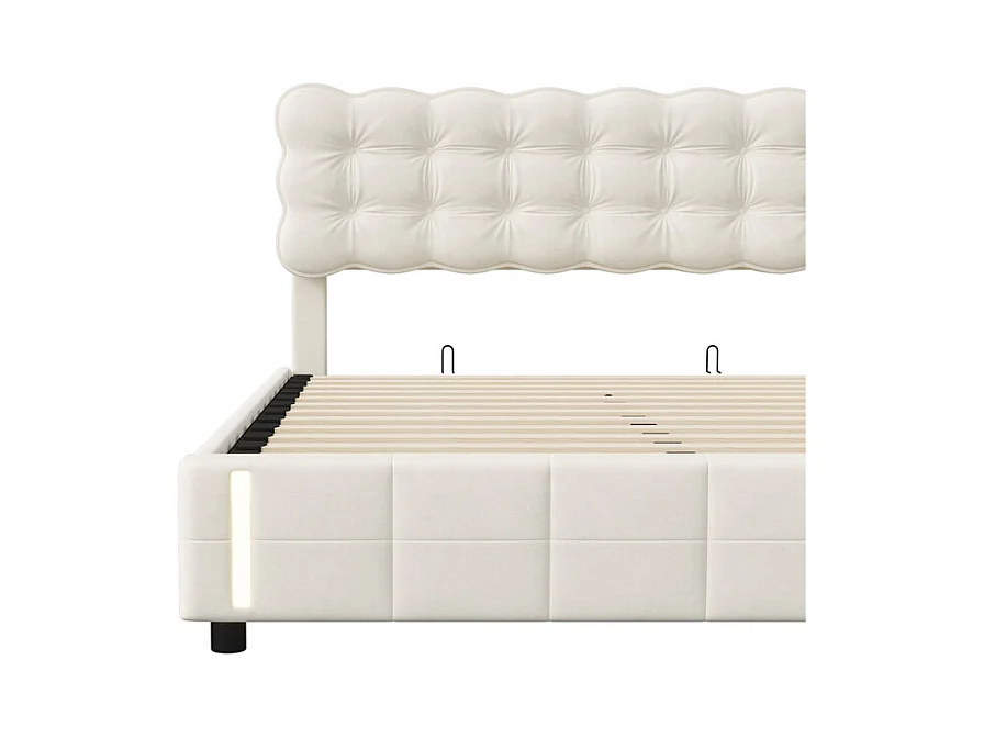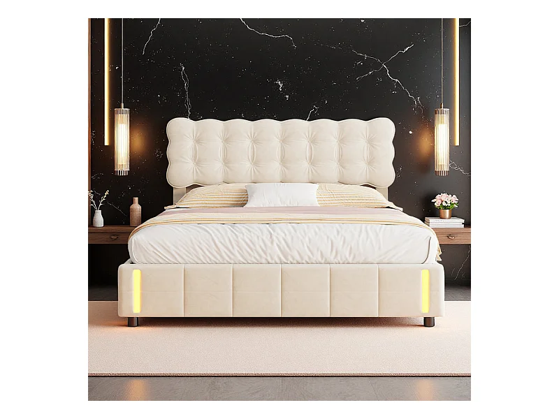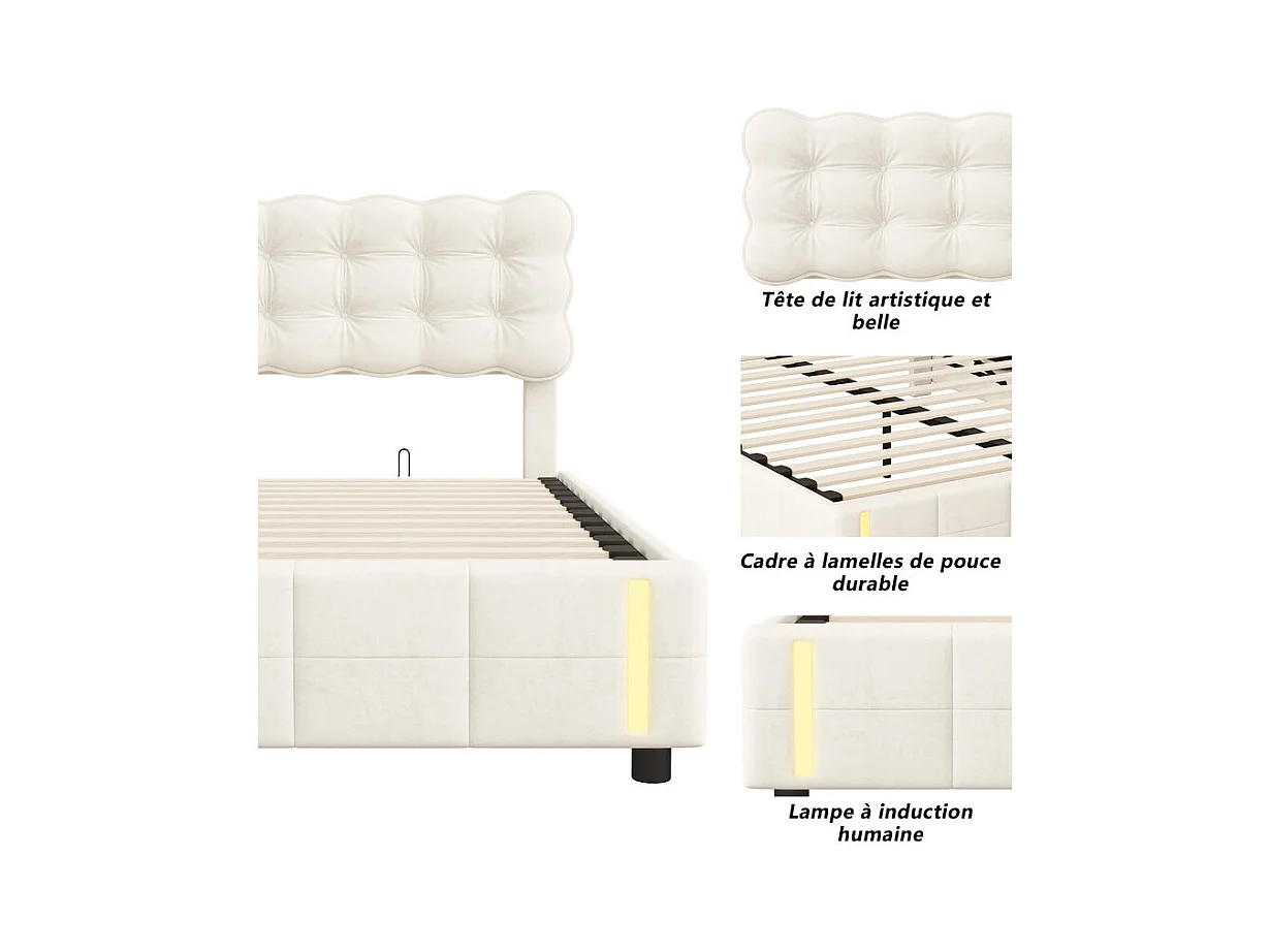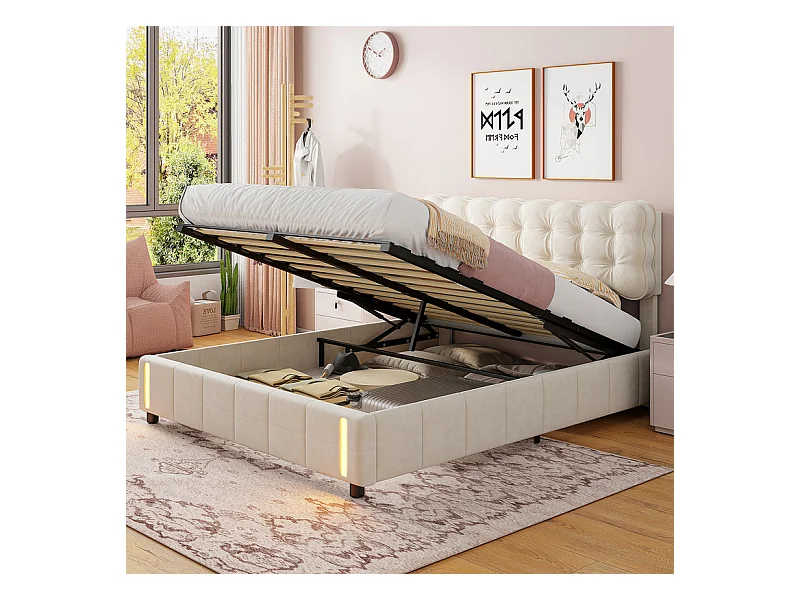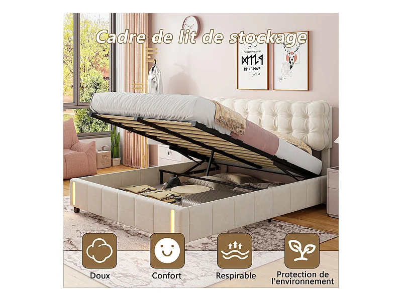 Lit 140x190 Lit Coffre Hydraulique, Grand Rangement + Lumière à Induction, Tête de Lit Velours Beige - Lit Couple Moderne Idéal Chambre Étagère