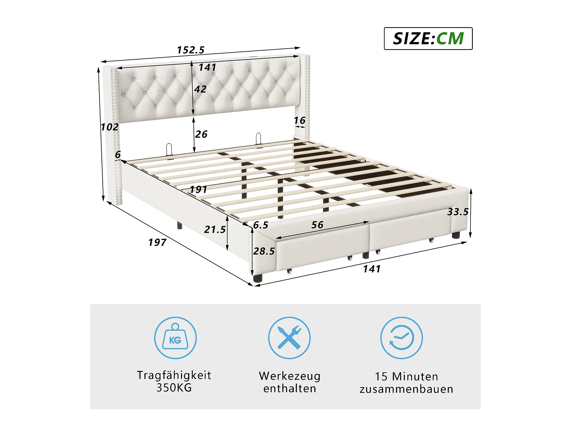 lit 140x190cm avec Rangement et LED, Sommier à Lattes, Lit Double capitonné avec USB, Velours, Beige