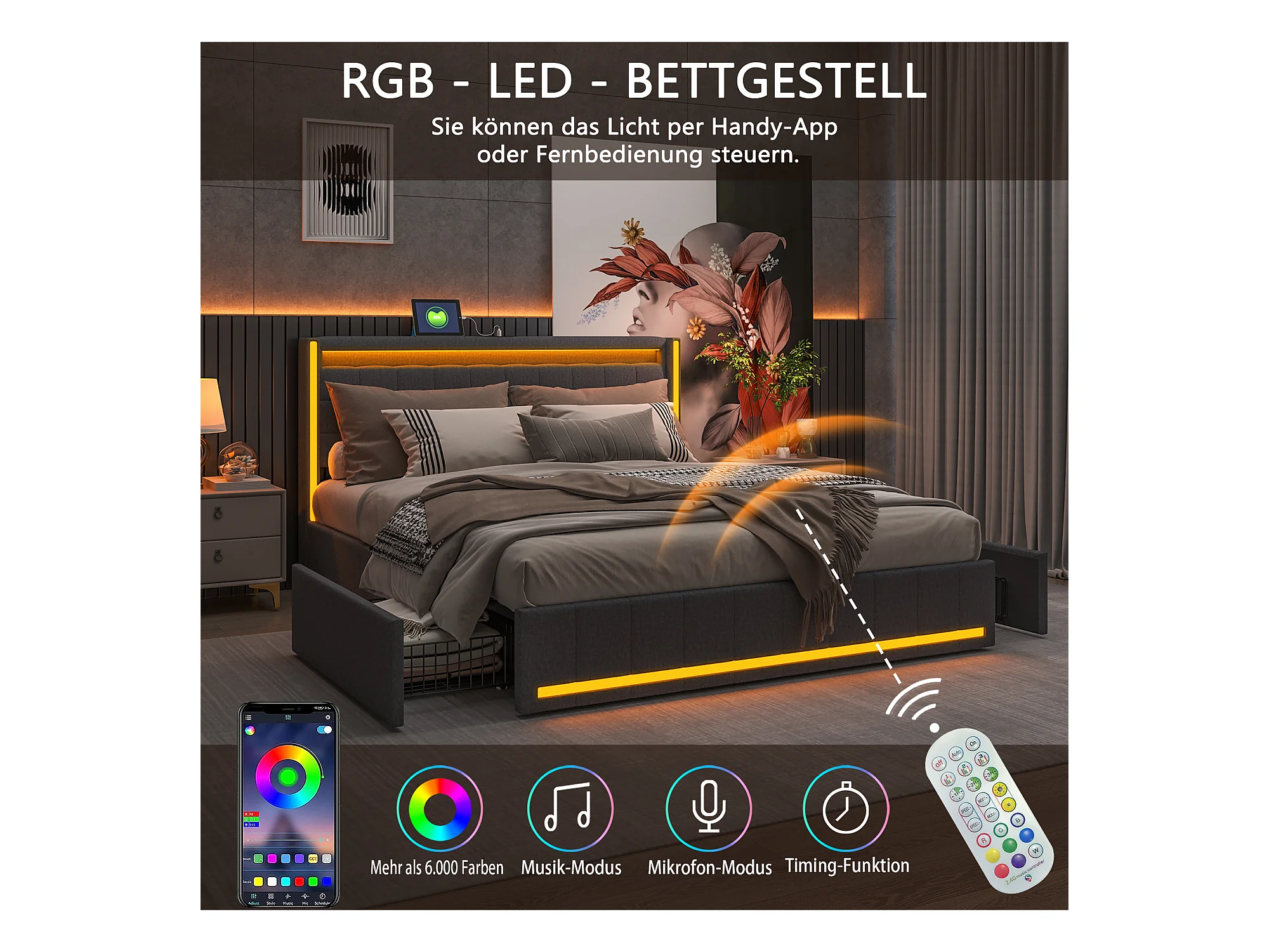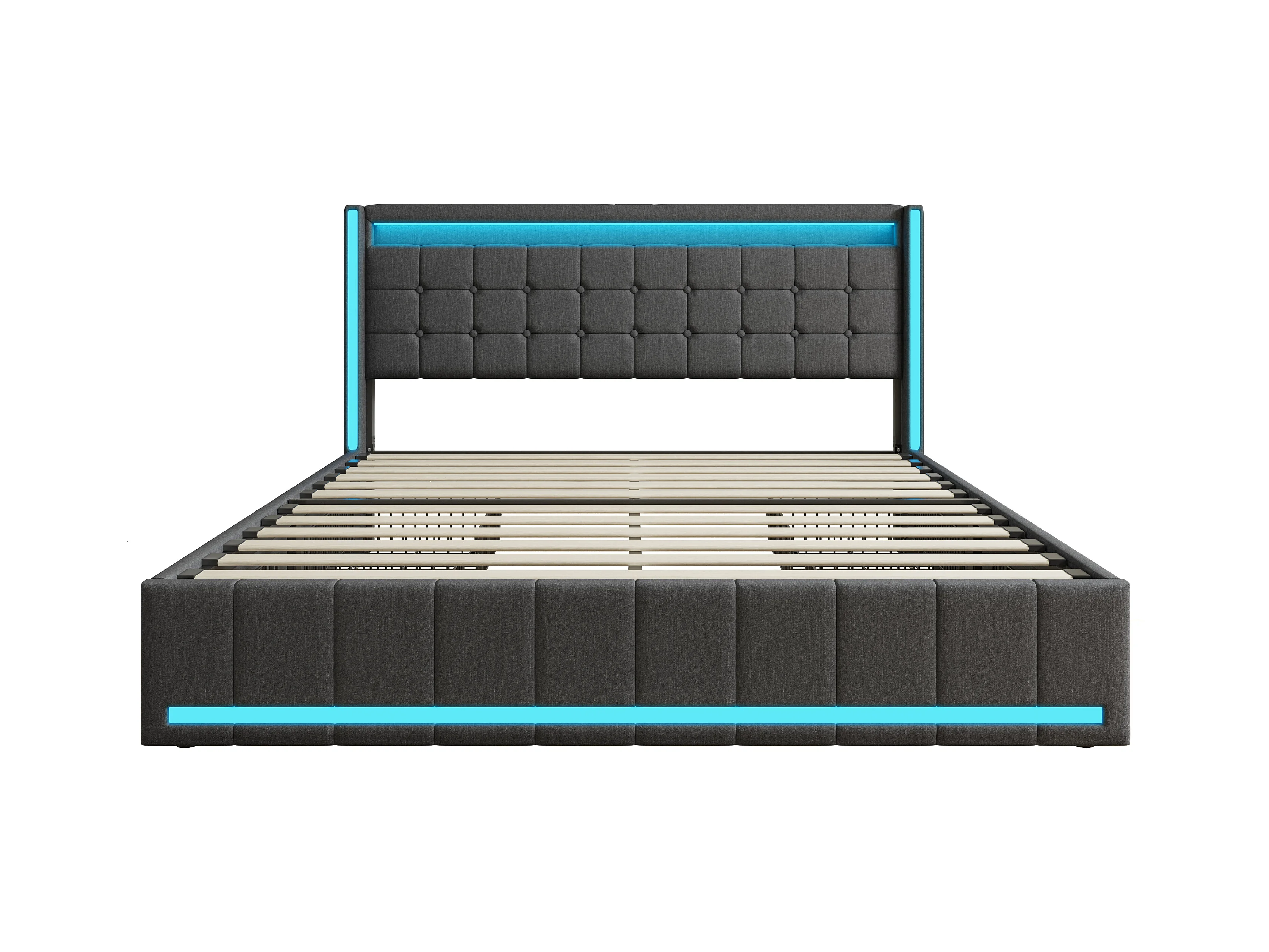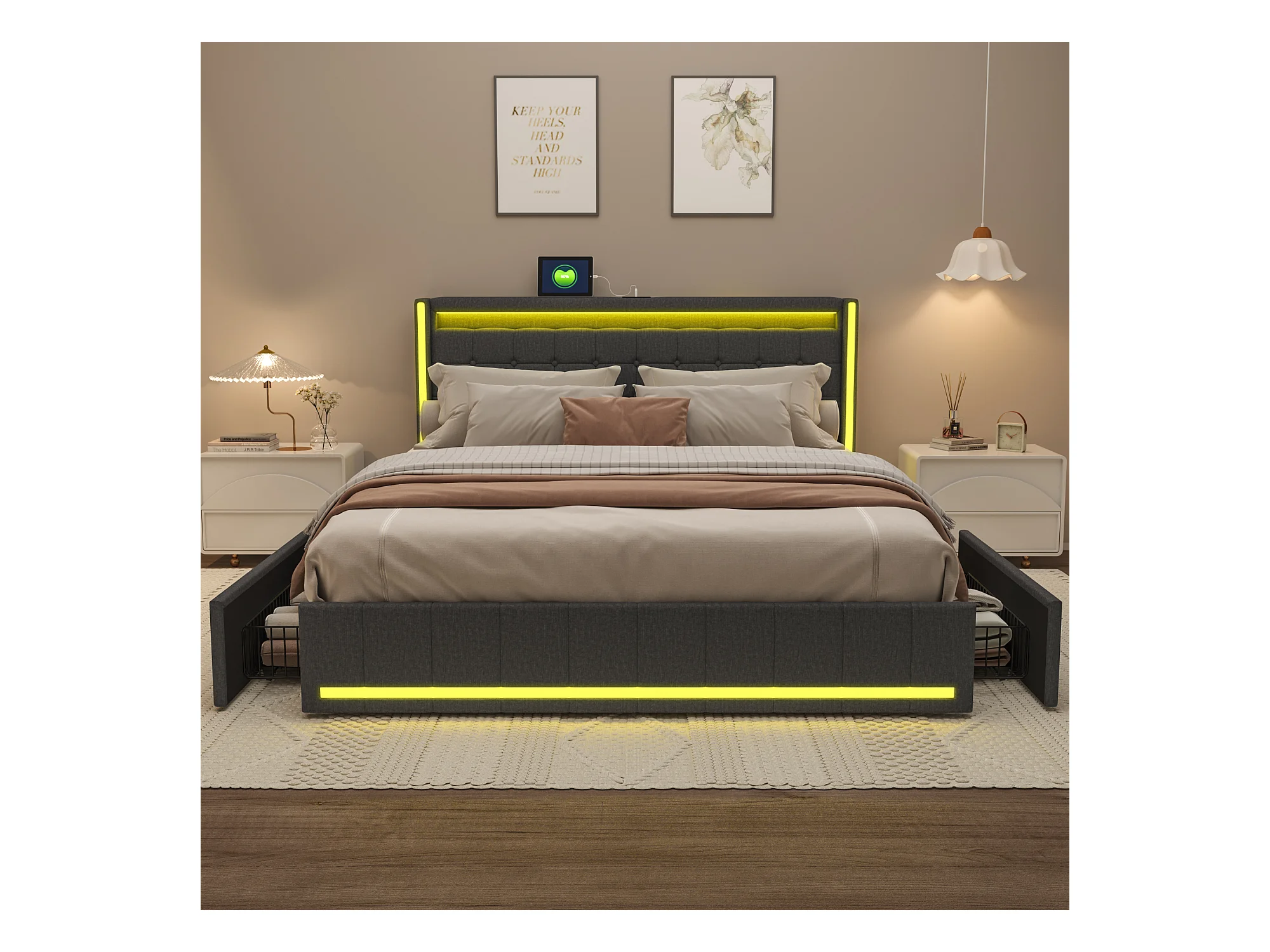 Lit 140x200 cm avec LED et ports USB Type C, lit Queen 140x200 cm avec sommier à lattes et 4 tiroirs, tissu en lin, gris foncé