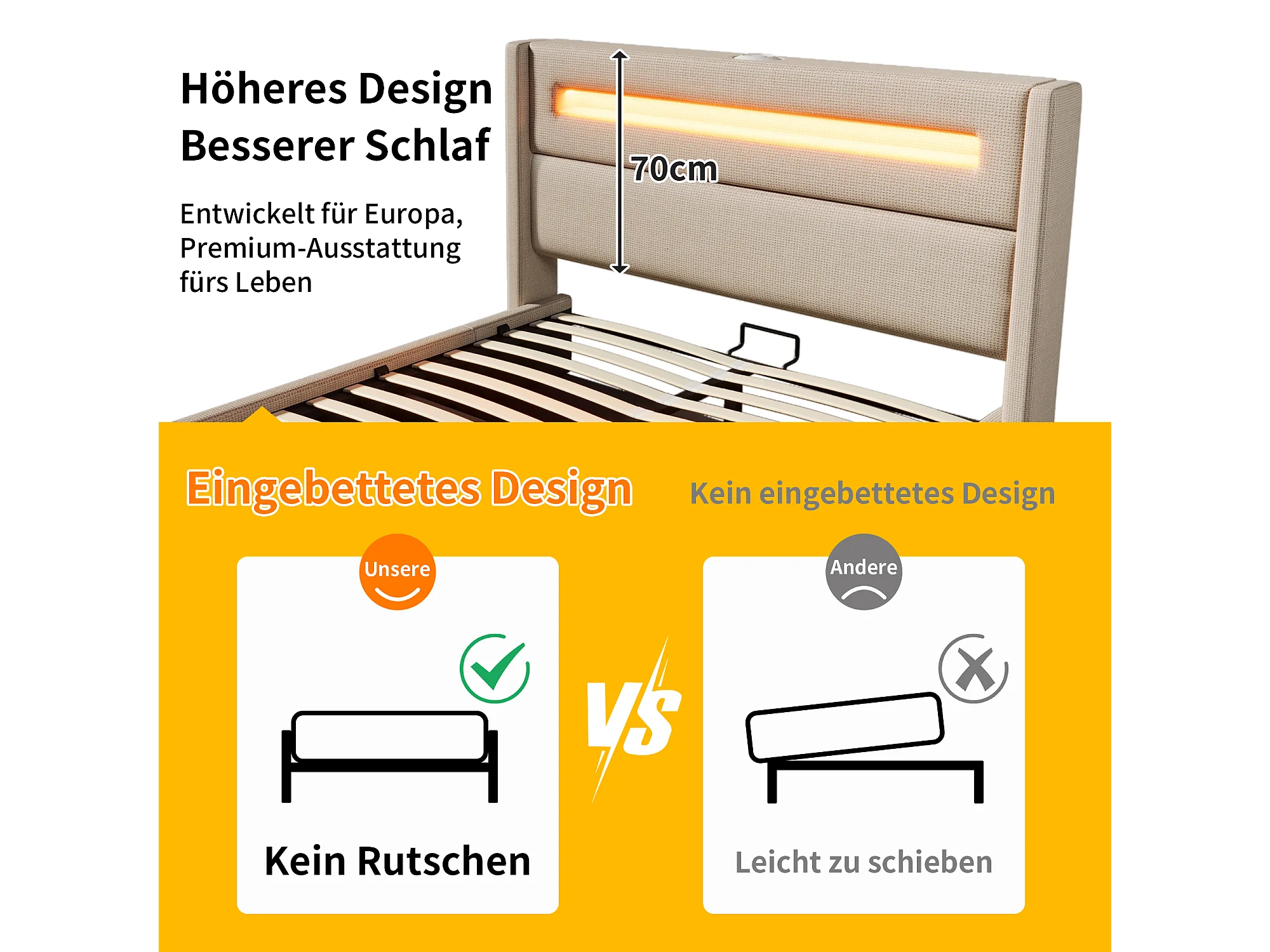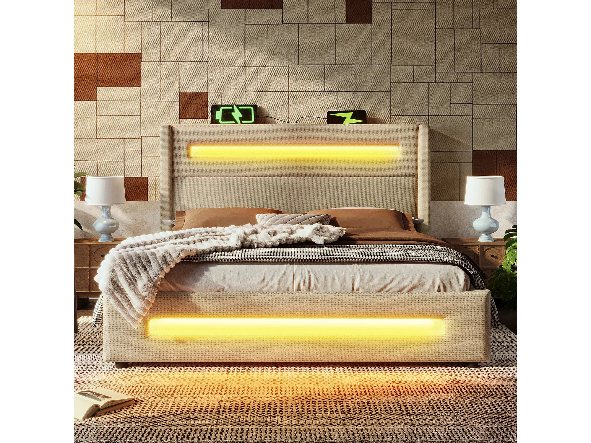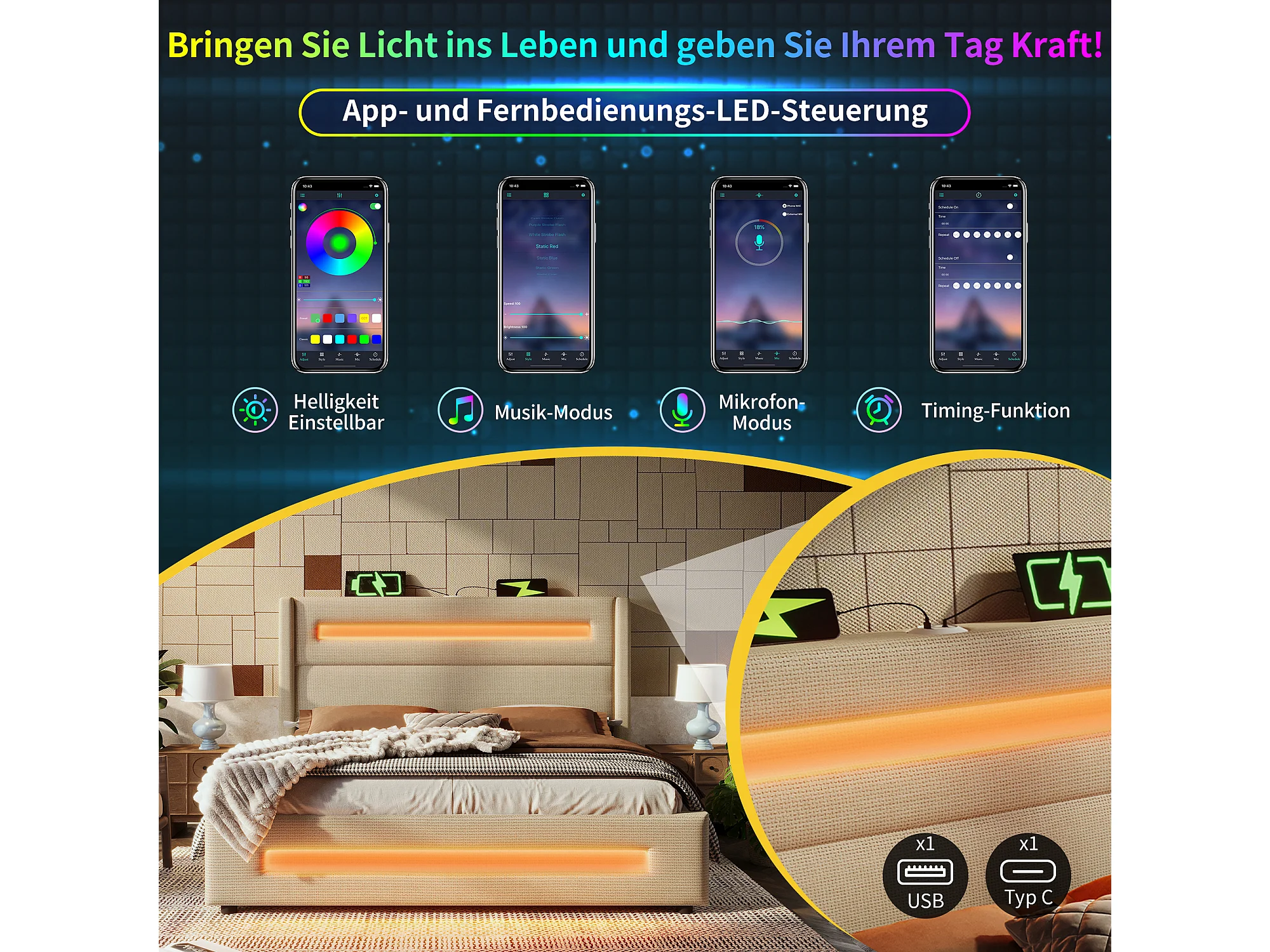 Lit 140x200 cm avec LED, stockage hydraulique, chargement USB Type-C, cadre métallique, lattes bois, lin beige (219x155x121 cm)