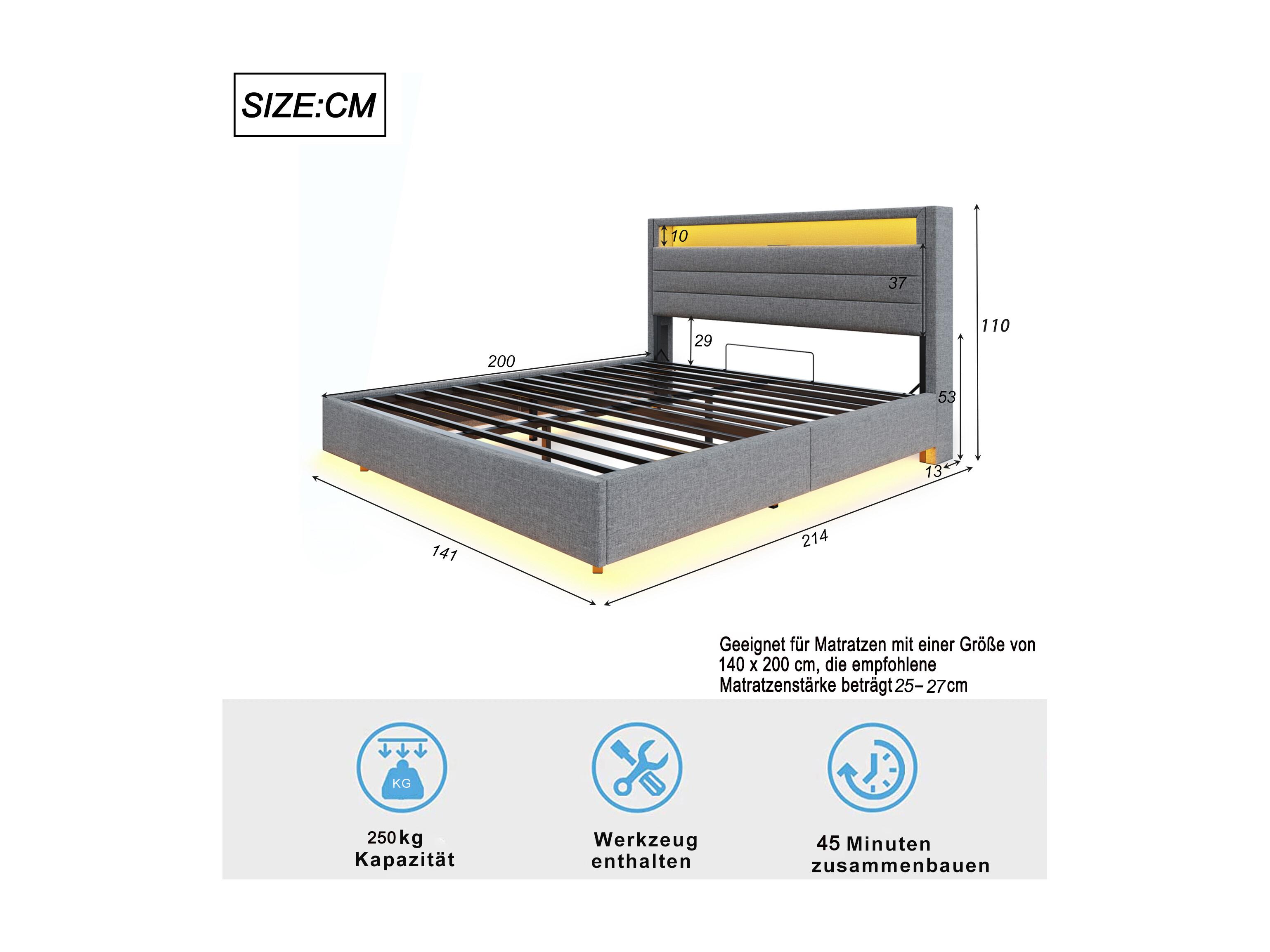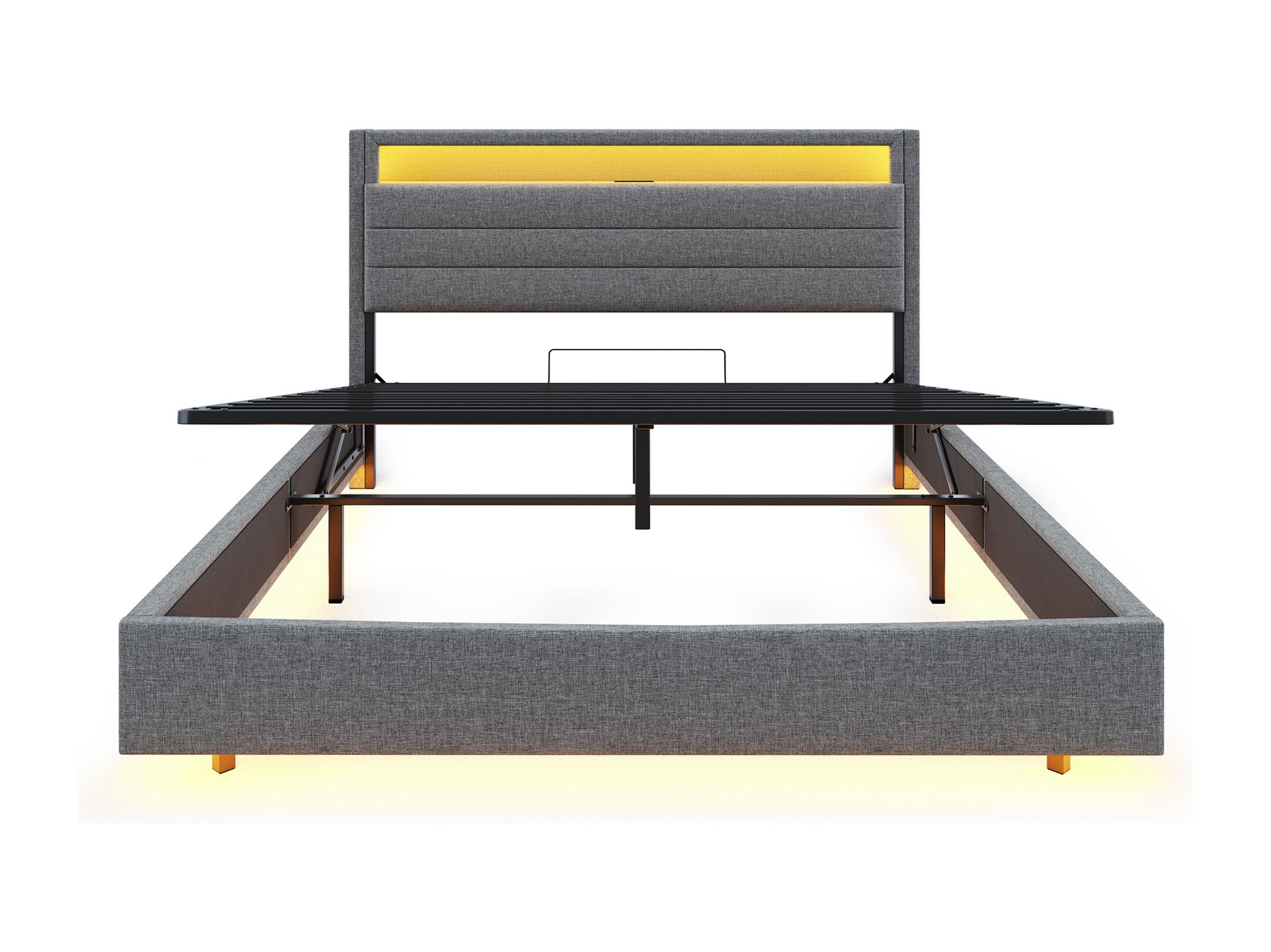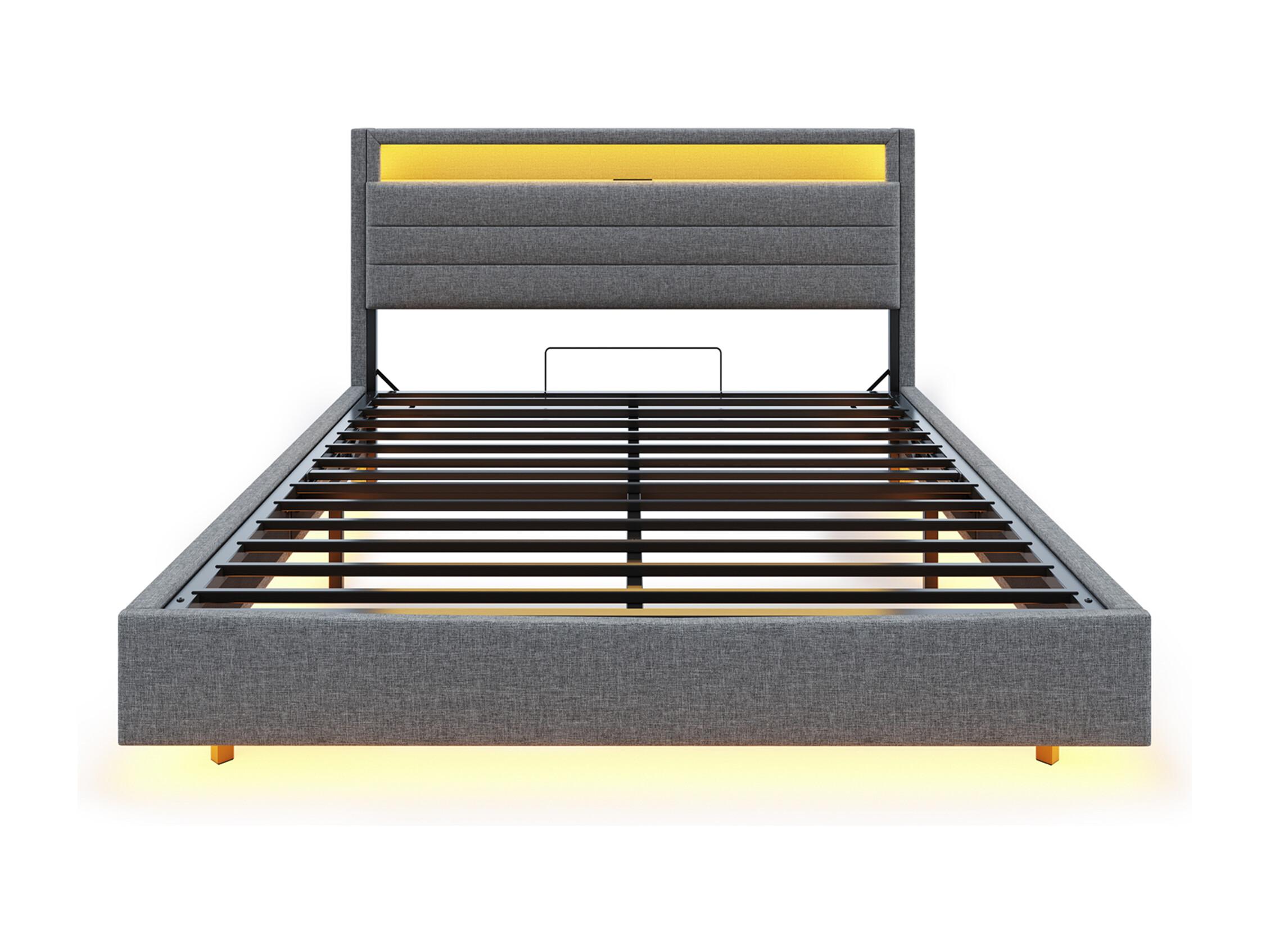 Lit 140x200 cm gris avec cadre flottant hydraulique, rangement, port USB, lumière LED, tête de lit réversible, tissu en lin