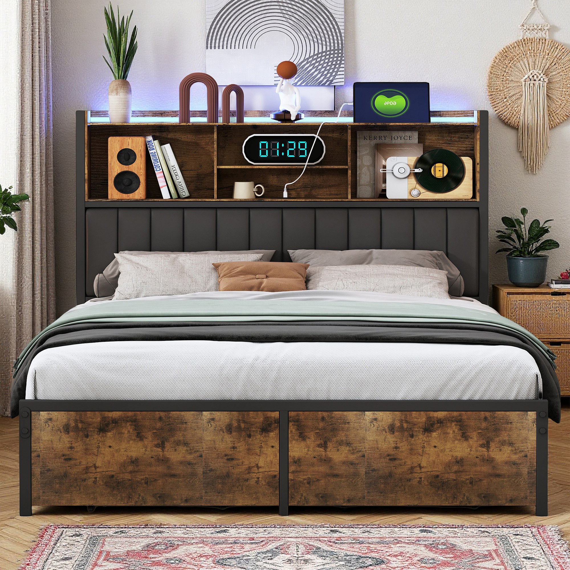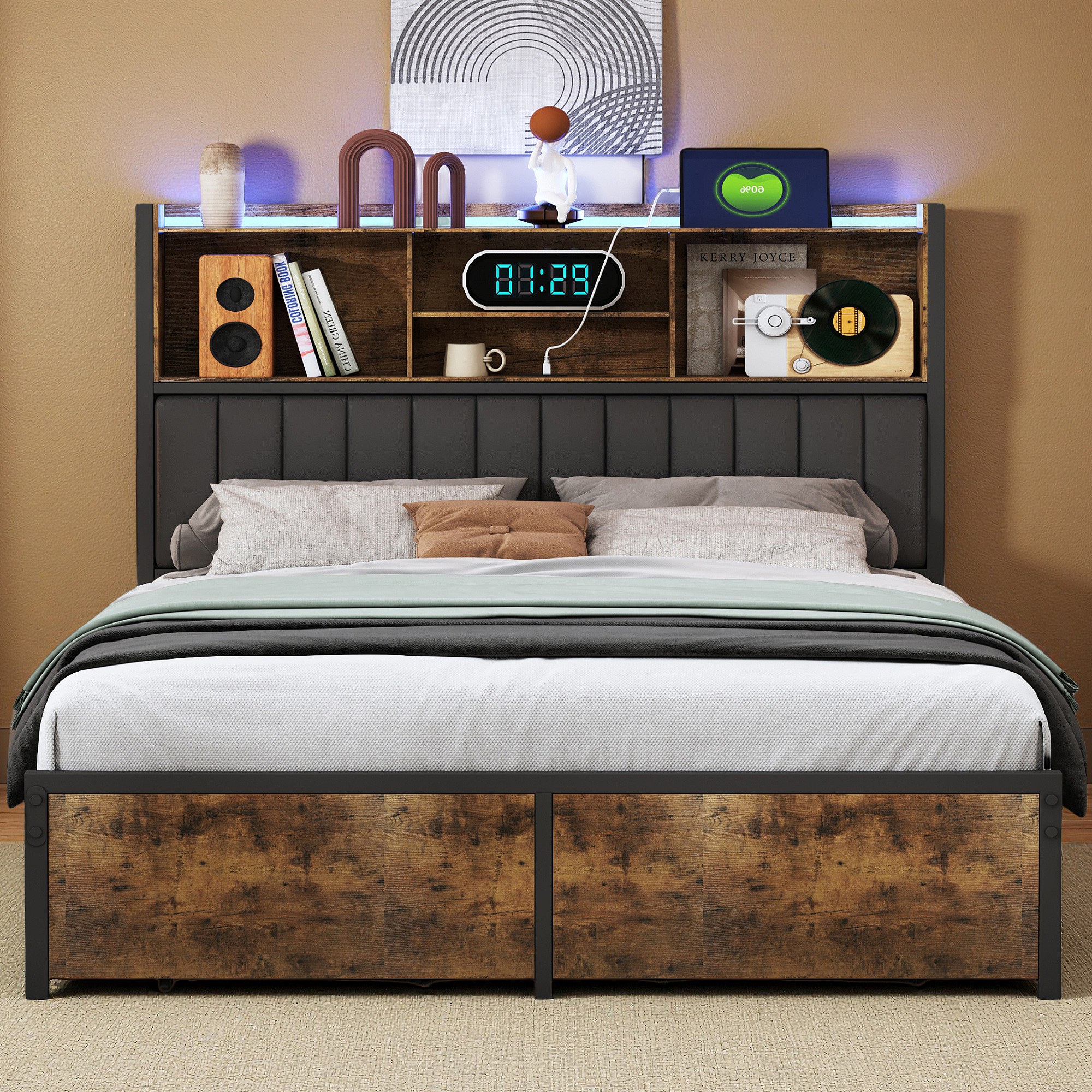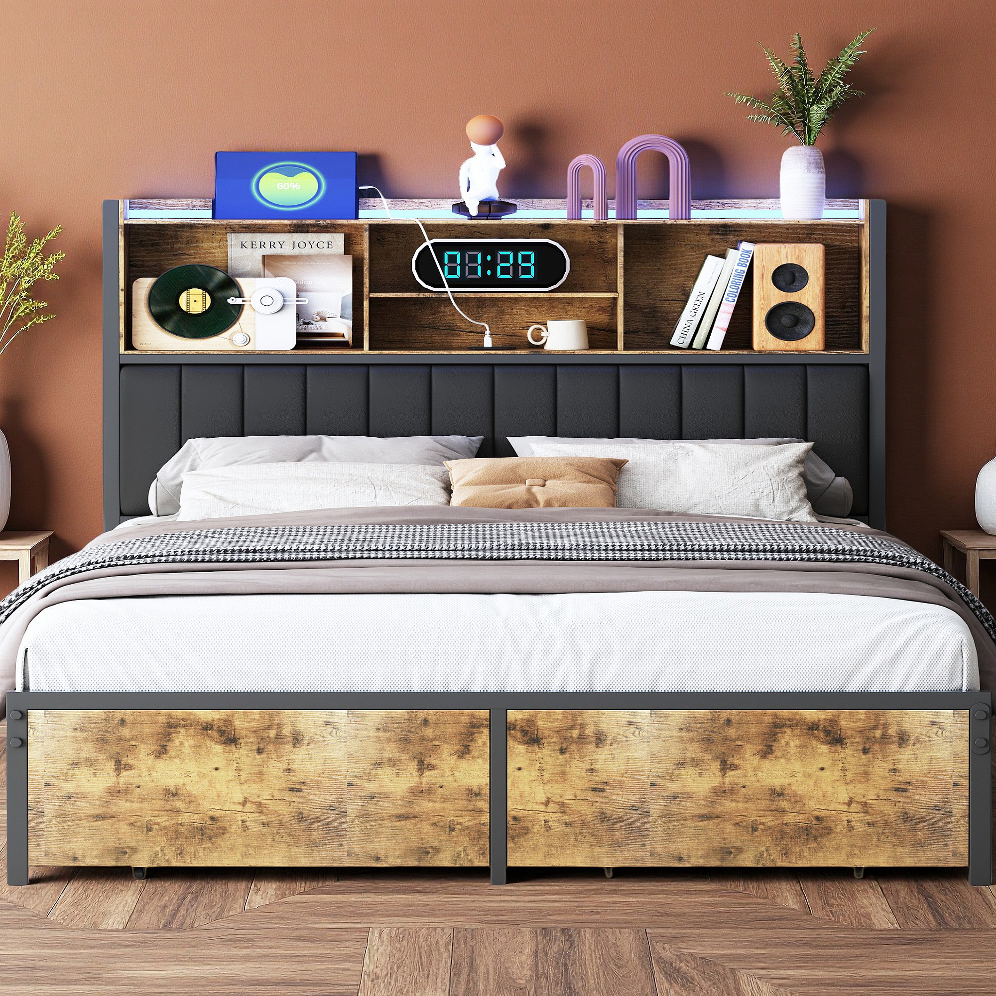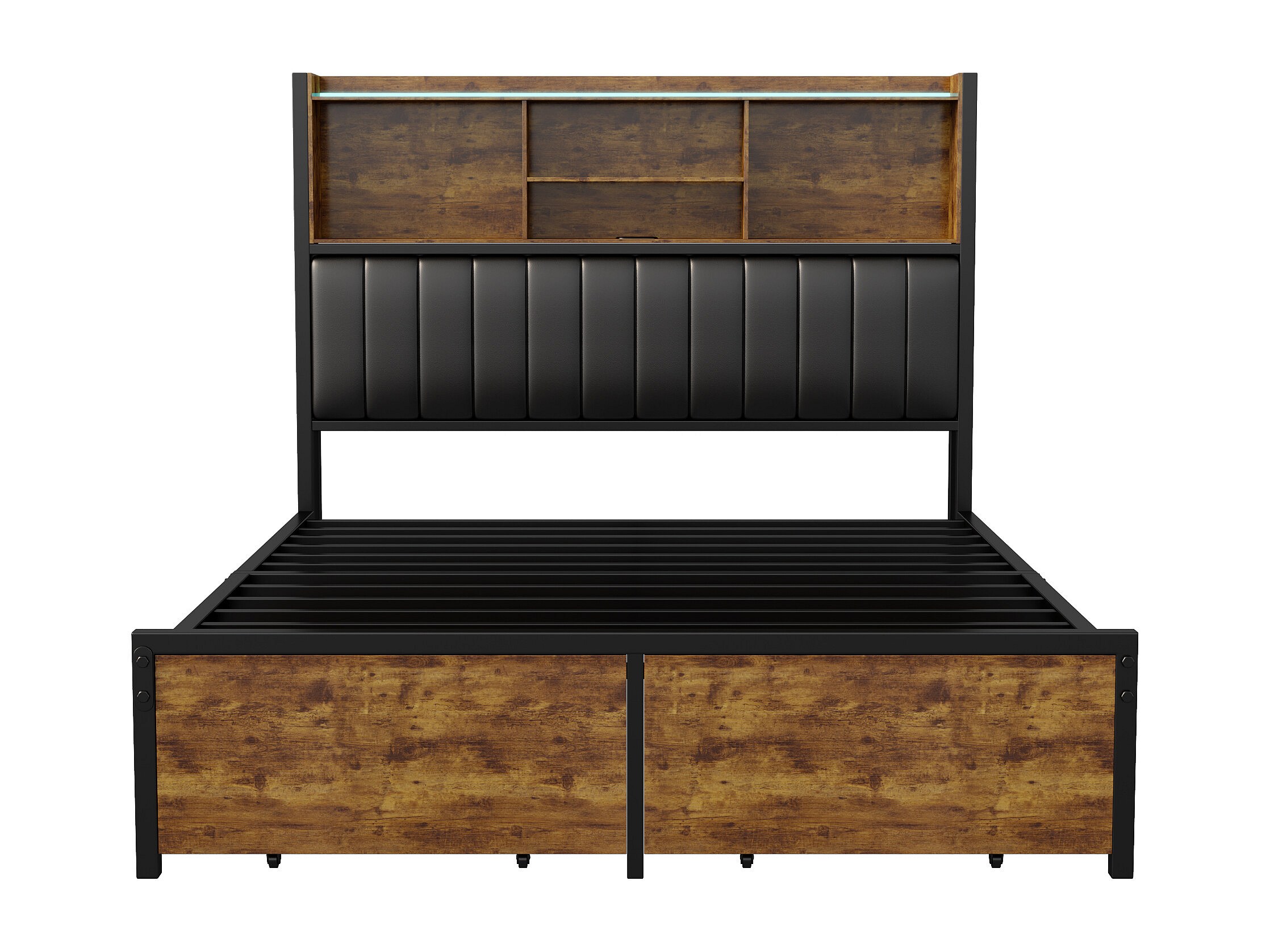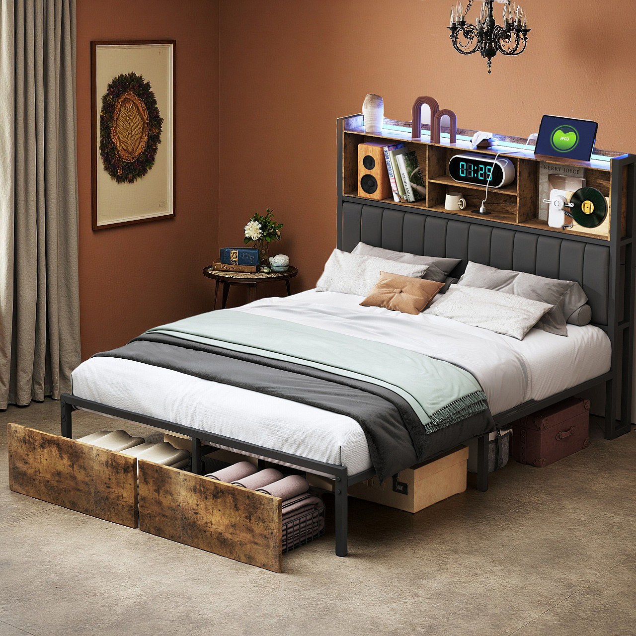 Lit 140x200 cm - NEXU - LED - Type C et USB - 2 tiroir - tissu en PU - Style industriel - cadre de lit double 140x200 cm - noir