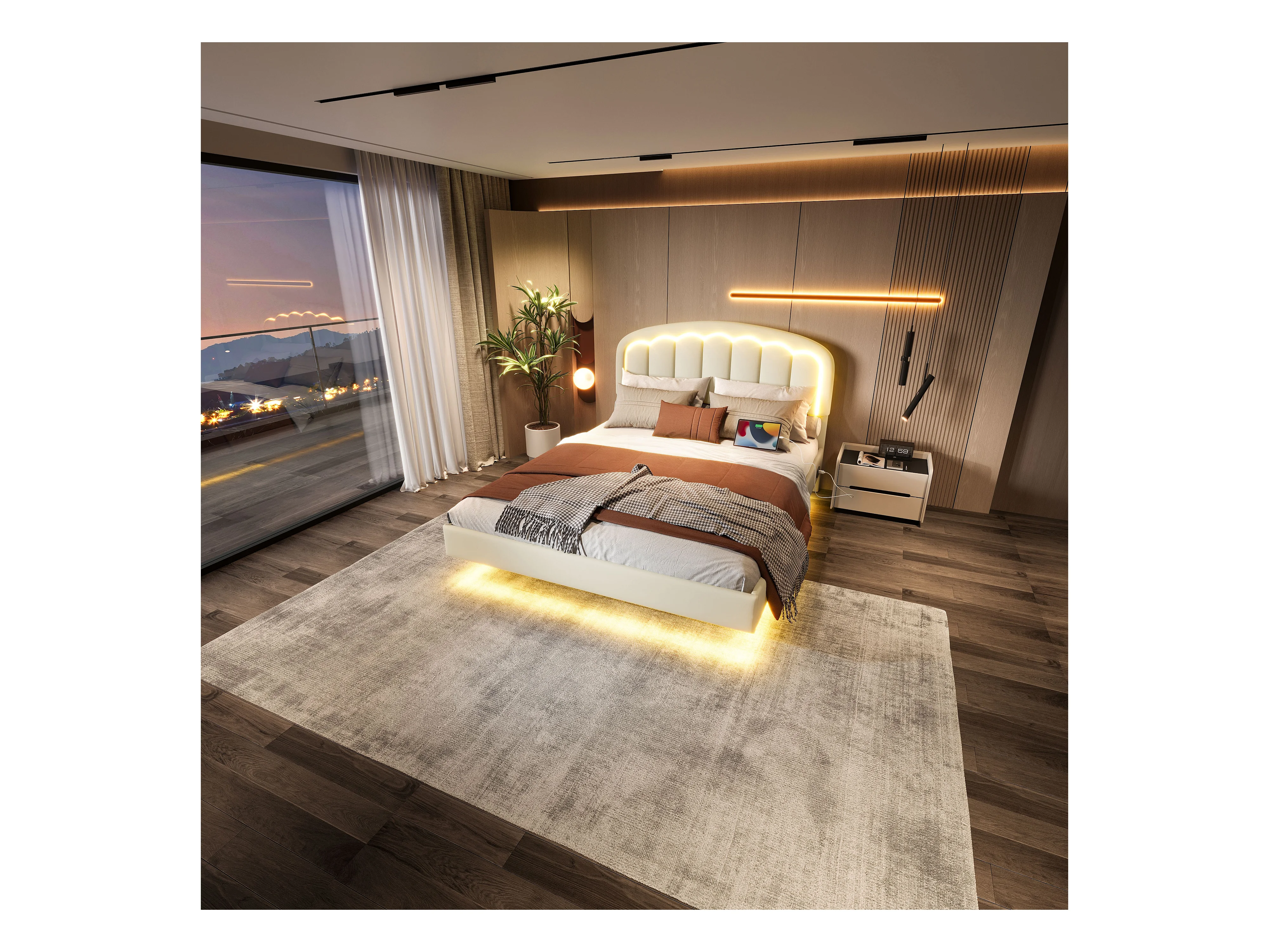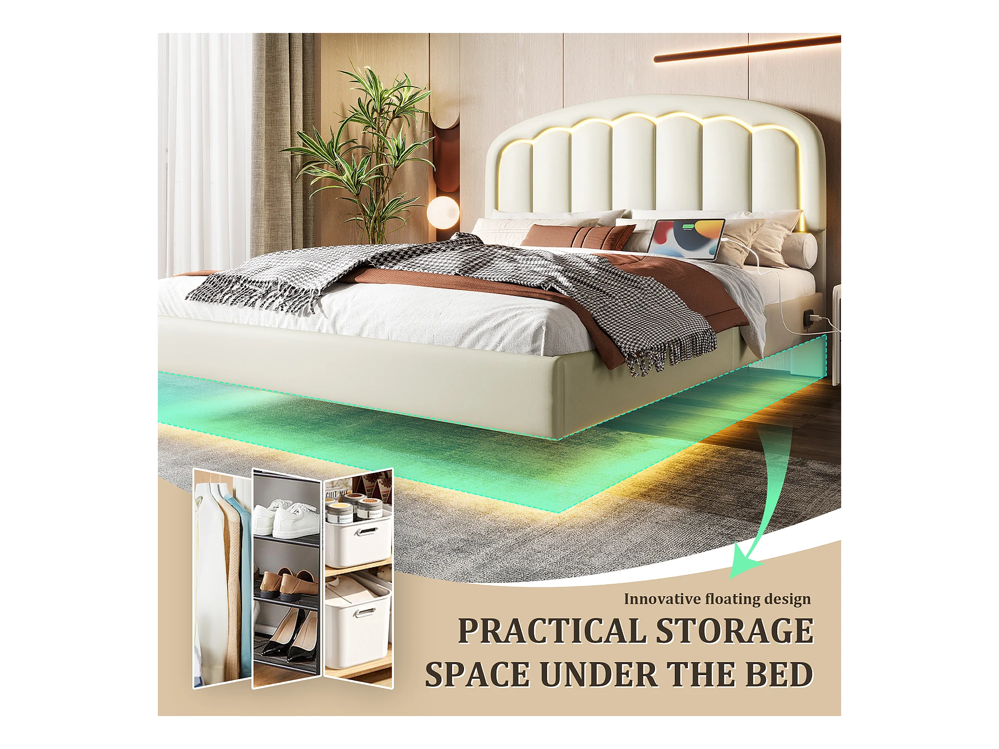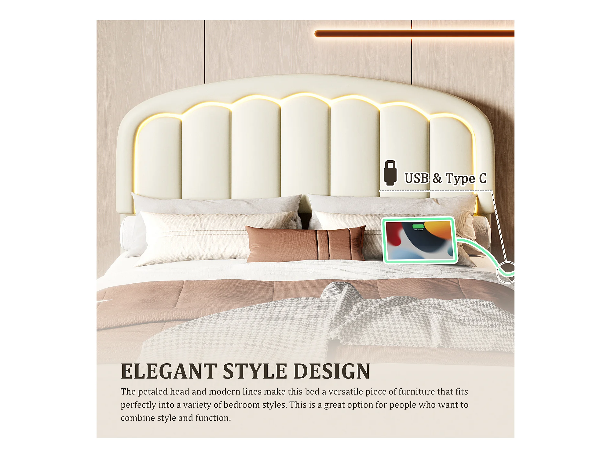Lit Coffre Rembourré 140×200 cm PU – Effet Flottant du Cadre - Tête de Lit Pétale - avec LED – Ports USB/USB‑C – Rangement sous Sommier – Style Contemporain