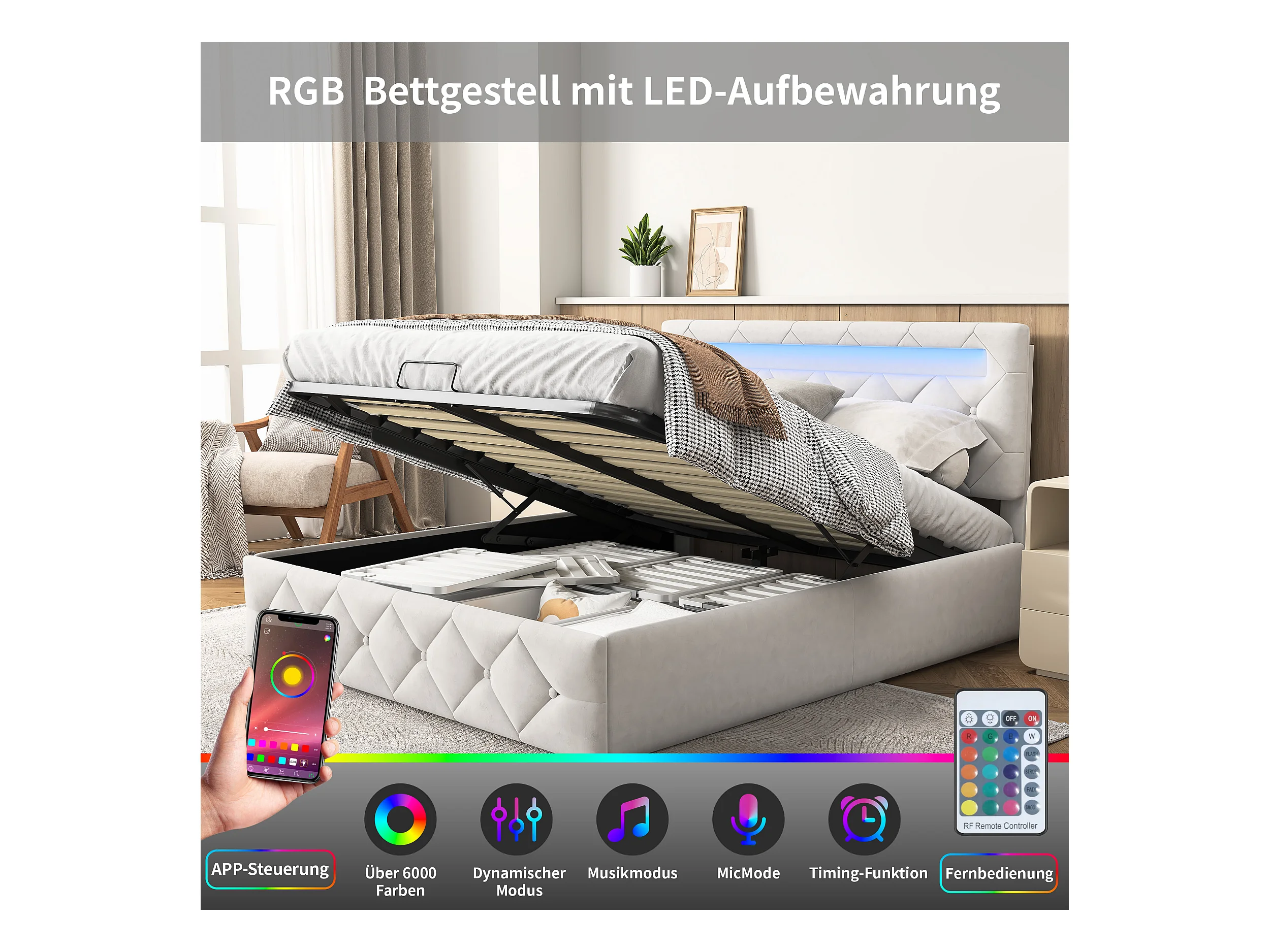 Lit 140x200cm avec LED - Sommier à Lattes - Grand Rangement - Tête de Lit Réglable - Beige