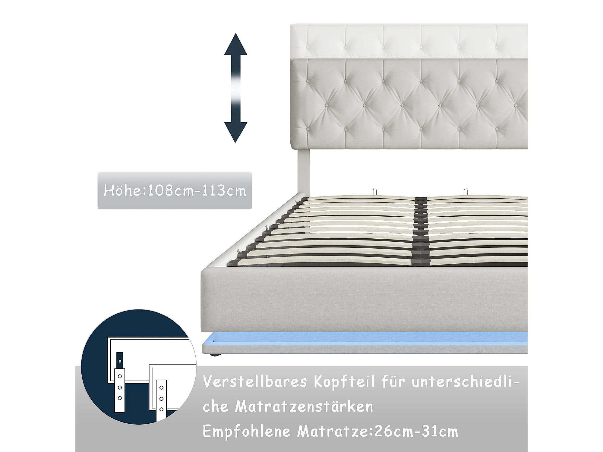 Lit 140x200cm - Espace de Rangement - Sommier à Lattes - Eéclairage LED et tête de lit relevable - Lin - Beige