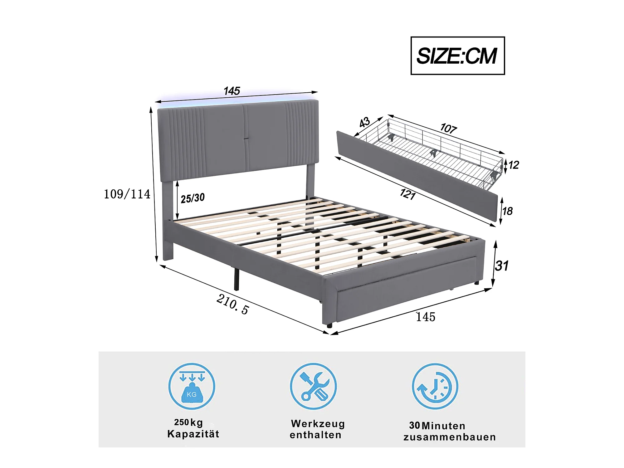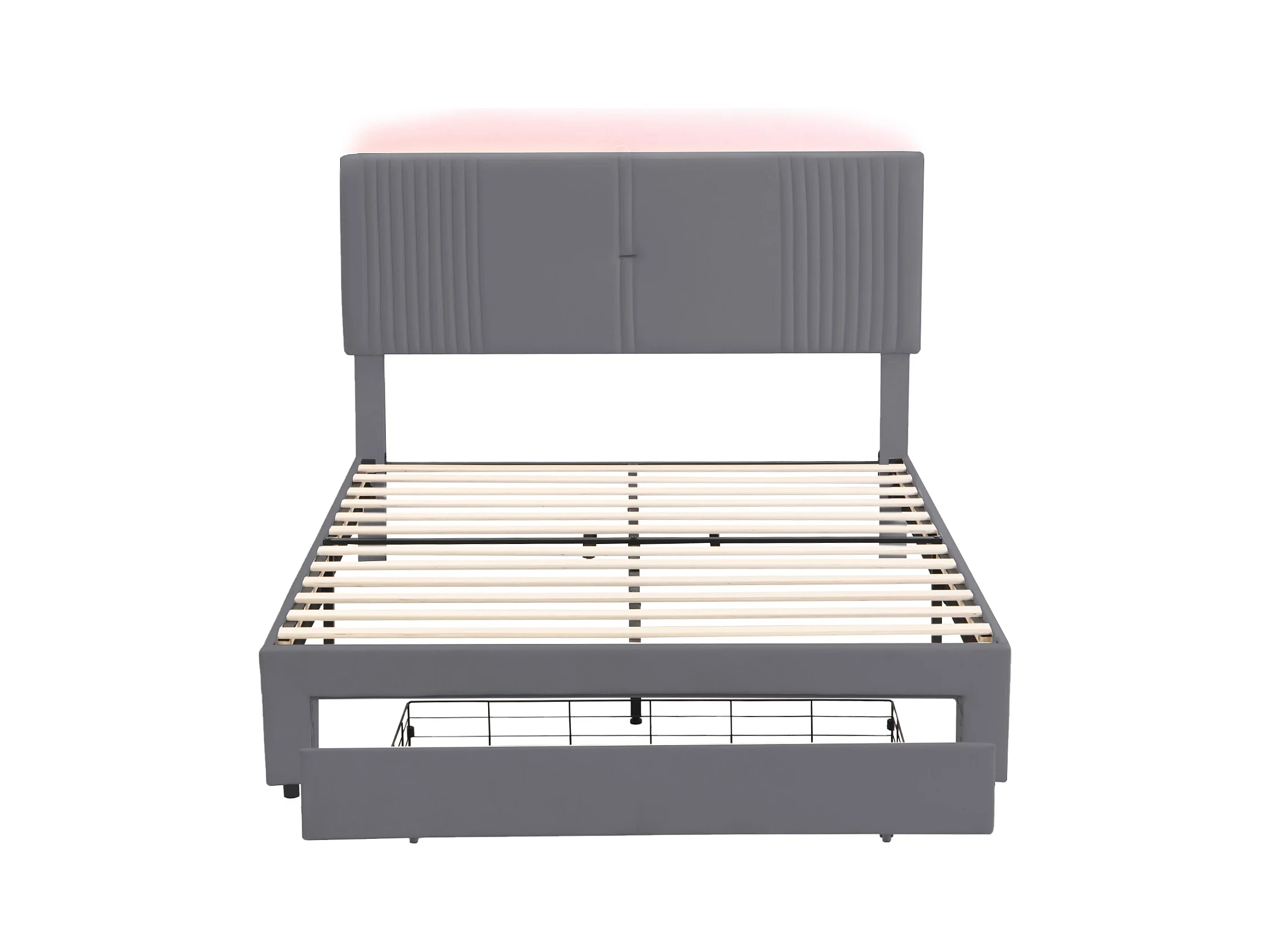 Lit 140x200cm gris, lit adulte double tiroirs de rangement,bande lumineuse + USB, velours, sans matelas
