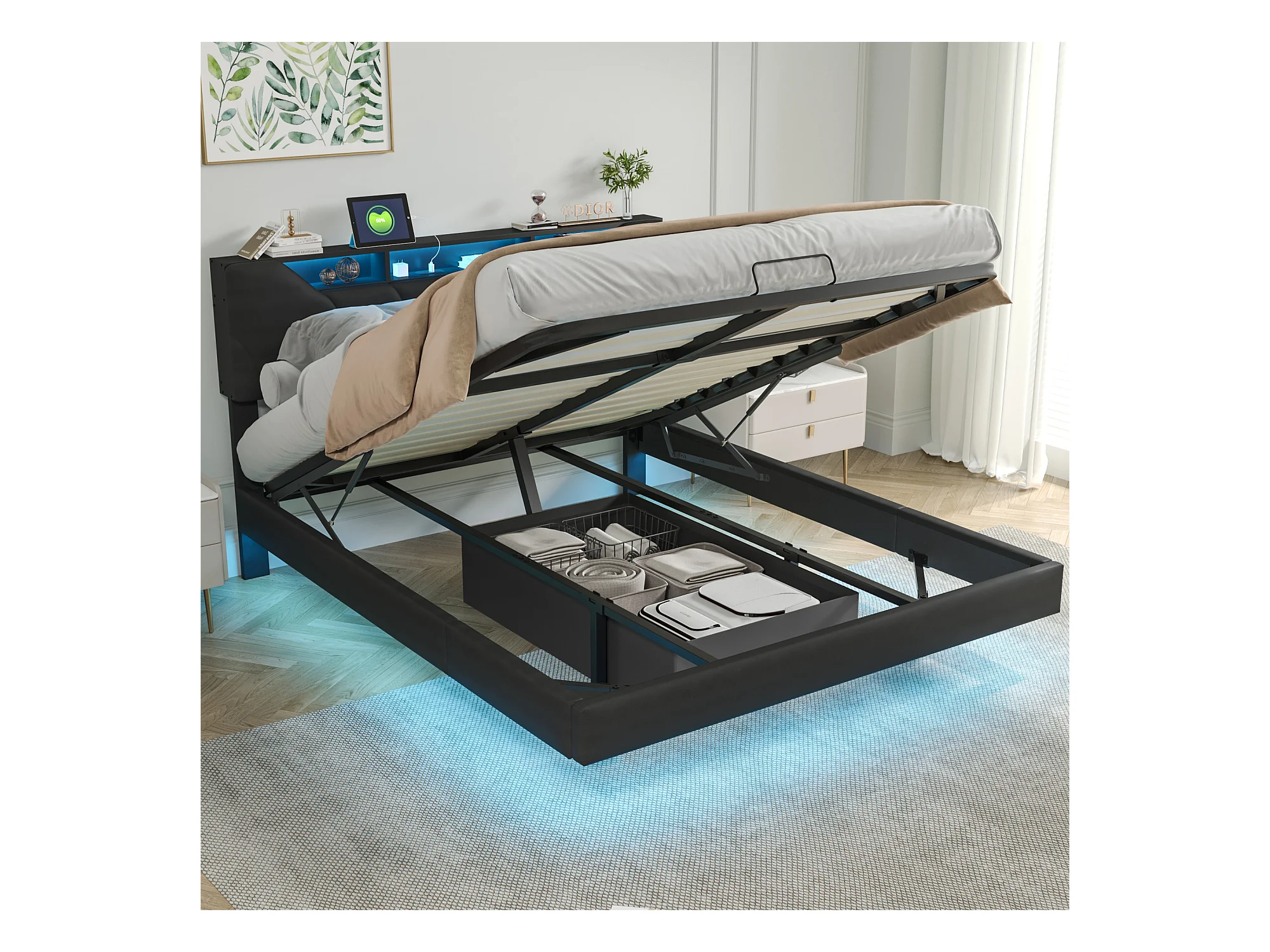 Lit 160x200 cm avec éclairage LED, Lit Coffre avec Port USB, tête de lit réglable en Hauteur, Noir