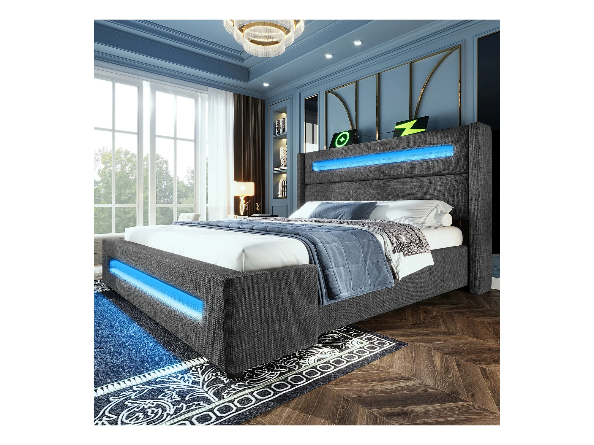 Lit 160x200 cm avec LED, stockage hydraulique, chargement USB Type-C, cadre métallique, lattes bois, lin gris (219x175x121 cm)