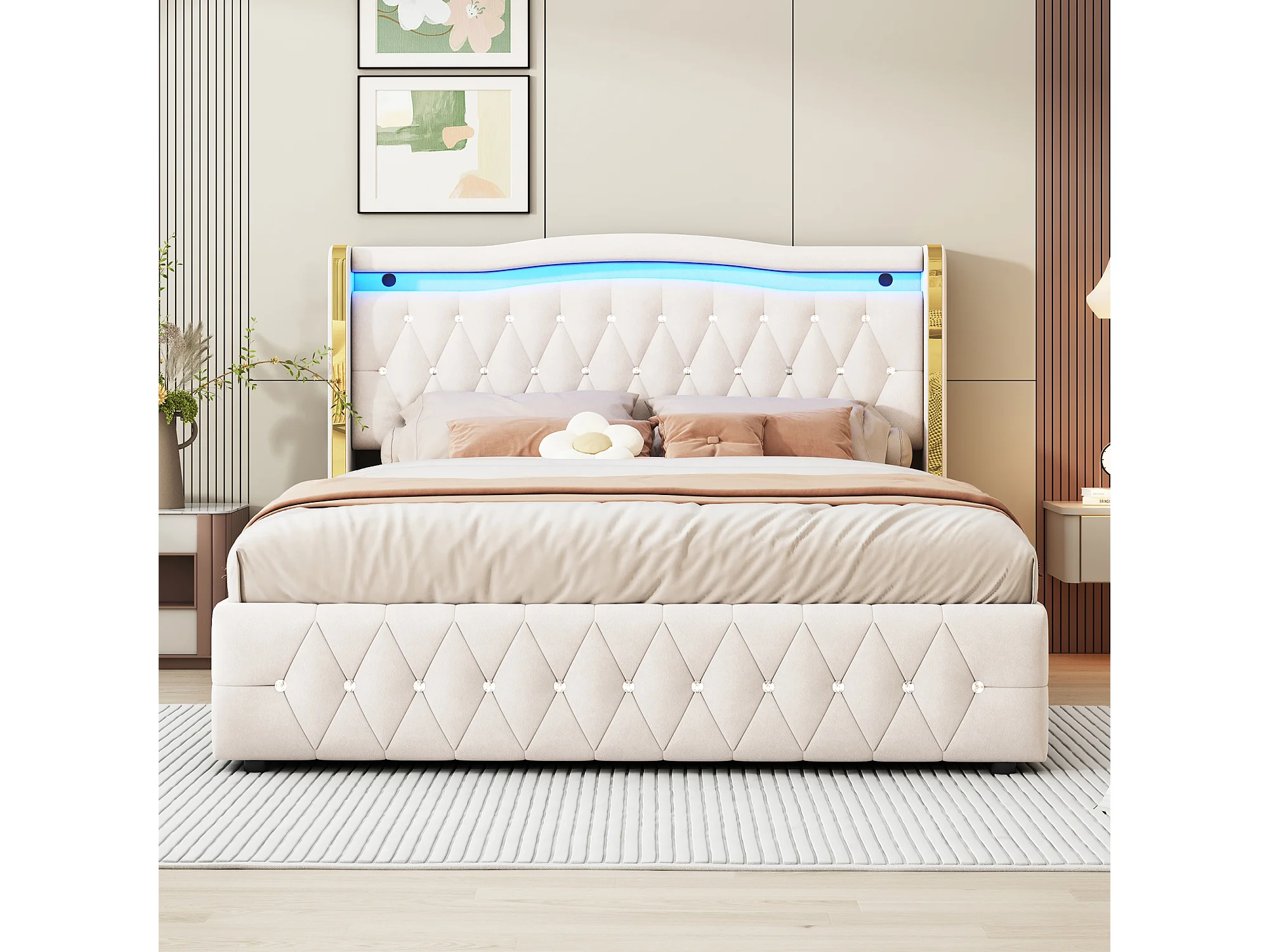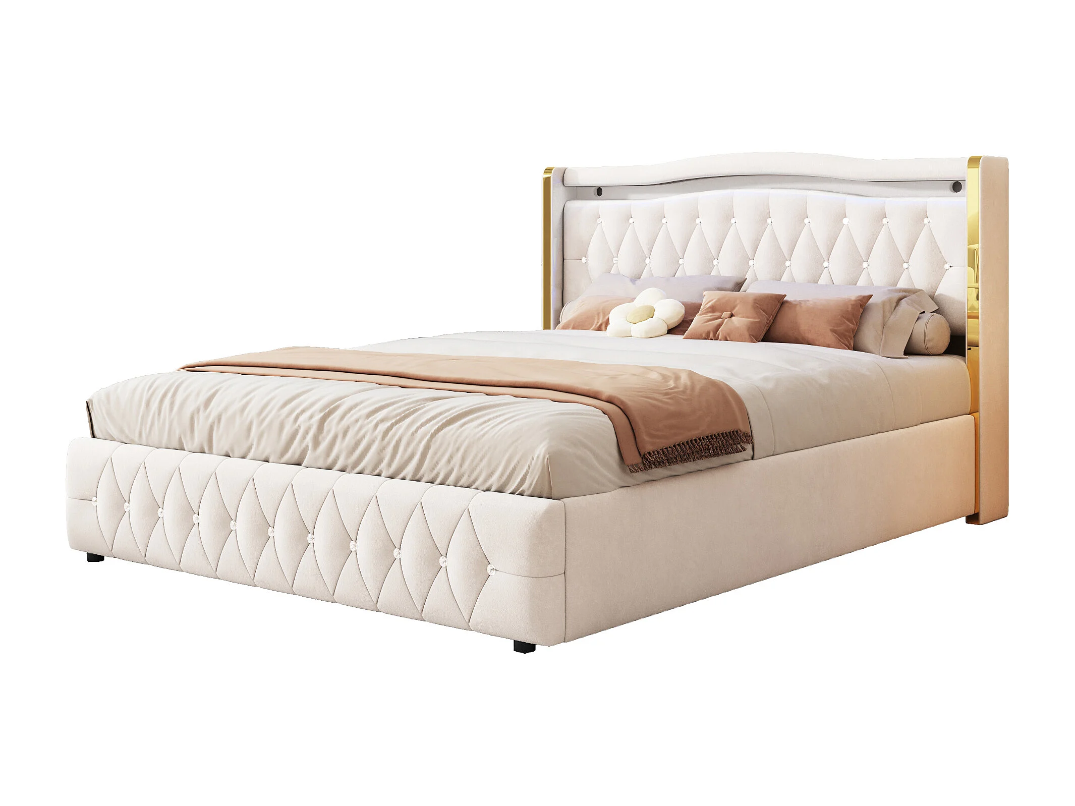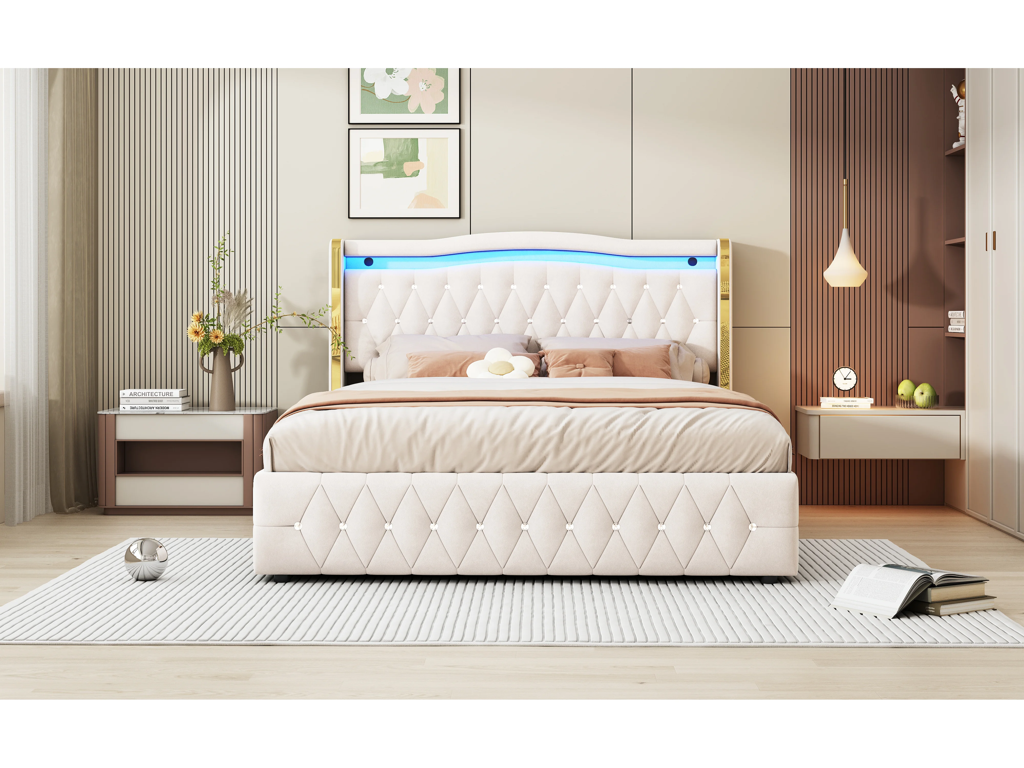 Lit 160x200 cm, LED avec rangement, hydraulique, tissu velours beige (213 x 168 x 109 cm)