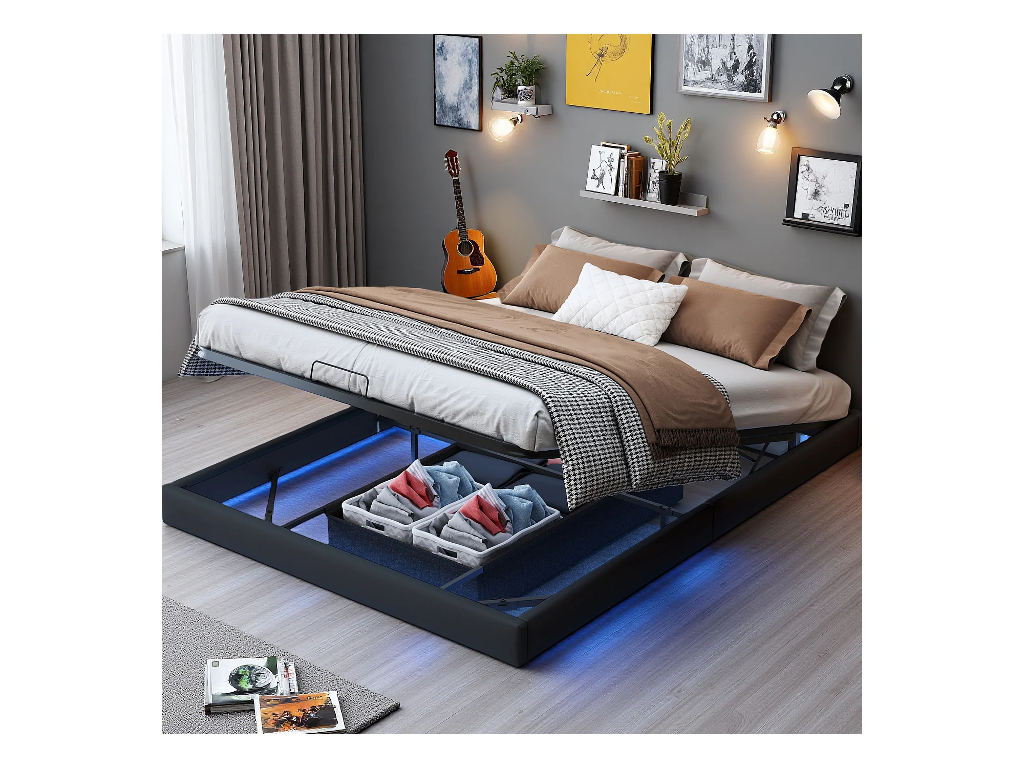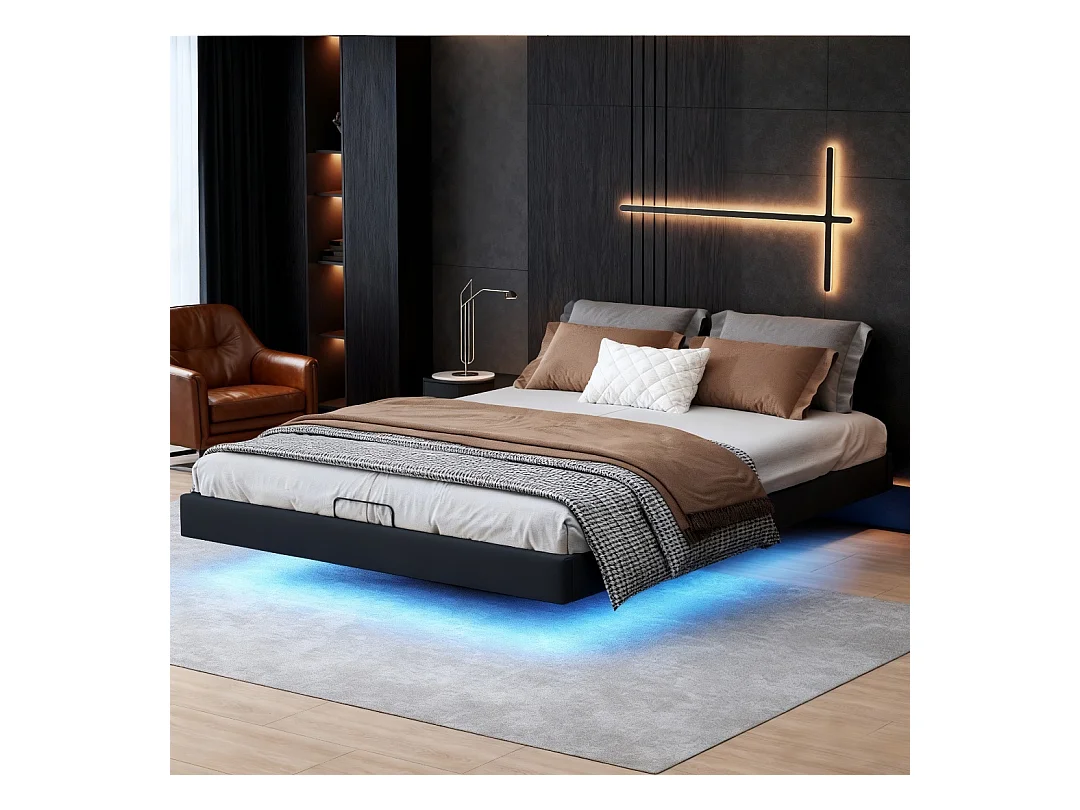 Lit 160x200 cm avec sommier à lattes - Led - lit flottant 160x200 cm - Lit double 160x200 coffre rangement soldes - lit adulte 160x200 cm tissu en PU - noir