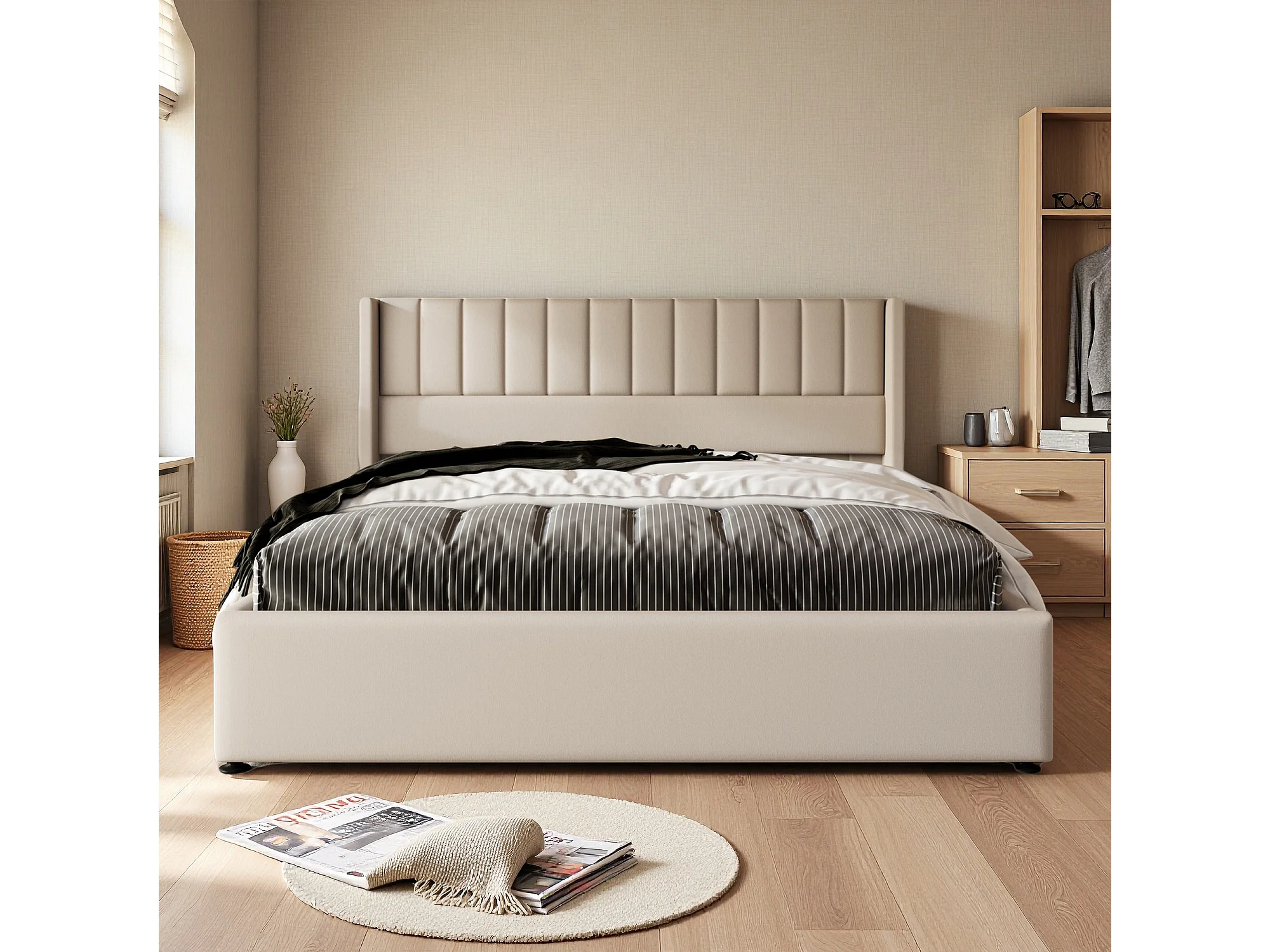 Lit adulte 160x200 cm - NEXU - hydraulique - tissu en lin - cadre de lit coffre 160x200 cm avec sommier à lattes - beige