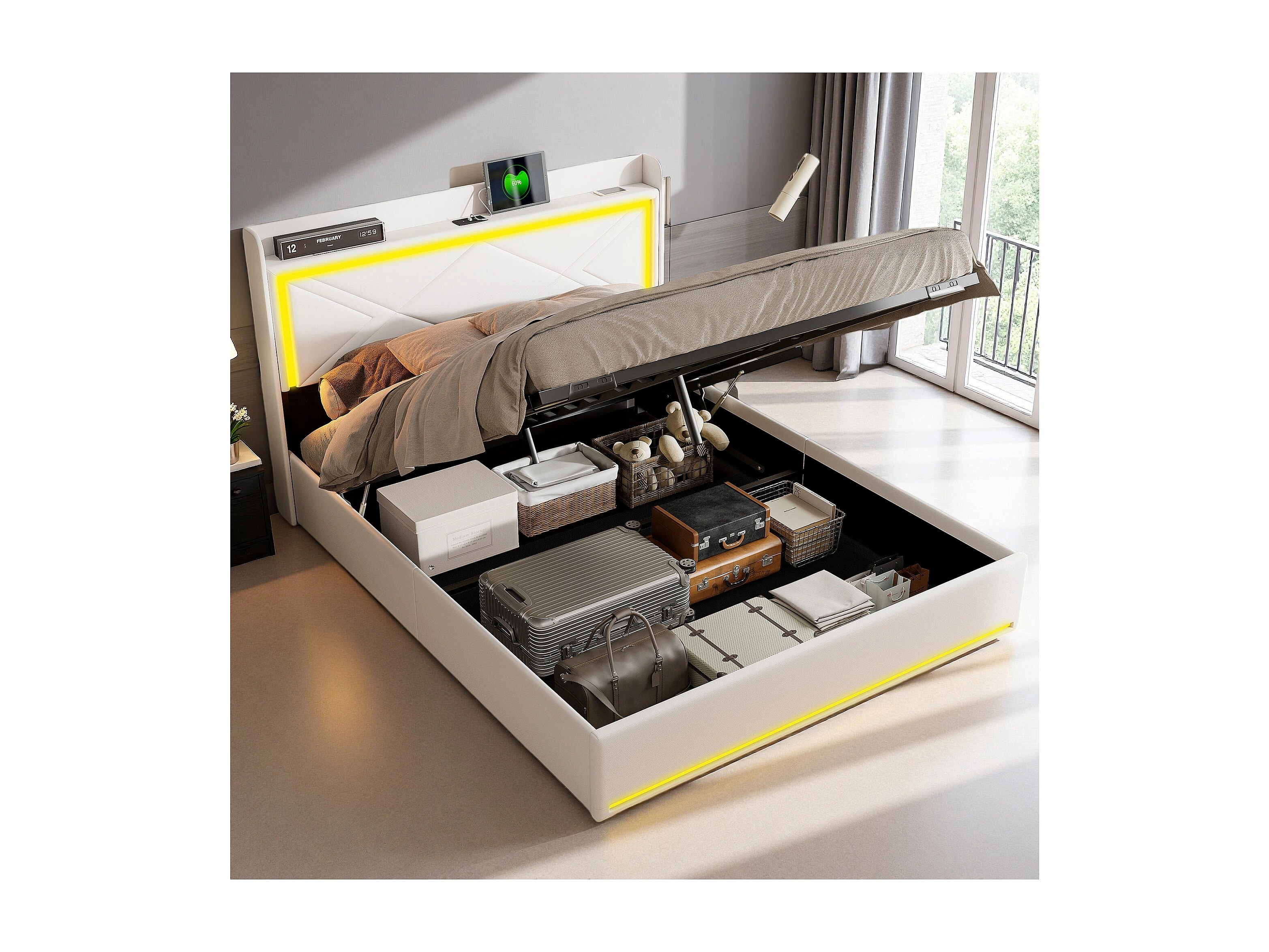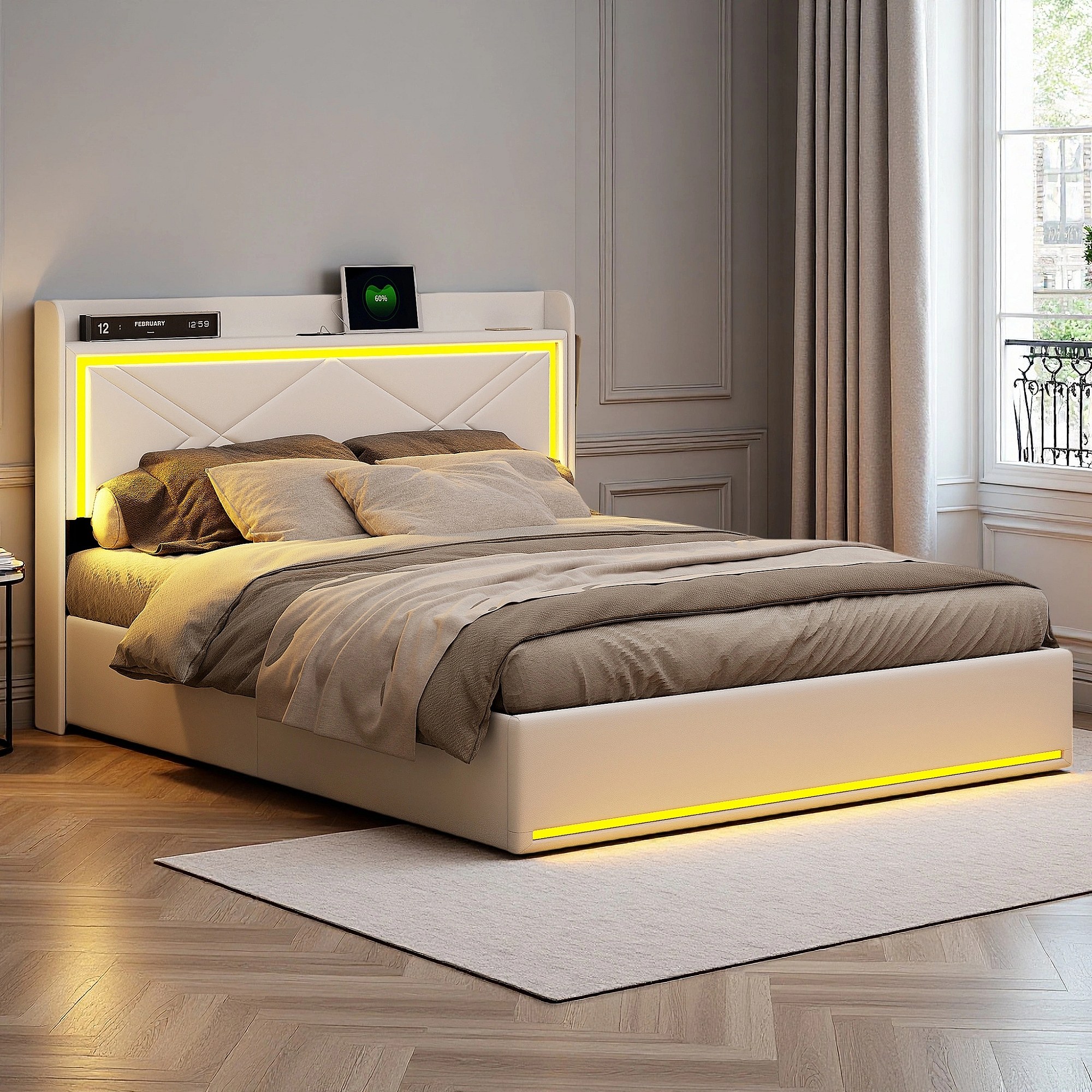 Lit 160x200 cm - NEXU - LED - USB - lit 160x200 cm tissu en PU - ccadre de lit coffre 160x200 cm - blanc